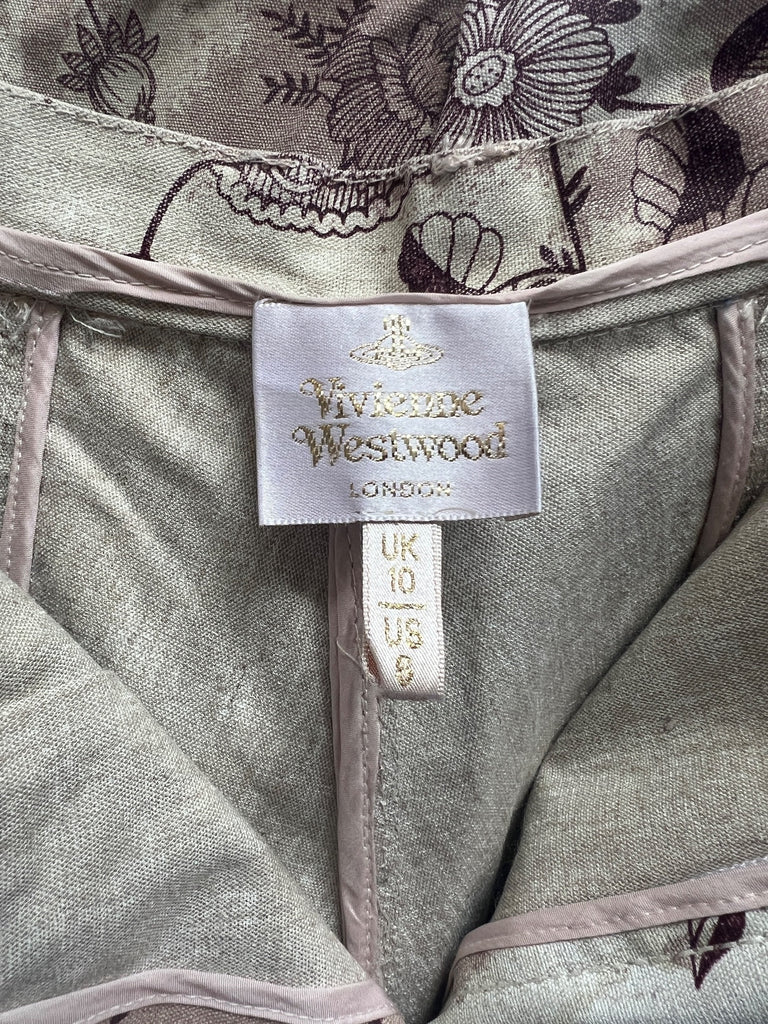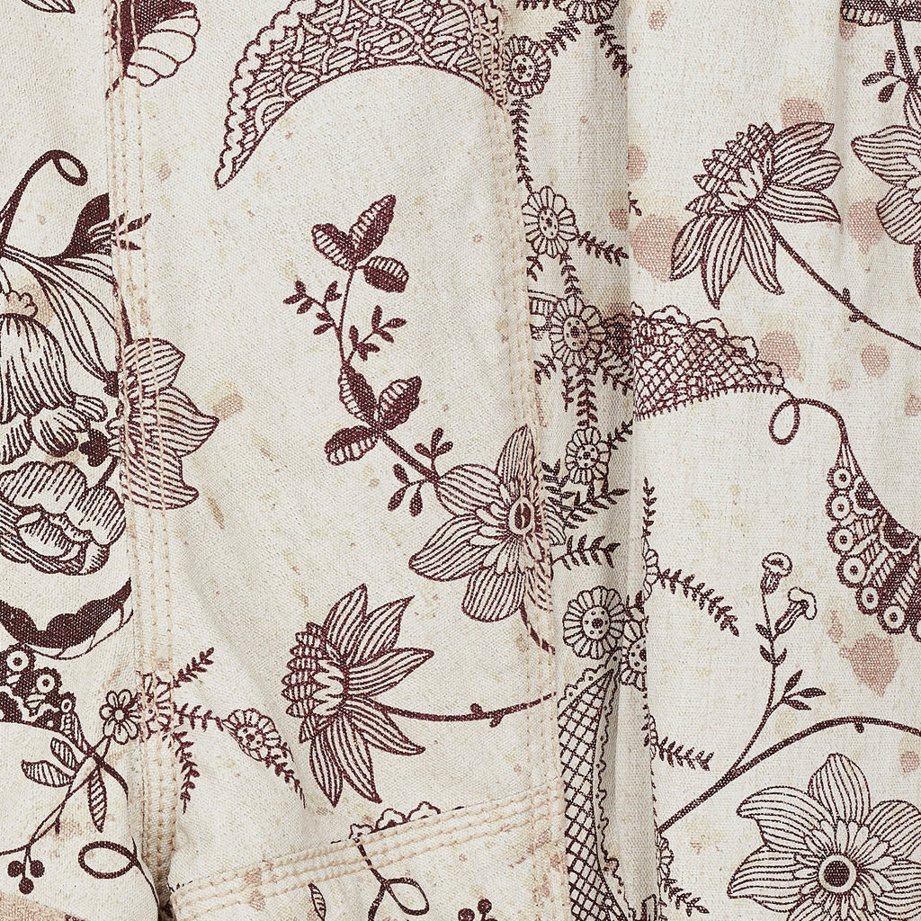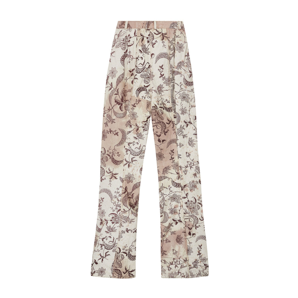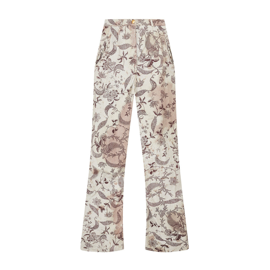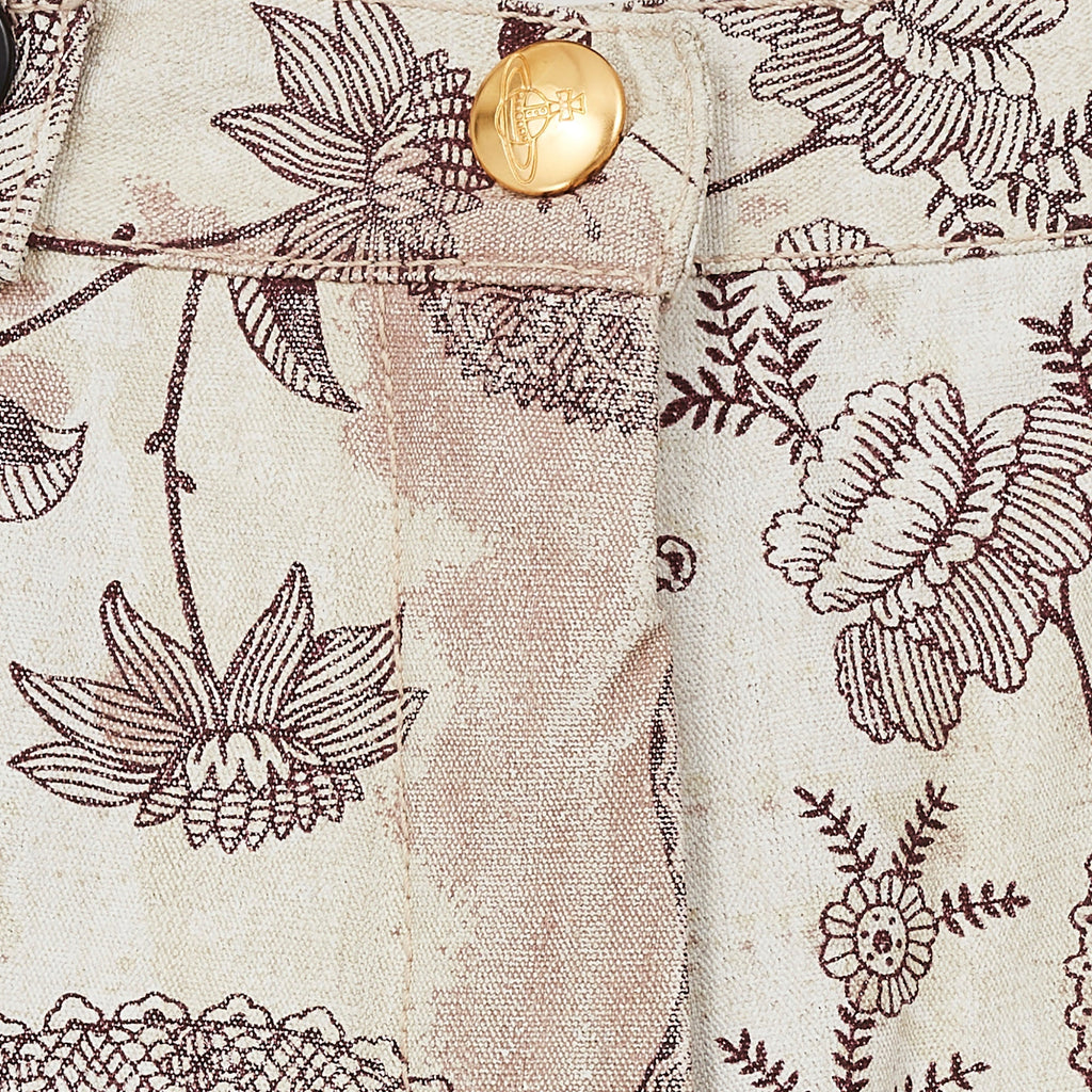 These trousers are an iconic piece of Vivienne Westwood trophy vintage and would be a great addition to the archive of any collector of this label. Made in Italy, they are tailored from coated linen with a stiff, waterproof effect and a canvas-like handle. The print is taken from an Elizabethan wallpaper design. Rendered in a deep aubergine purple, it shows winding, interlaced vines and fantastical florals. Faded burgundy stains smatter the pale ecru background of the cloth, as though the wearer has spilled glass-upon-glass of red wine whilst dancing. These trousers are cut to an extra-long length and are gathered in an erratic manner at the bottom hems so that they pool at the floor around the feet in the deconstructed way that is the brand’s trademark. The waist is narrow and is secured with a hidden white zip and a gold button engraved with Vivienne Westwood’s instantly-recognisable Orb logo. There are slip pockets in the side seams and all of the stitching is in pale pink cotton. They are unlined.