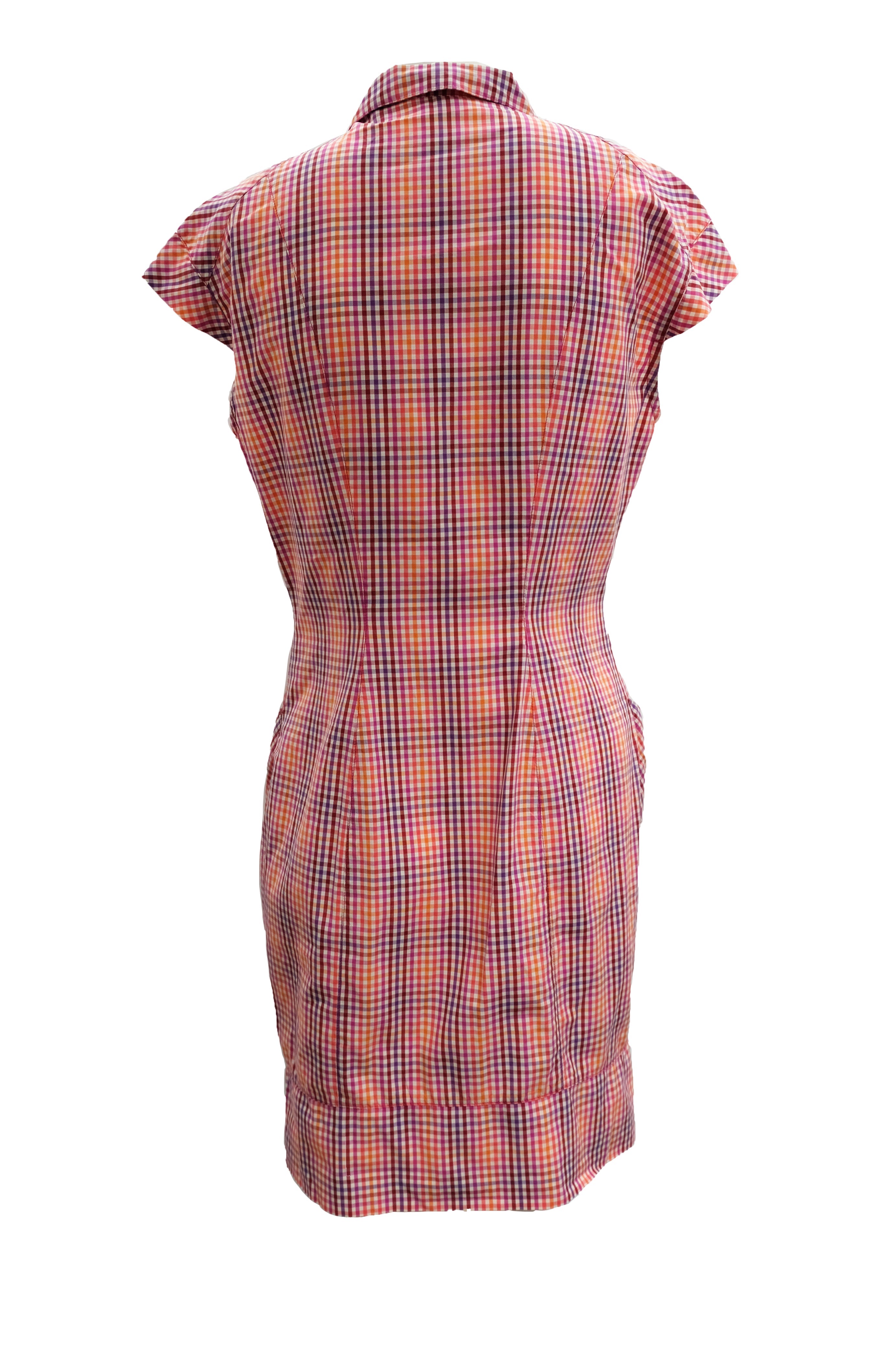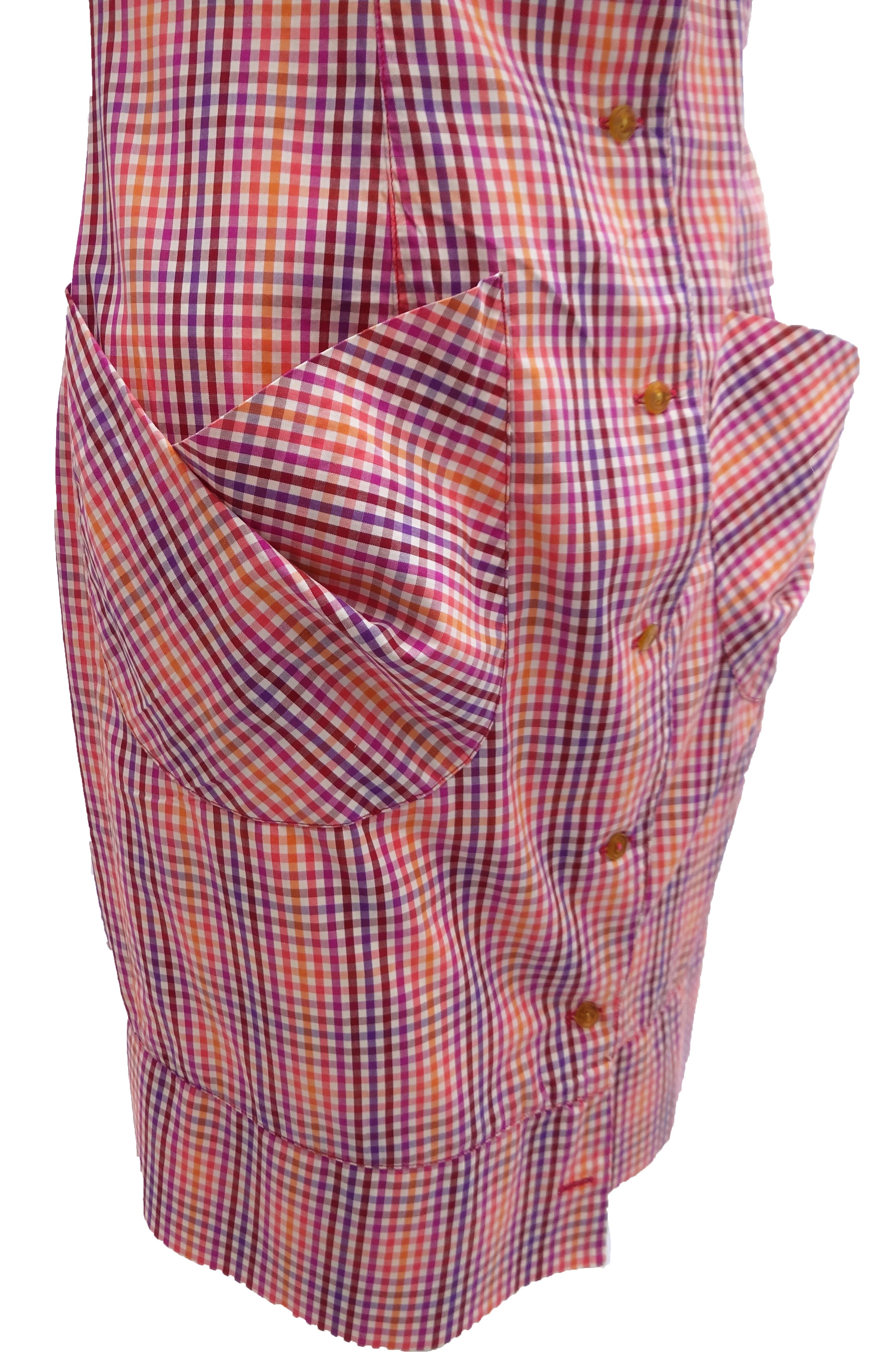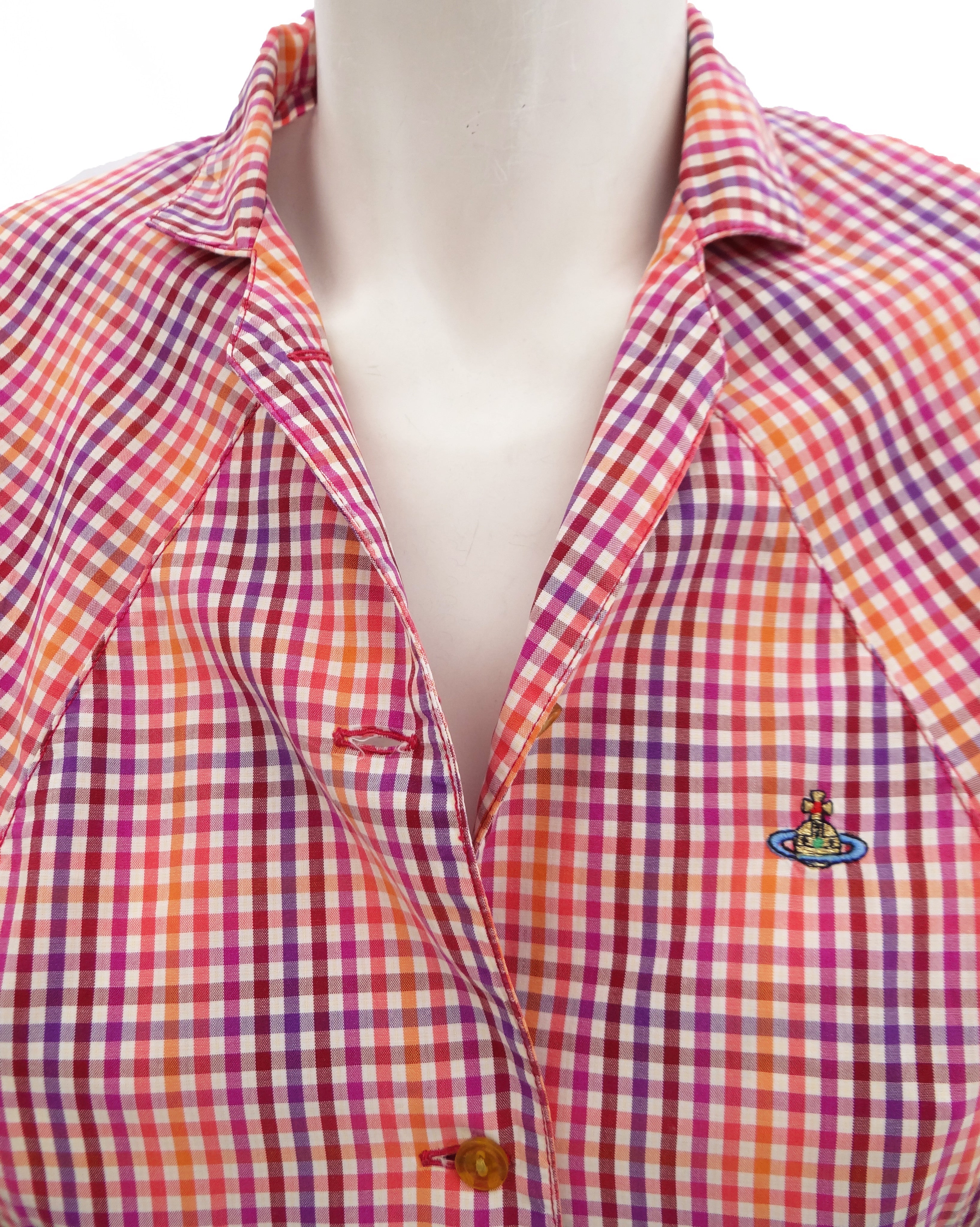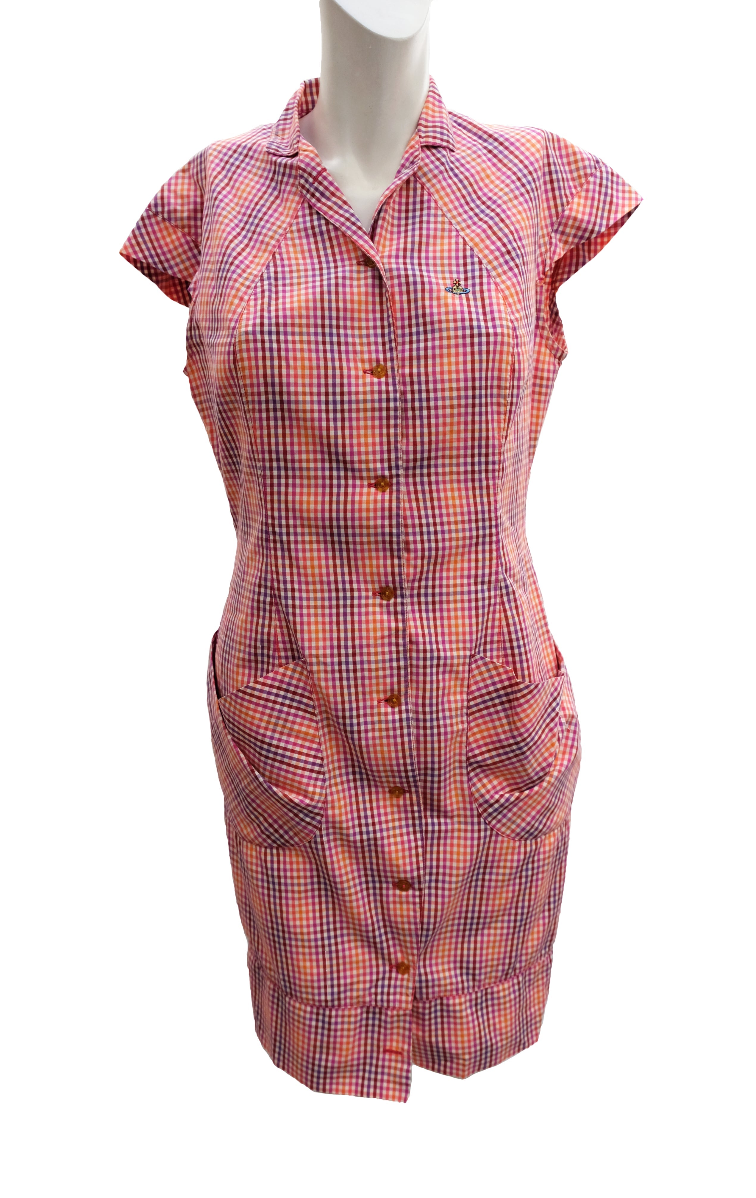 A gorgeous vintage shirt dress in pink, orange, and purple checked shirting cotton by Vivienne Westwood Red Label, c.1995.  The dress has slightly dropped cap sleeves, a narrow collar and buttons all the way down the front.   There is a wide cuffed hem just above the knee, and folded patch pockets. A fantastic summer dress.