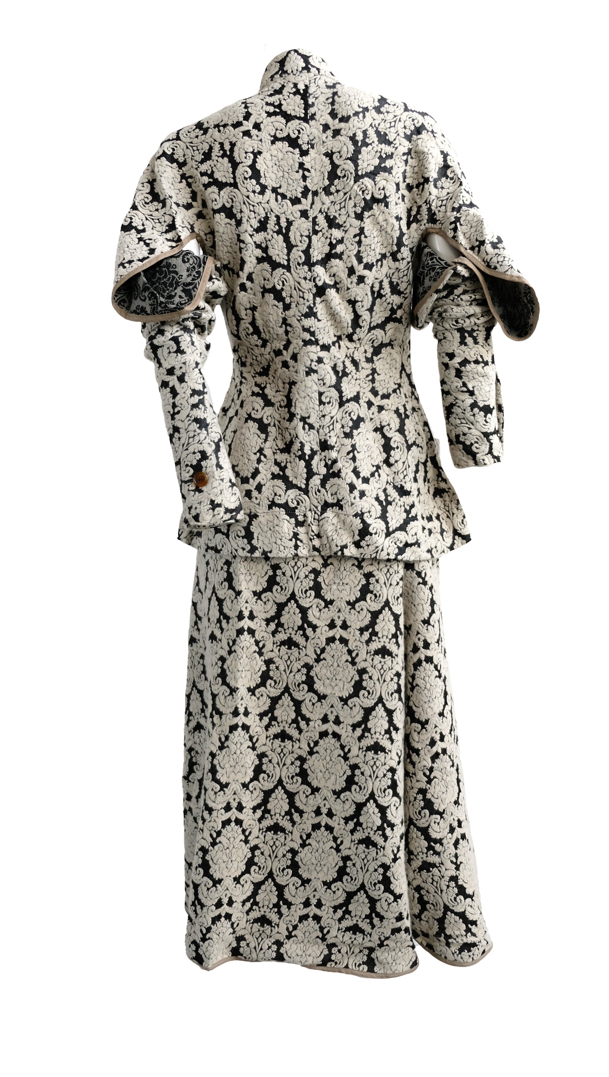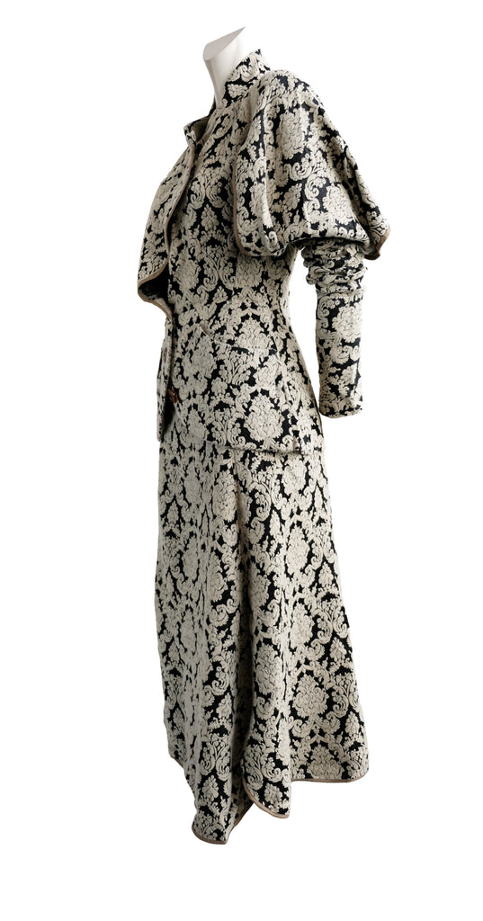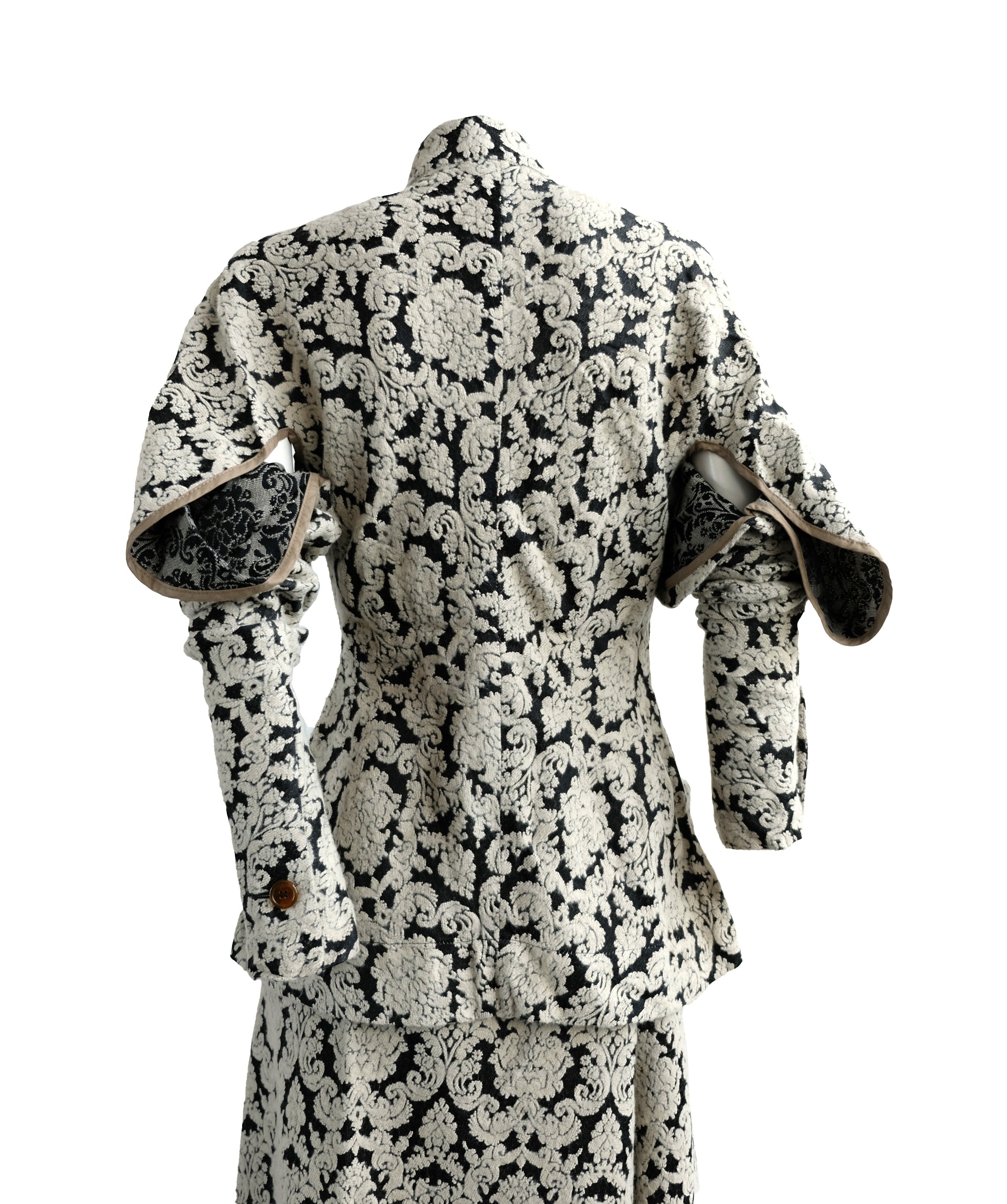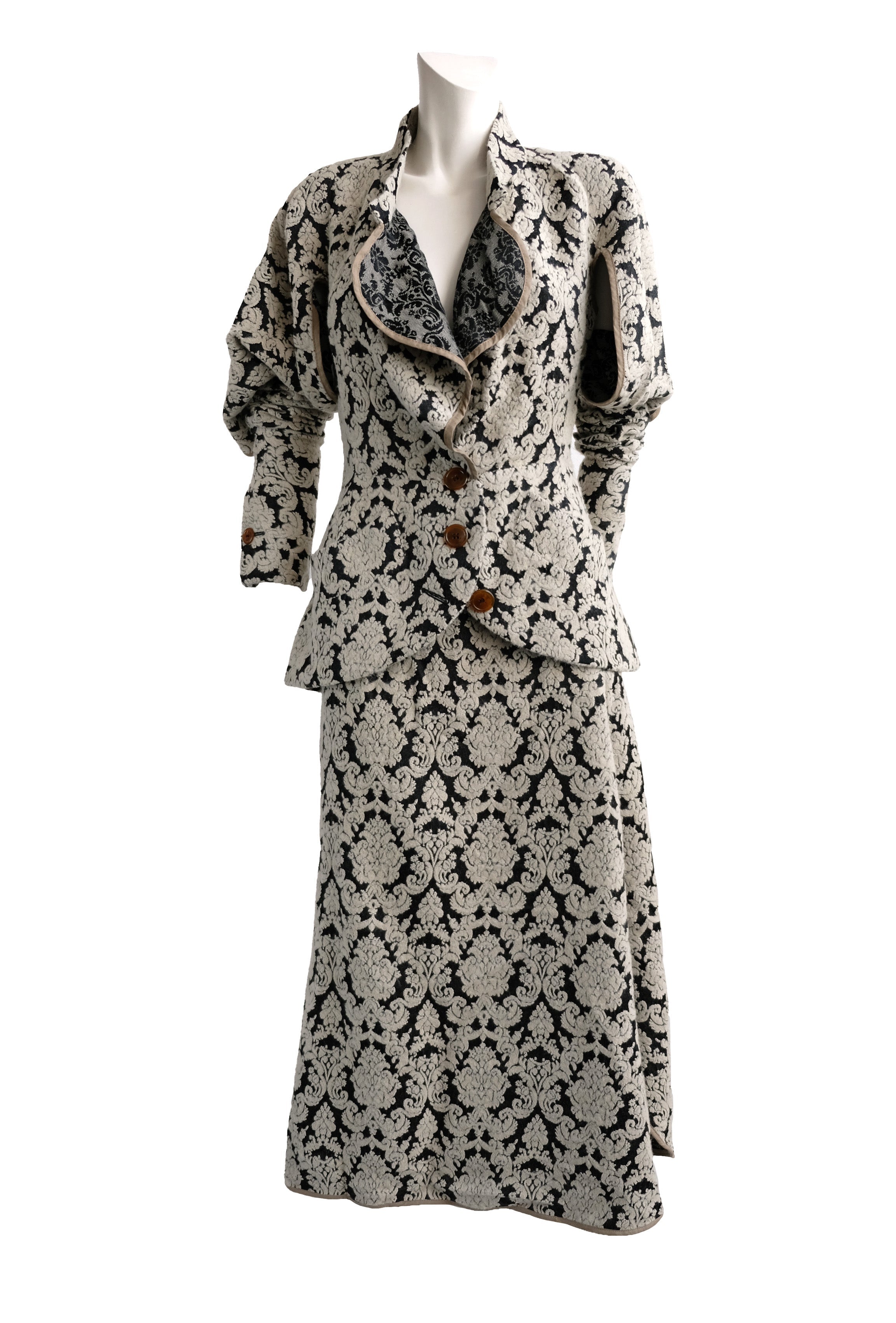 An incredible 1990s vintage skirt suit by Vivienne Westwood, in black and white flocked wool mix fabric.  Thought to be from her AW 1997-98 Renaissance inspired "Five Centuries Ago" collection.