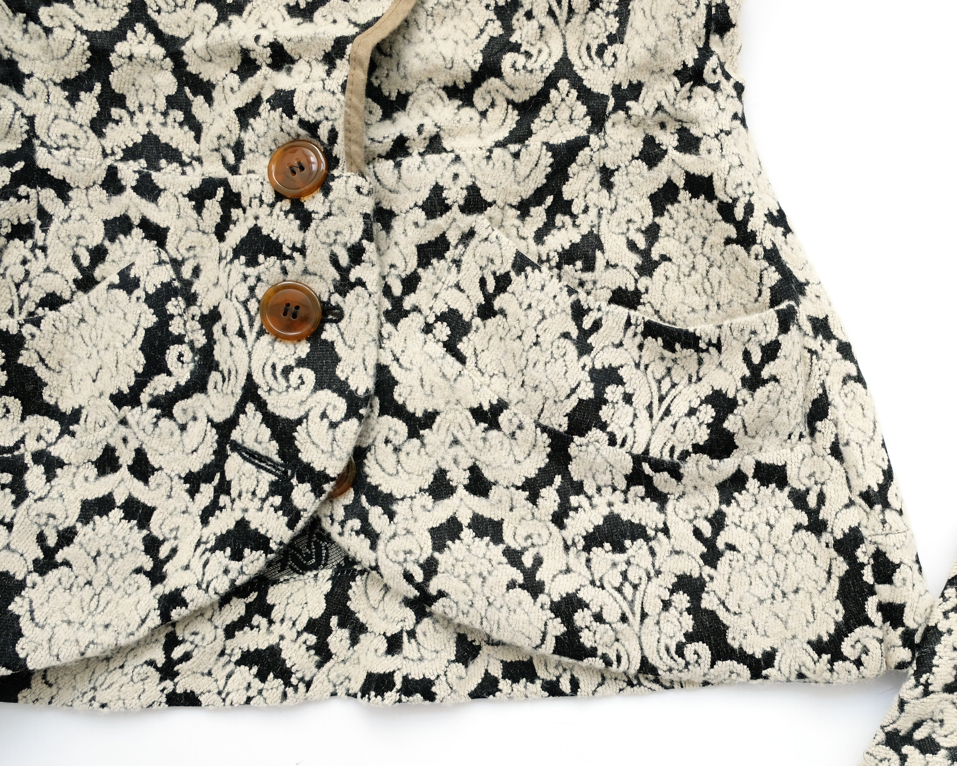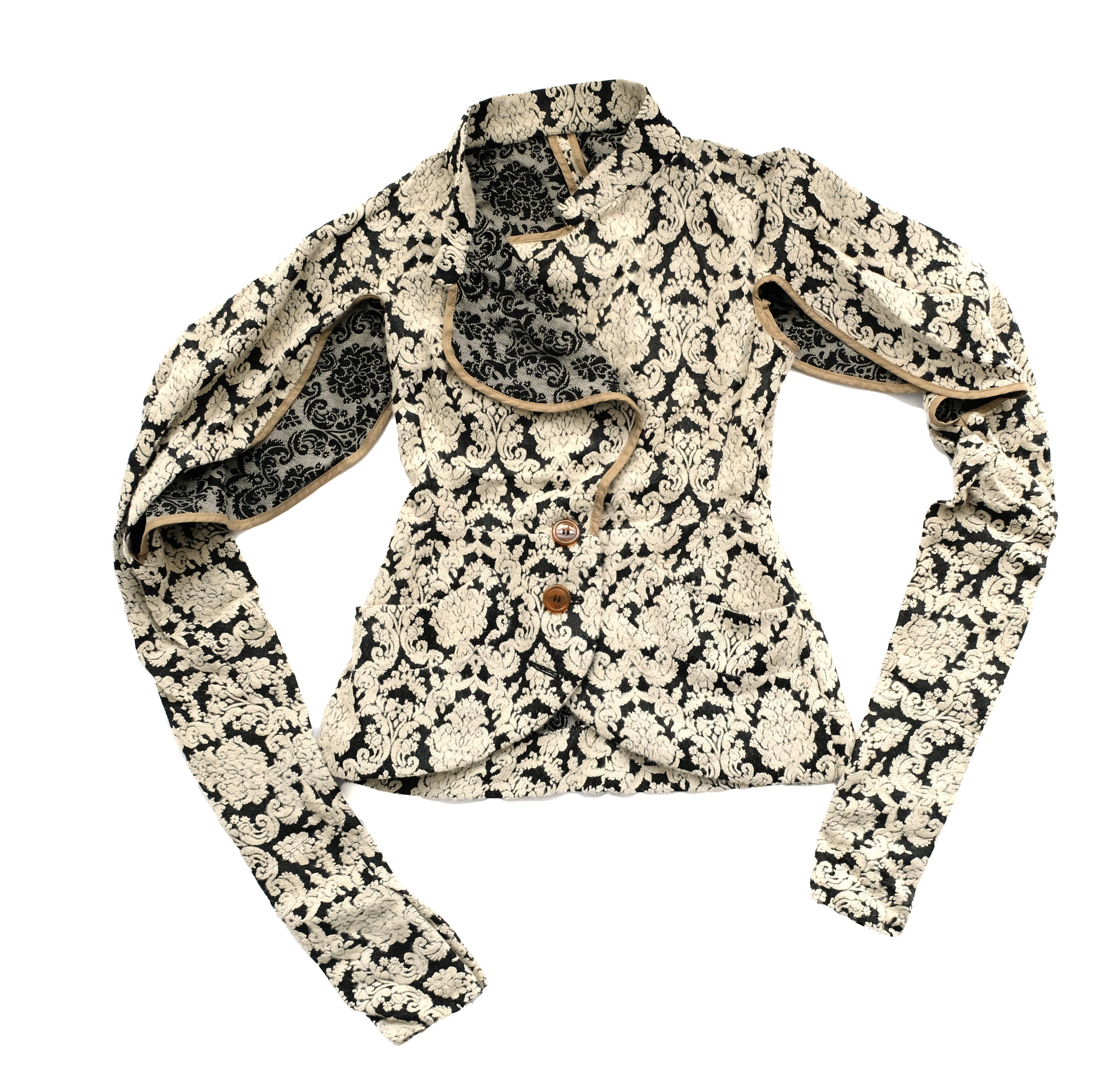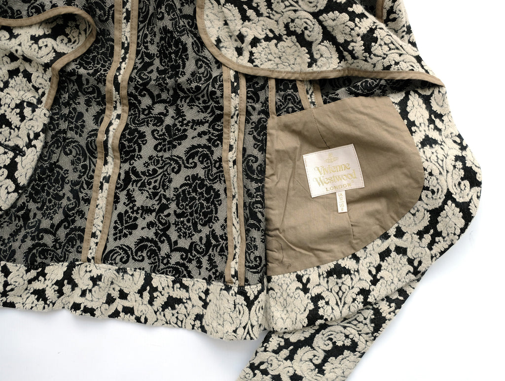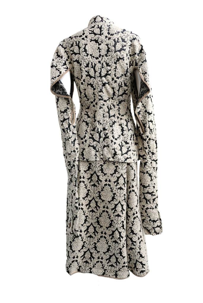 An incredible 1990s vintage skirt suit by Vivienne Westwood, in black and white flocked wool mix fabric.  Thought to be from her AW 1997-98 Renaissance inspired "Five Centuries Ago" collection.