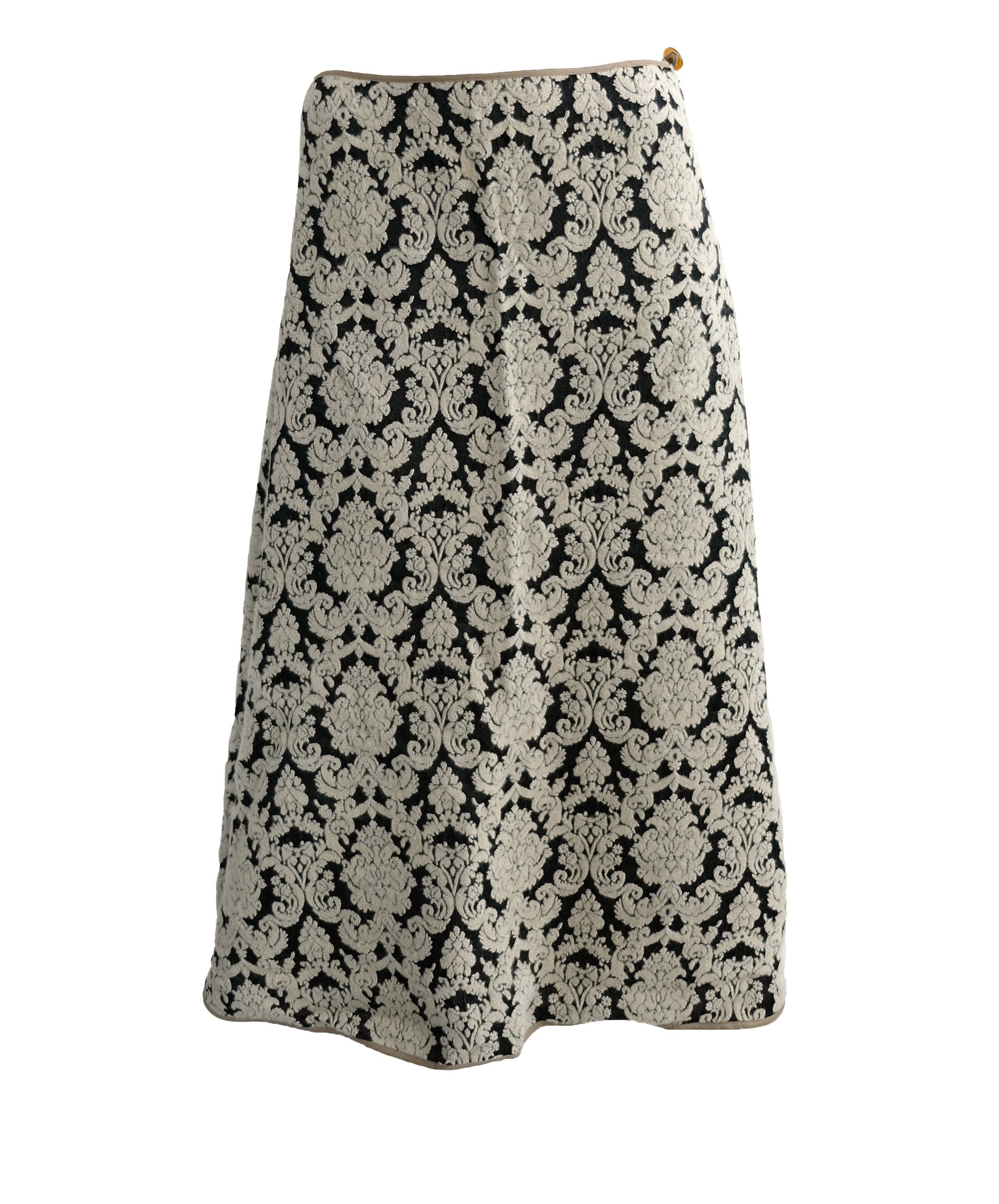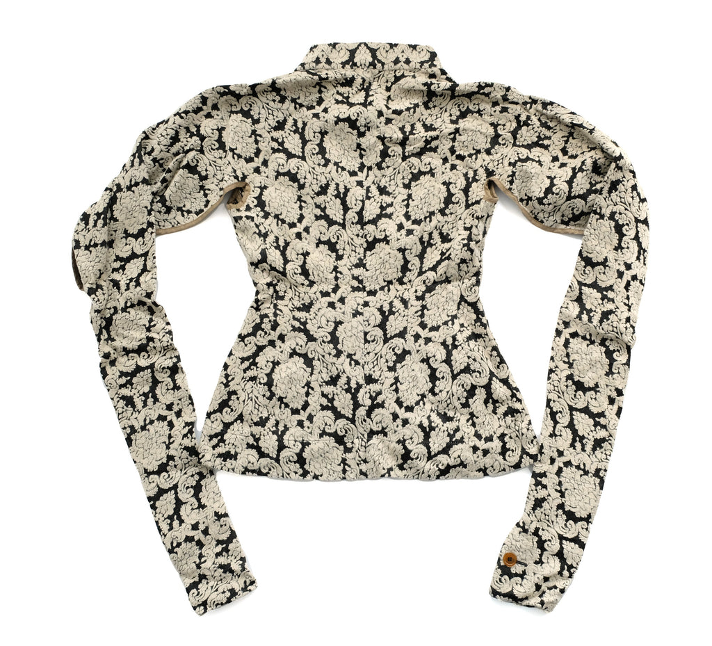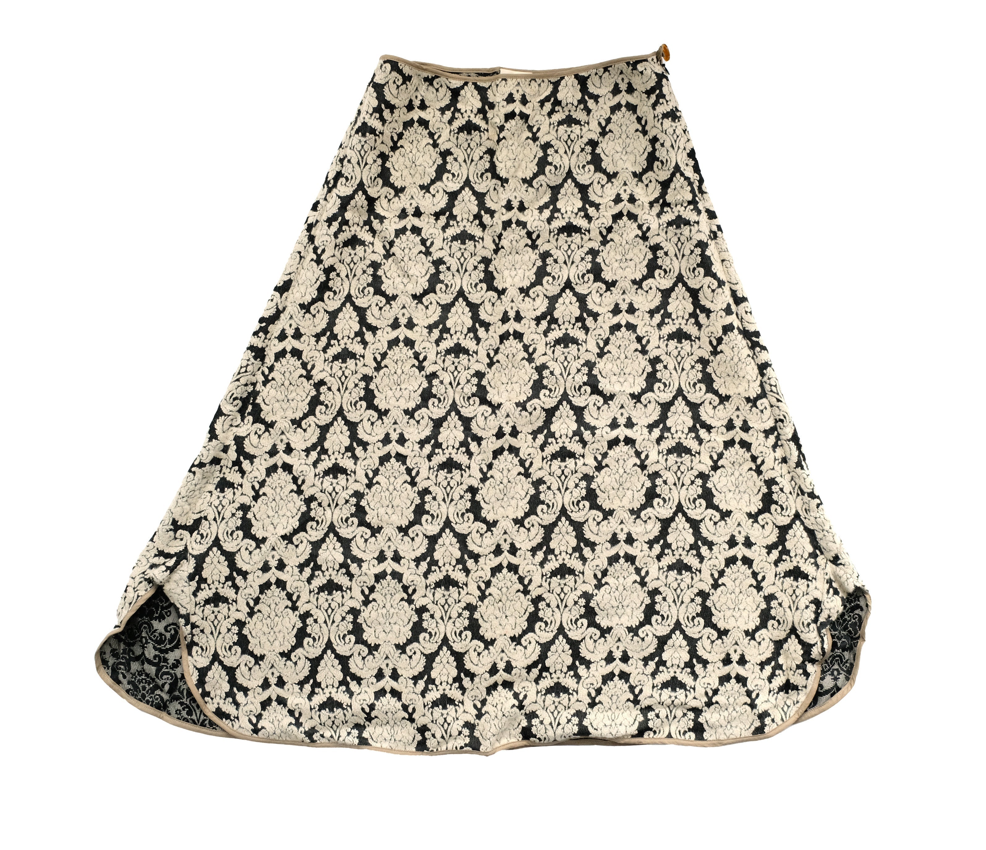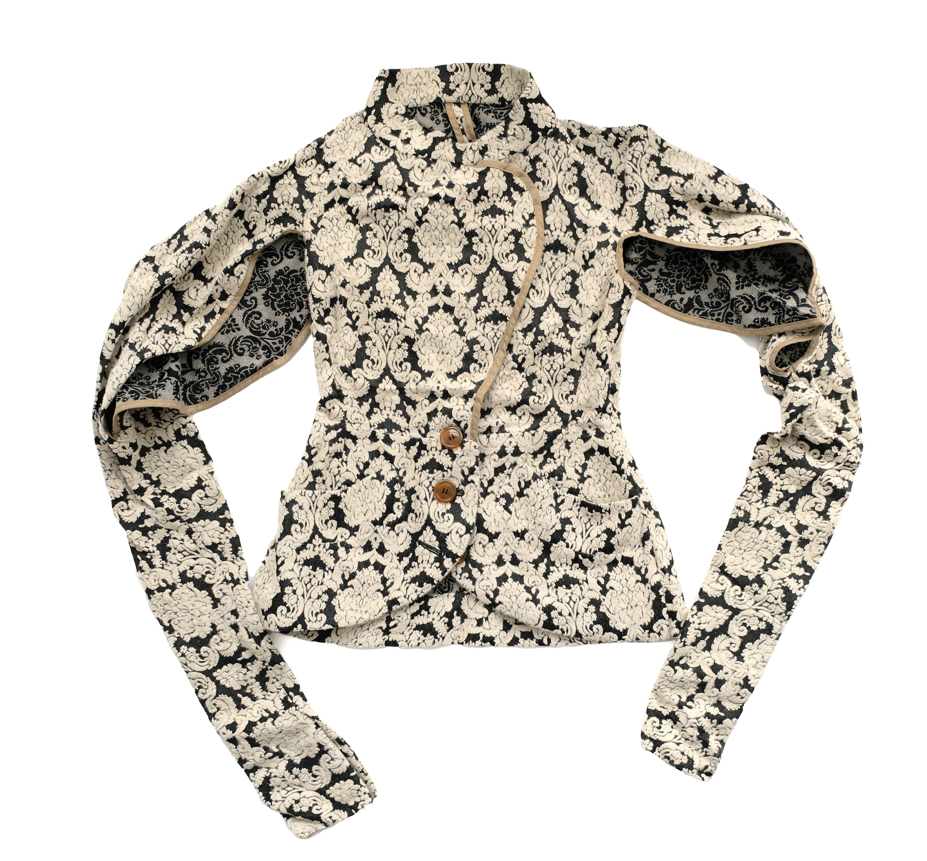 An incredible 1990s vintage skirt suit by Vivienne Westwood, in black and white flocked wool mix fabric.  Thought to be from her AW 1997-98 Renaissance inspired "Five Centuries Ago" collection.
