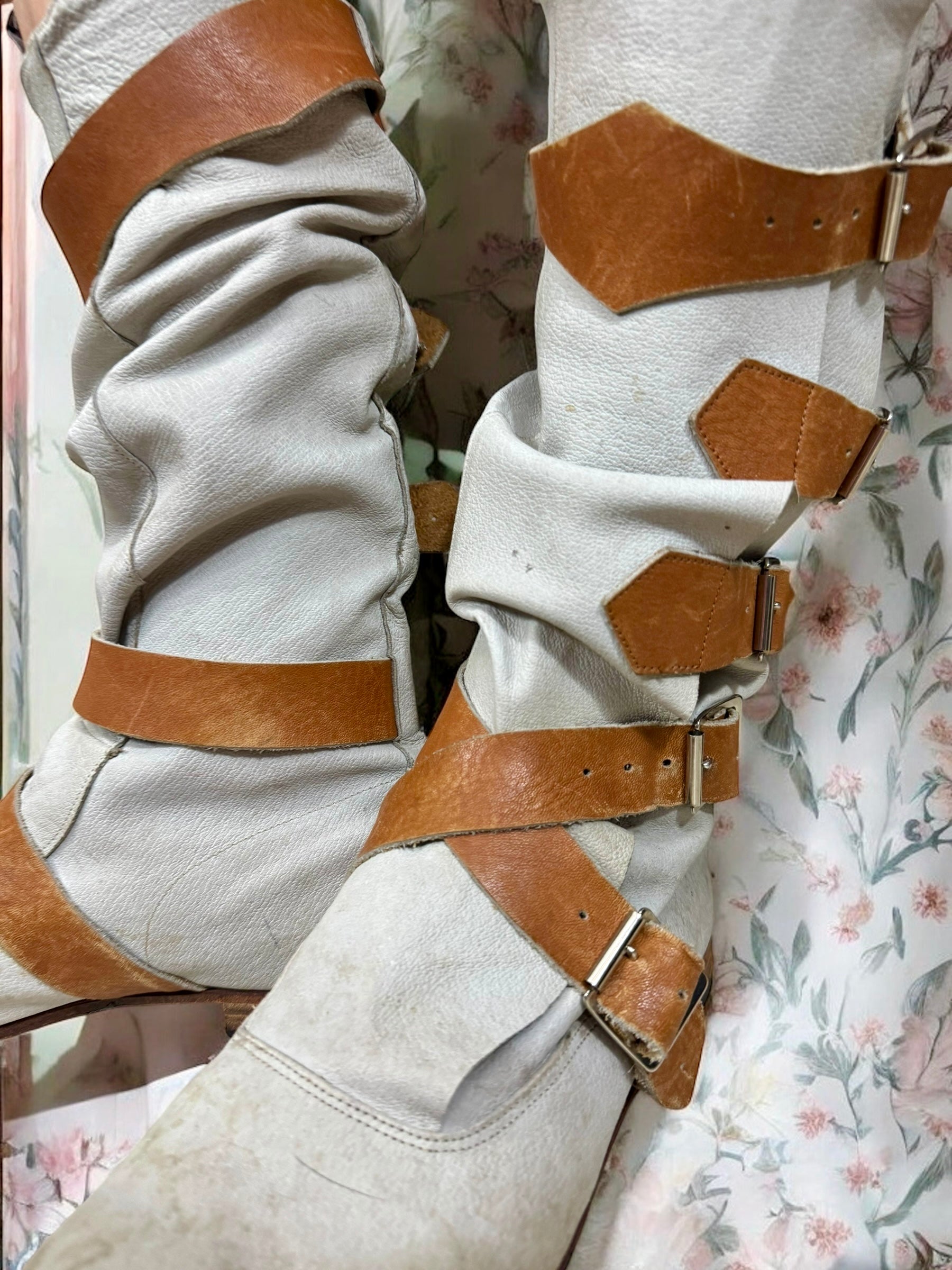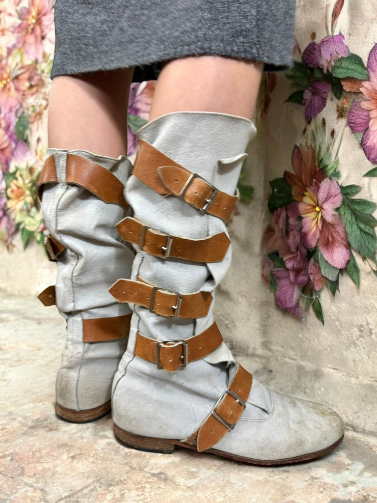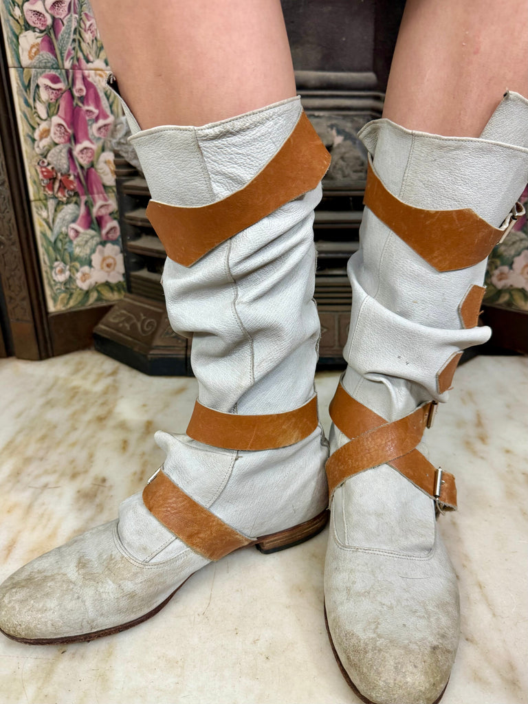 The Vivienne Westwood First Run Pirate boots are iconic and rare, making them a must-have for any collector or Vivienne Westwood fan. Crafted in grey leather with tan leather straps and leather soles, these boots showcase the brand's timeless design. In good vintage condition, they feature just the right amount of aging marks for an authentic look.