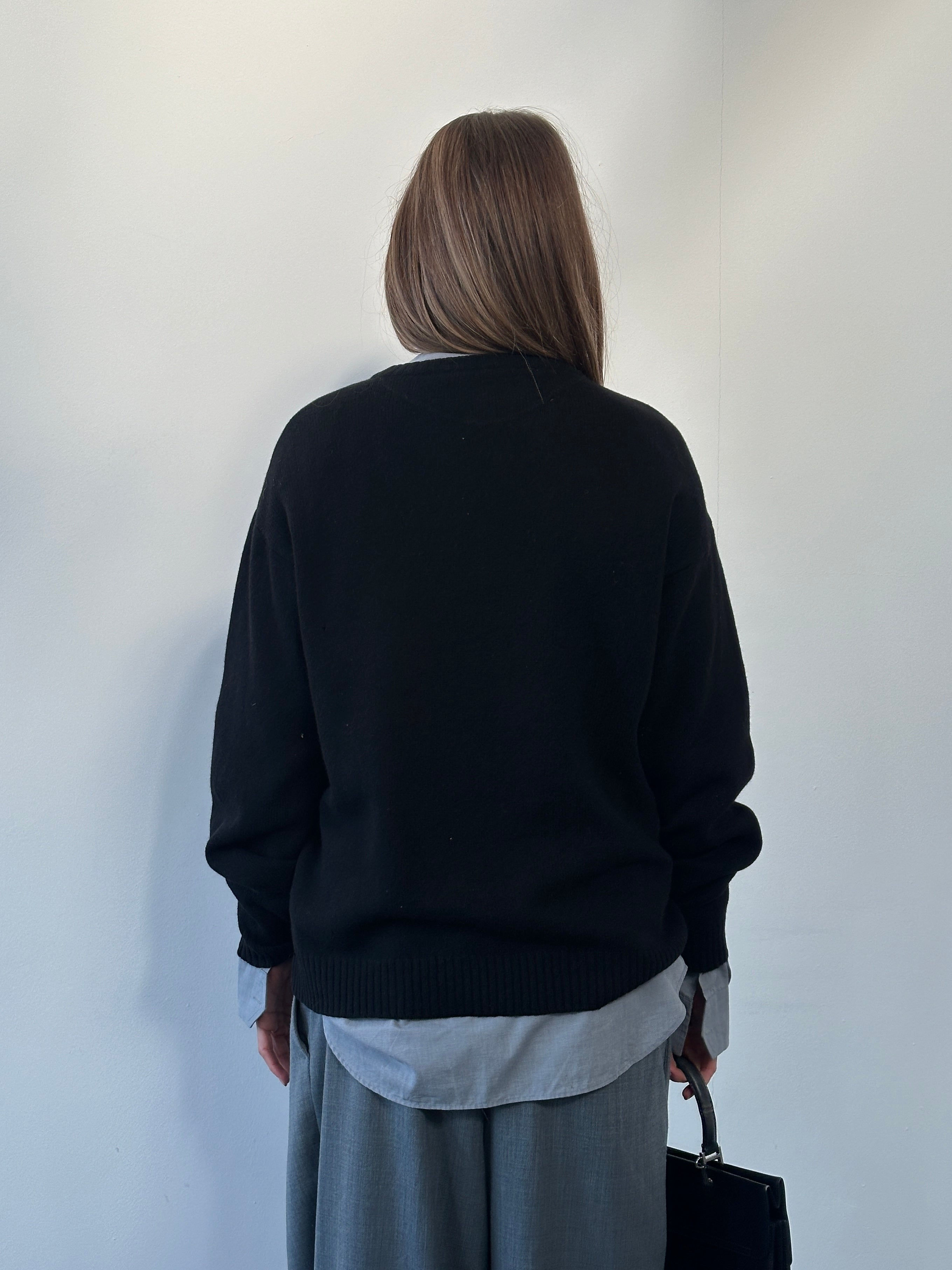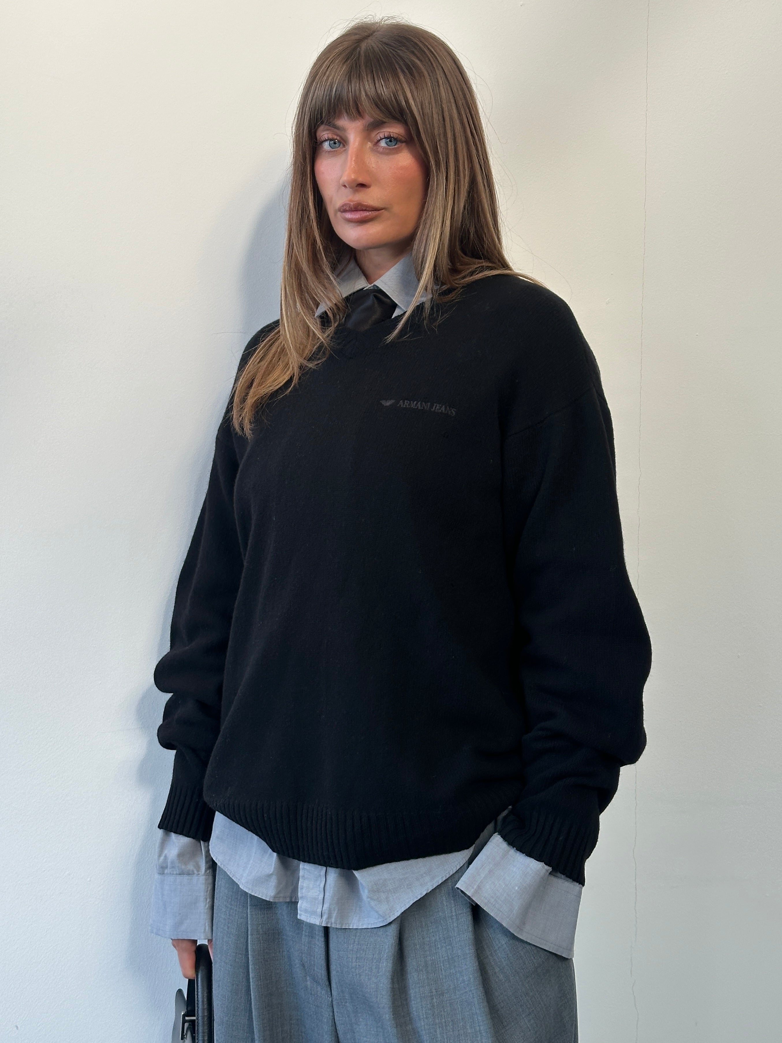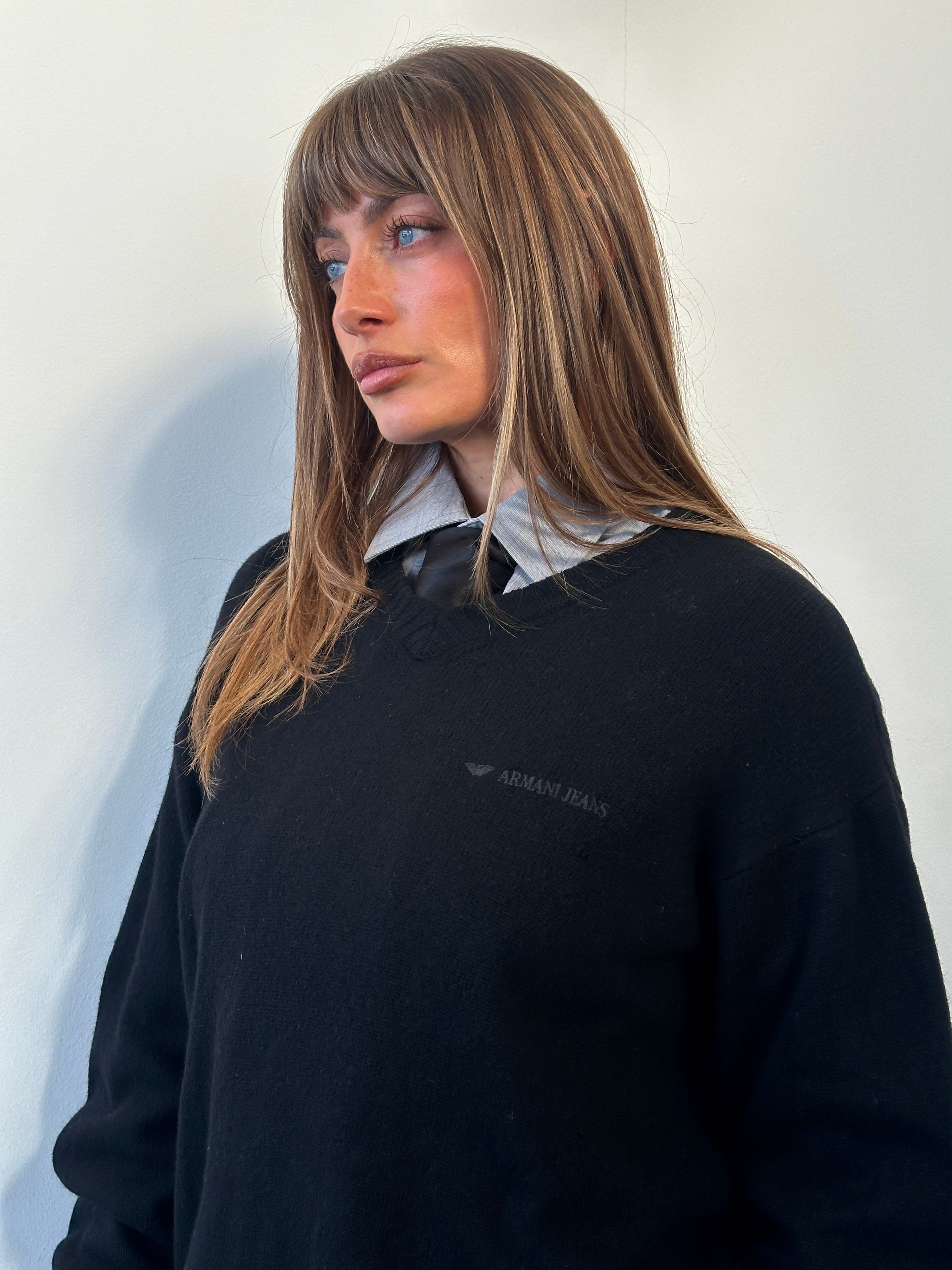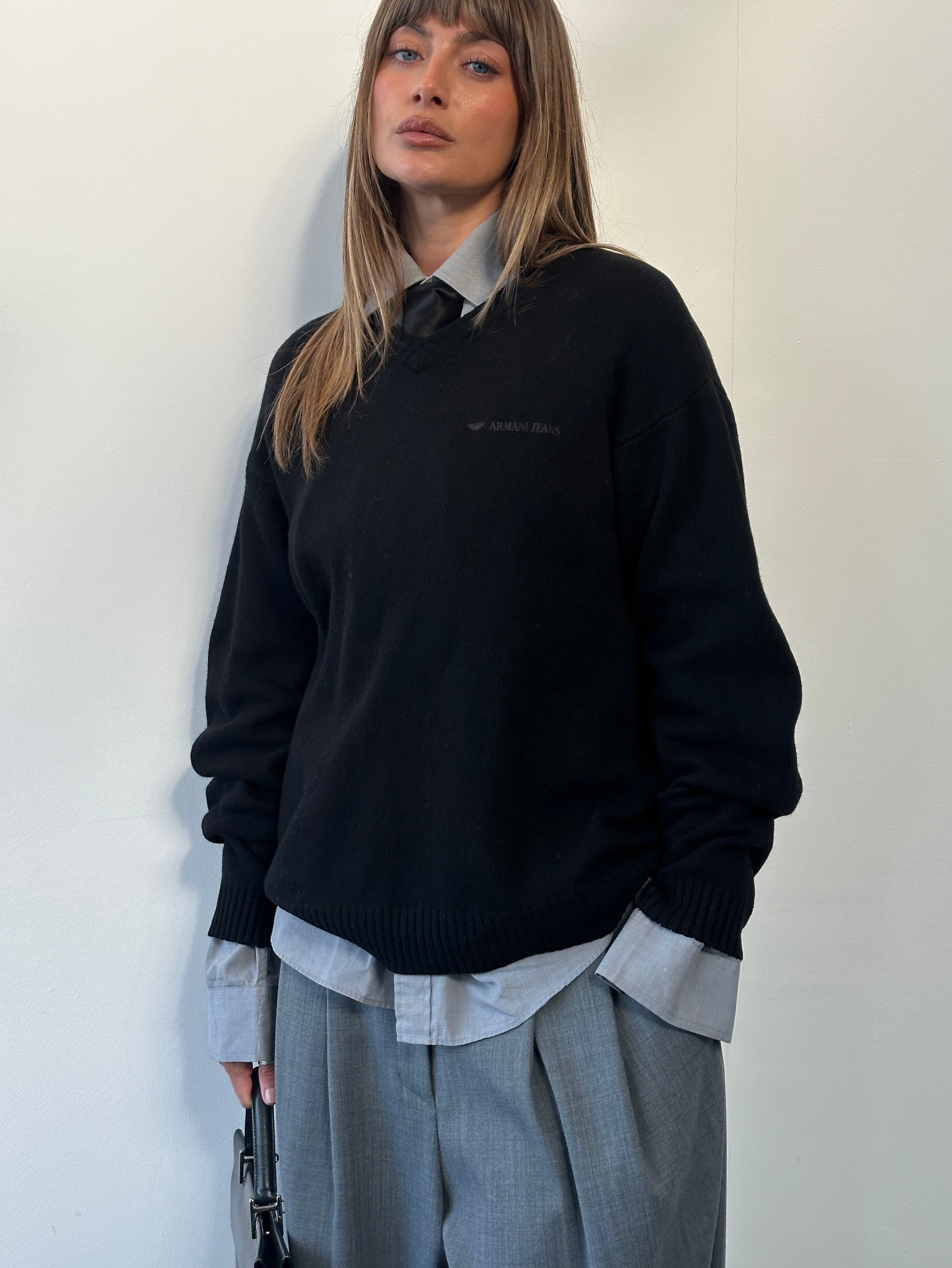 Vintage black V neck knit from the 1990s Armani Jeans line featuring tonal embroidery at the chest and a relaxed slouchy fit. A minimal everyday classic with a clean quiet luxury feel.