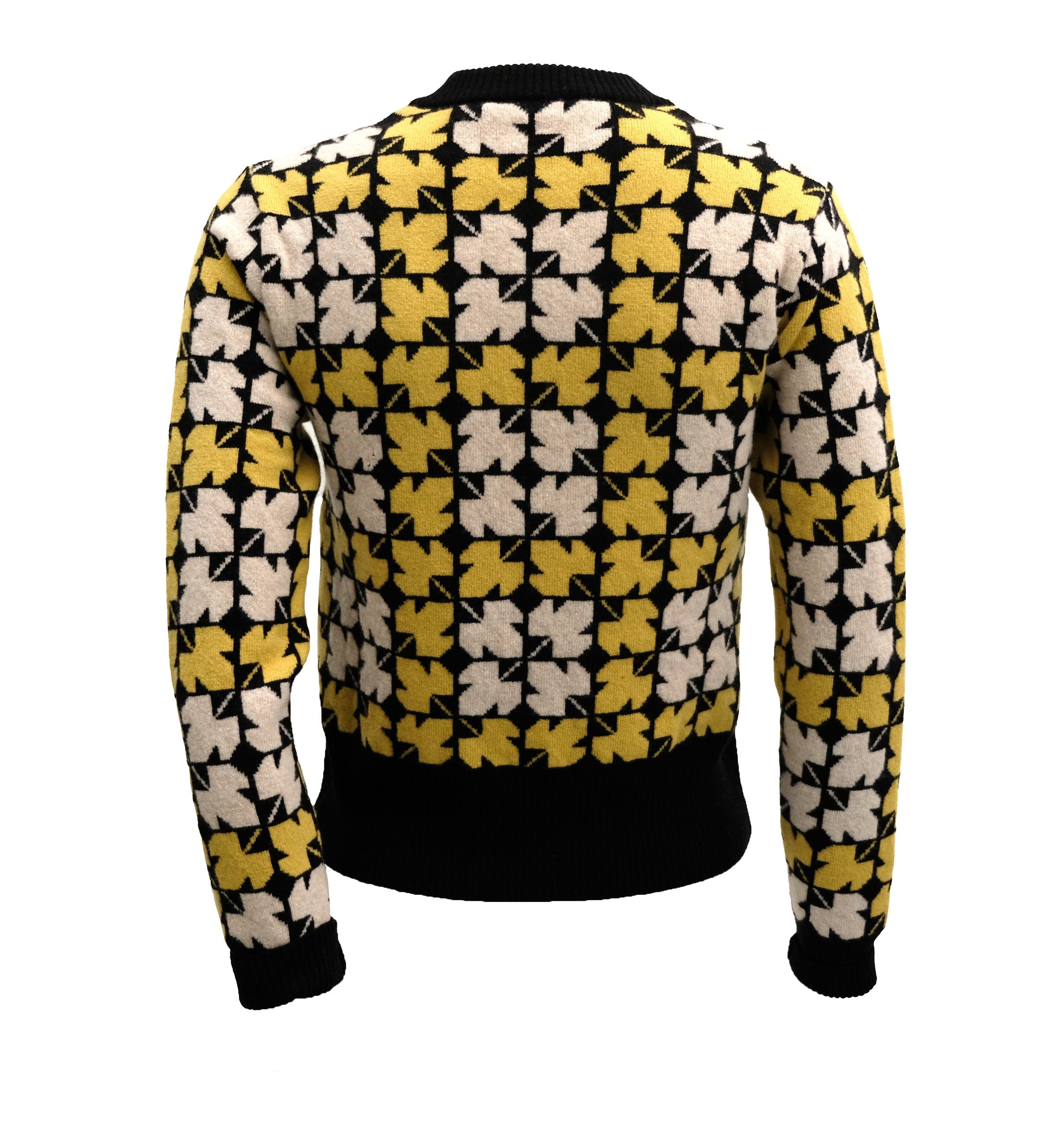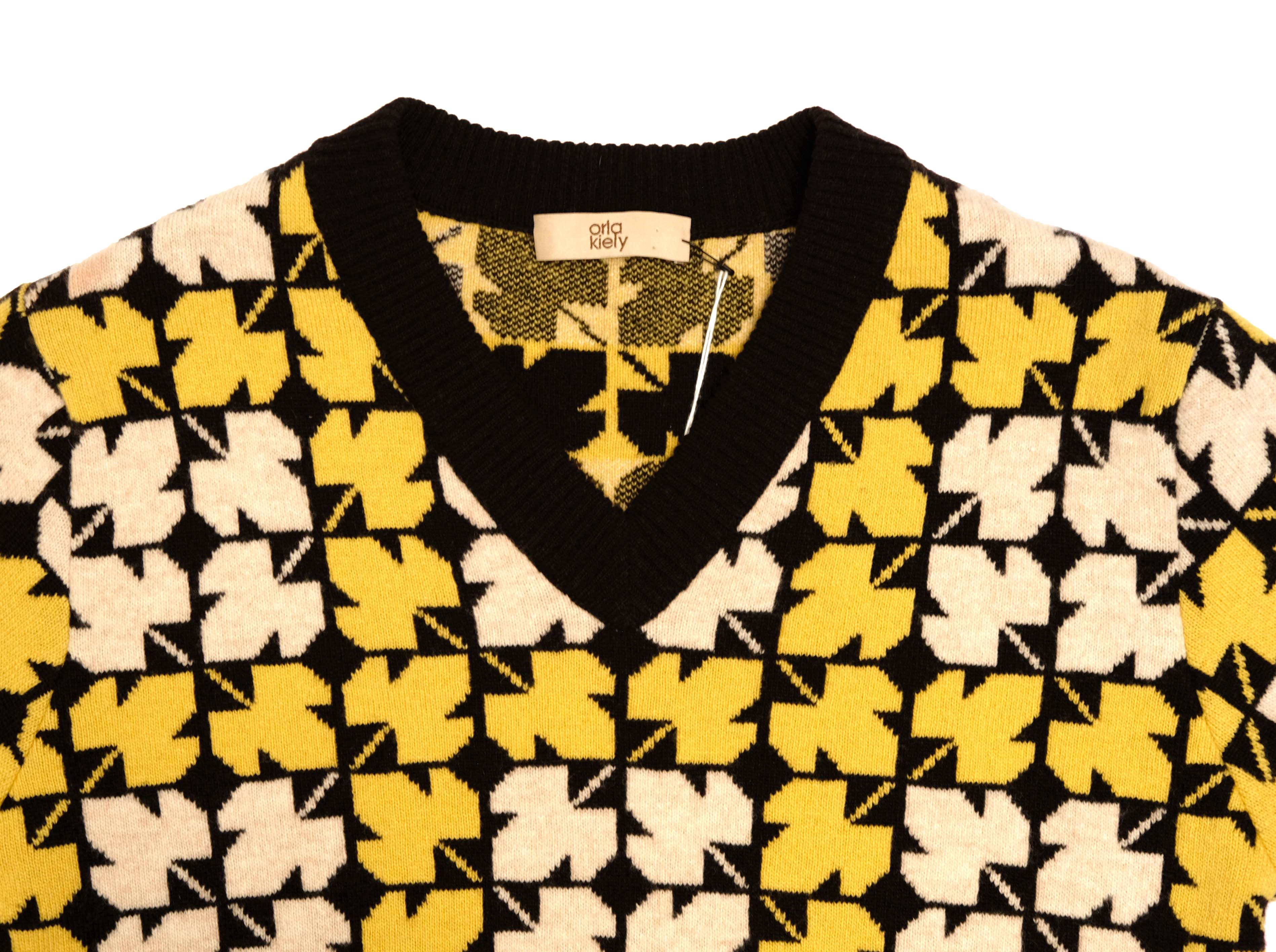 A lovely retro V neck jumper by Orla Kiely intarsia knit, in geometric leaf pattern in ivory and yellow on black ground, with black rib at the neck, waist and cuffs.