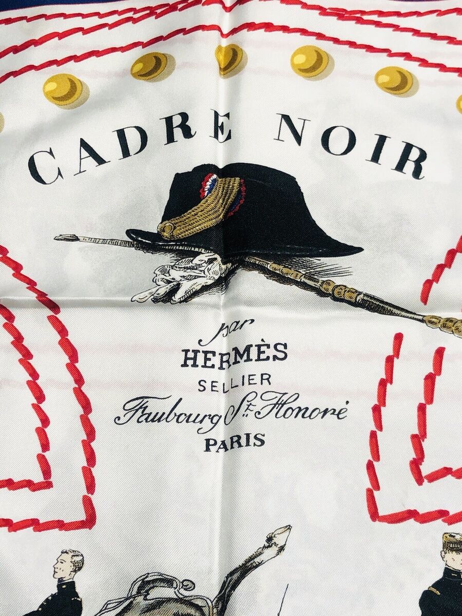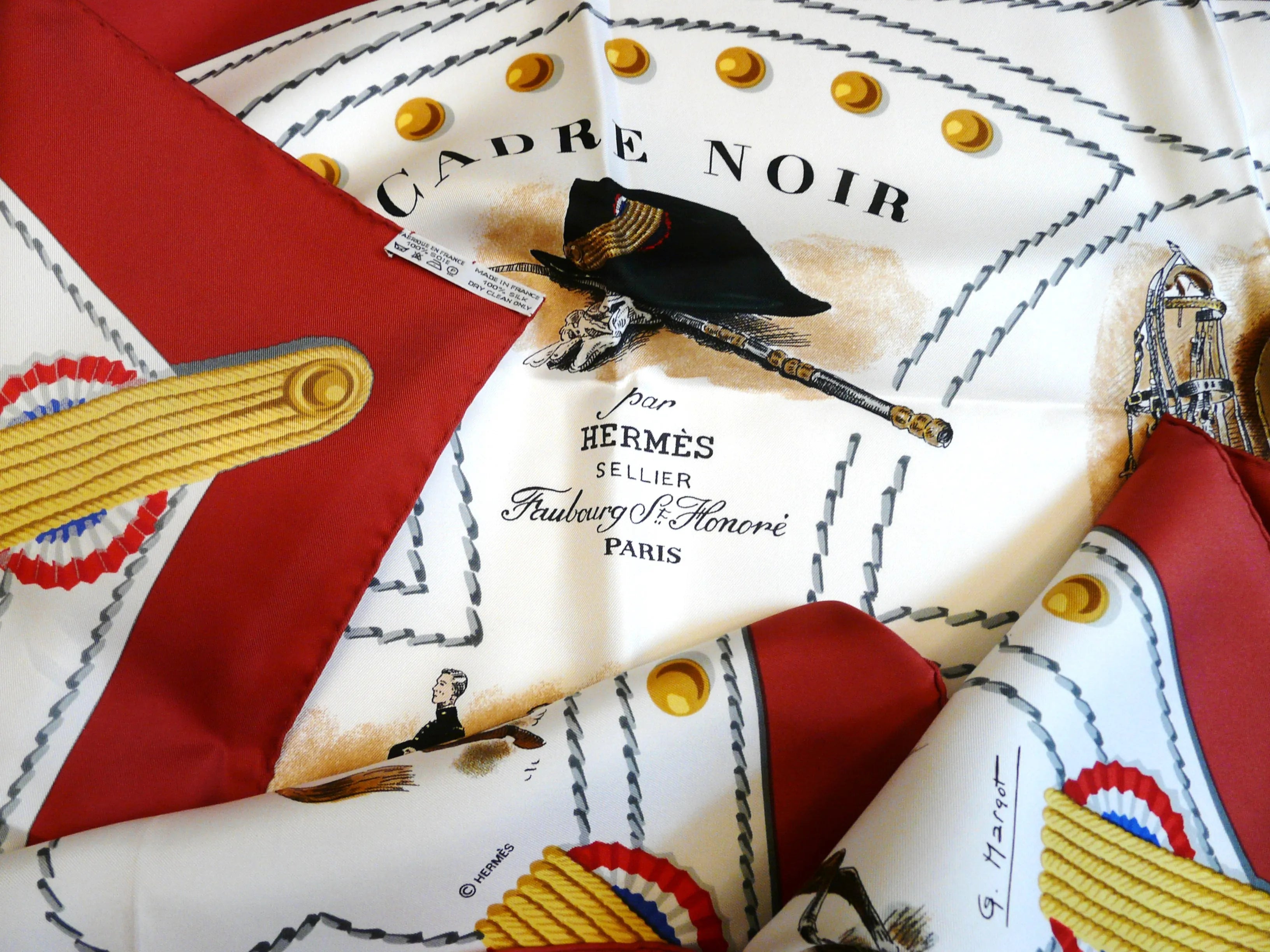 This rare 1990 "Cadre Noir" vintage Hermès silk twill scarf was designed by G. Margot. The Cadre Noir scarf pays homage to the prestigious and elite teachers of the French National Riding School, the École Nationale d’Équitation at Saumur, founded in 1828 and still in existence today. Cadre Noir received its name from the black uniforms worn by their instructors. The École Nationale d’Équitation is considered to be one of the most prestigious horsemanship schools in the world.