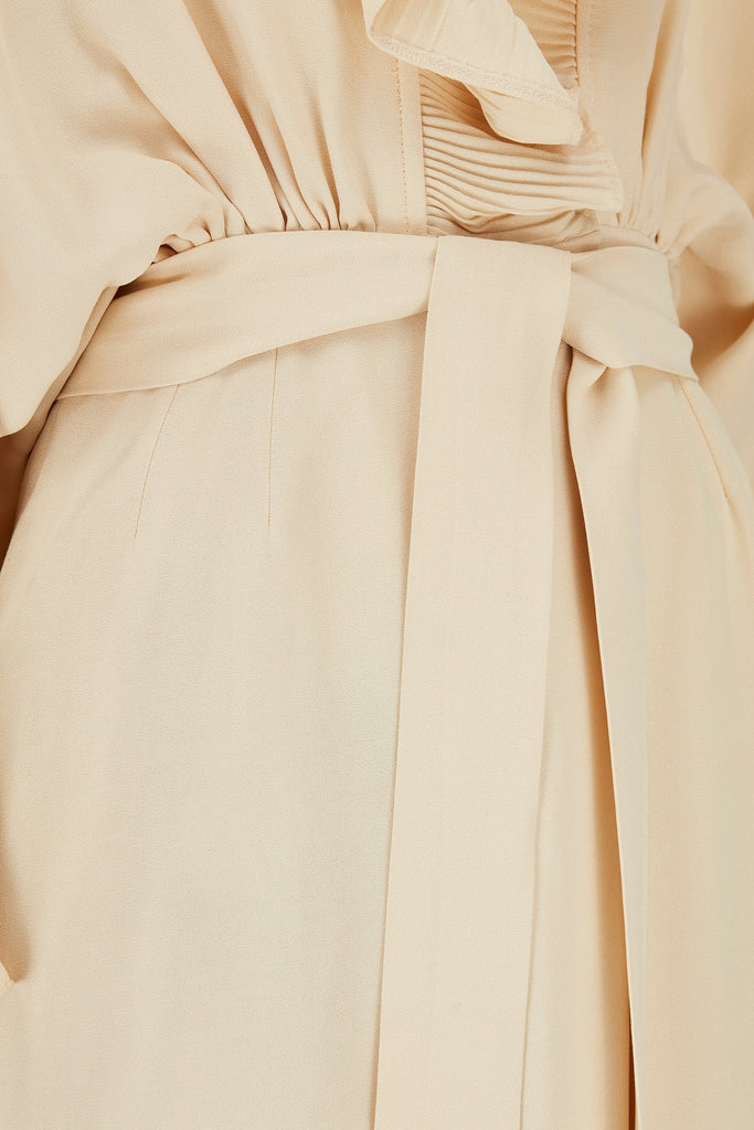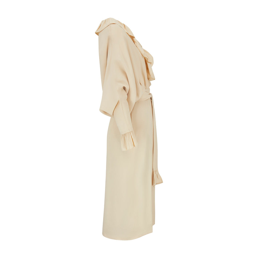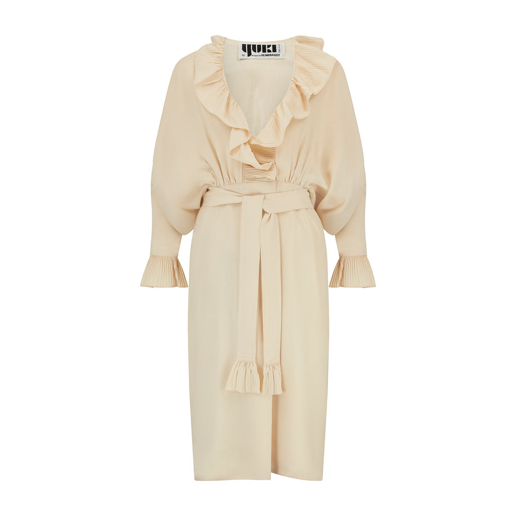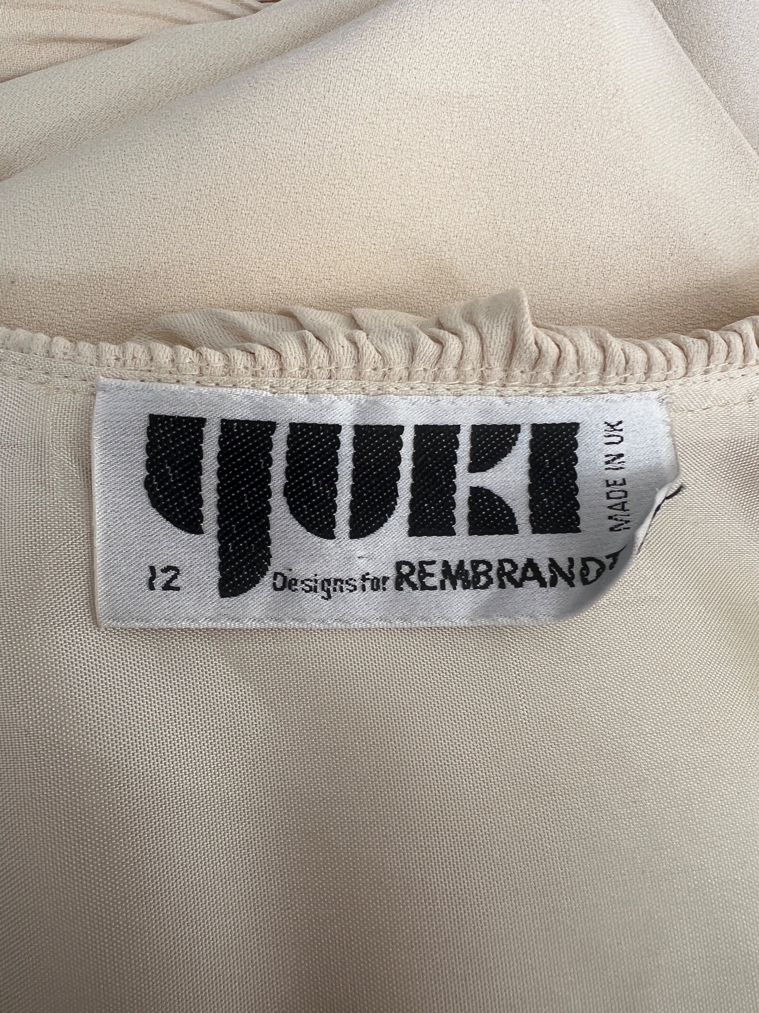 This elegant dress was designed by Yuki for British store Rembrandt during the 1970s. Made in the UK, it is crafted from a high quality crepe cloth in a rich cream hue. This dress celebrates Yuki’s canny tailoring; his signature cut was to craft panels of full circles which were then draped. This was to create maximum fullness with no seams, and his designs - like this one - often formed flamboyant batwing sleeves which were cinched by gathered waists. This midi-gown has a pleated, ruffled collar and has an off-centre fastening at the bust, secured with snap closures, which gives way to a soft pleat down the front. The pleating at the collar is echoed at the cuffs, adding decadent detail. This dress is fully lined in cream satin.
