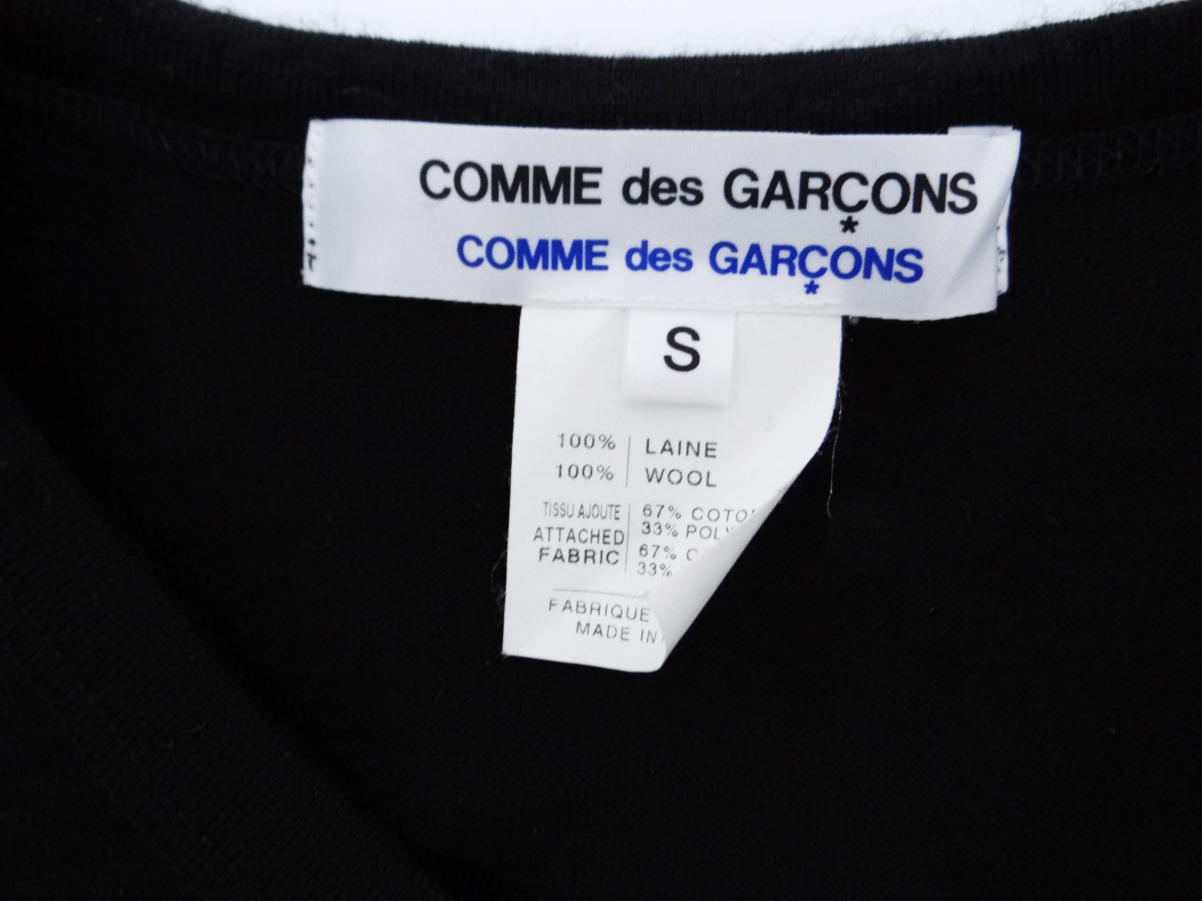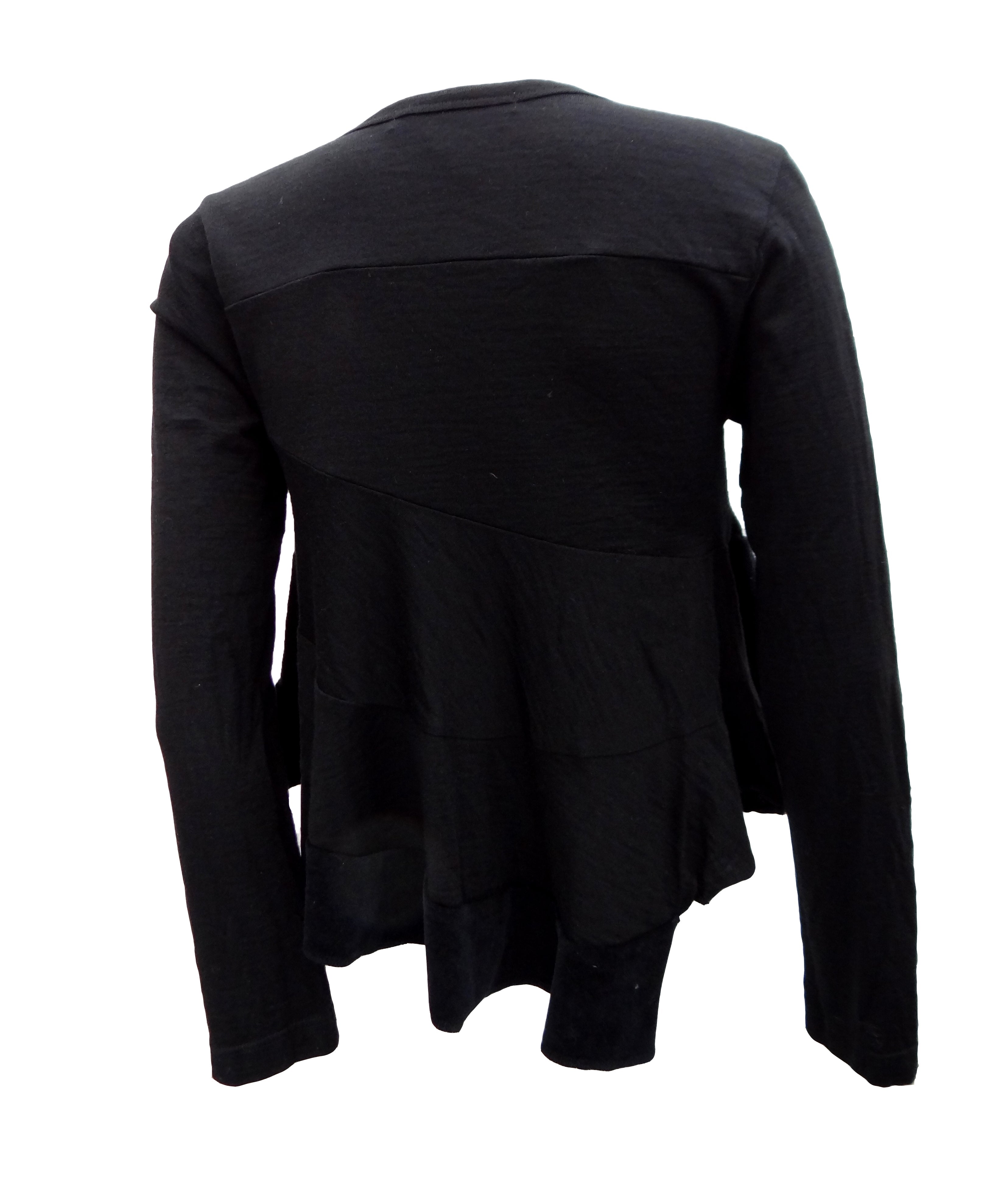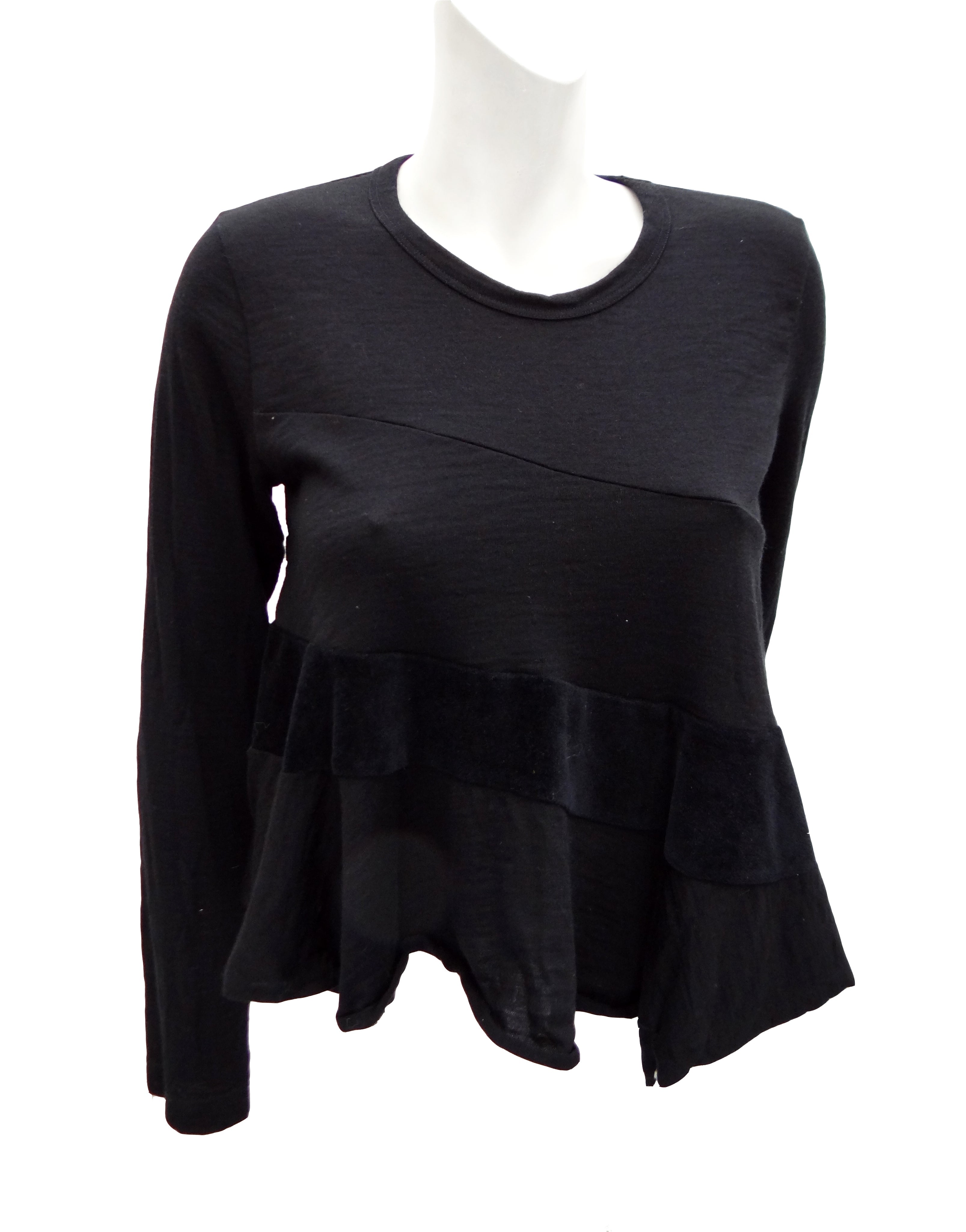 A great top in black wool tricot by Comme des Garcons.  It has a round neck and long sleeves, and is composed of several horizontal bias cut panels in wool and velvet, flaring out to the waist with asymmetric unfinished hem.