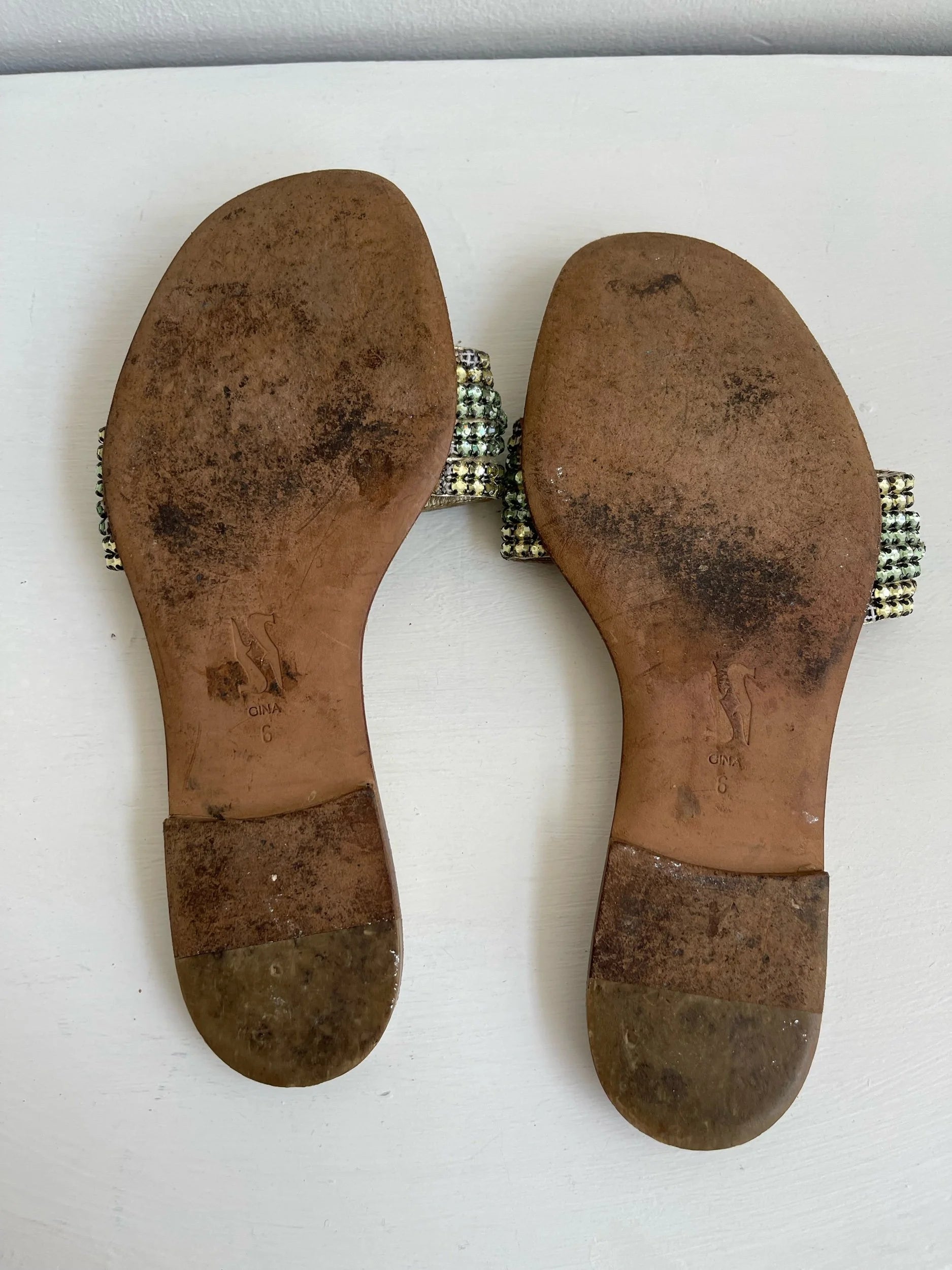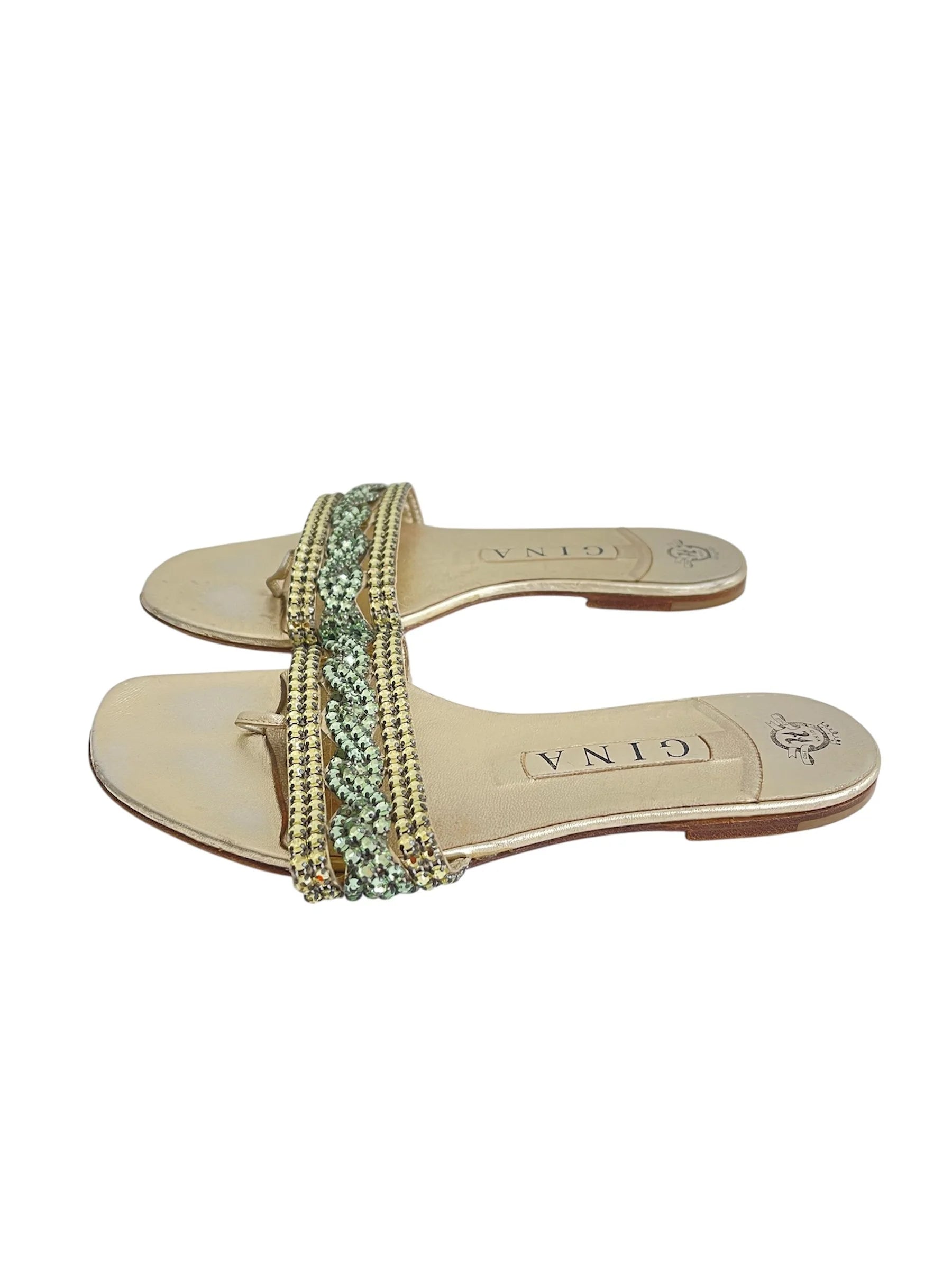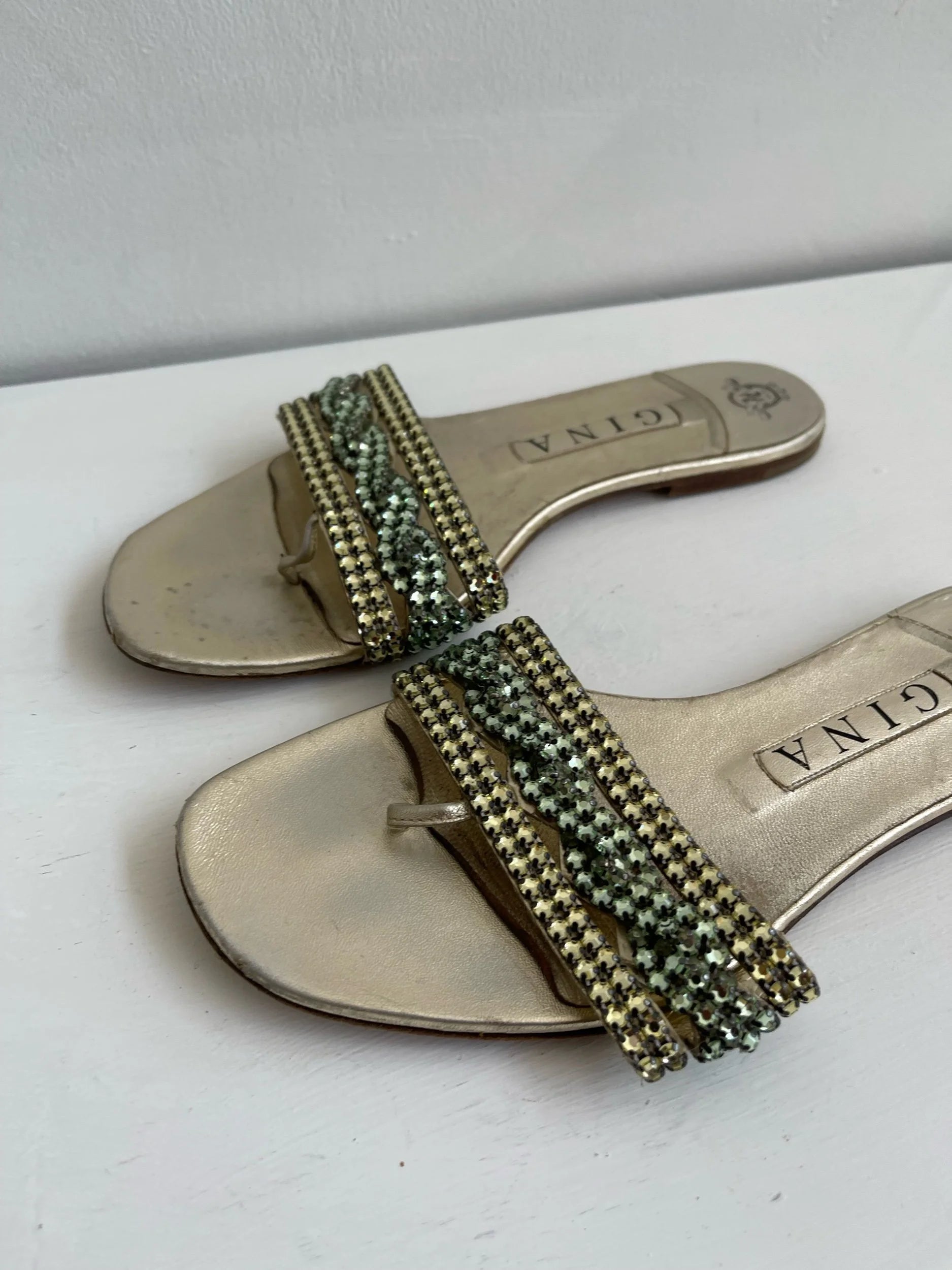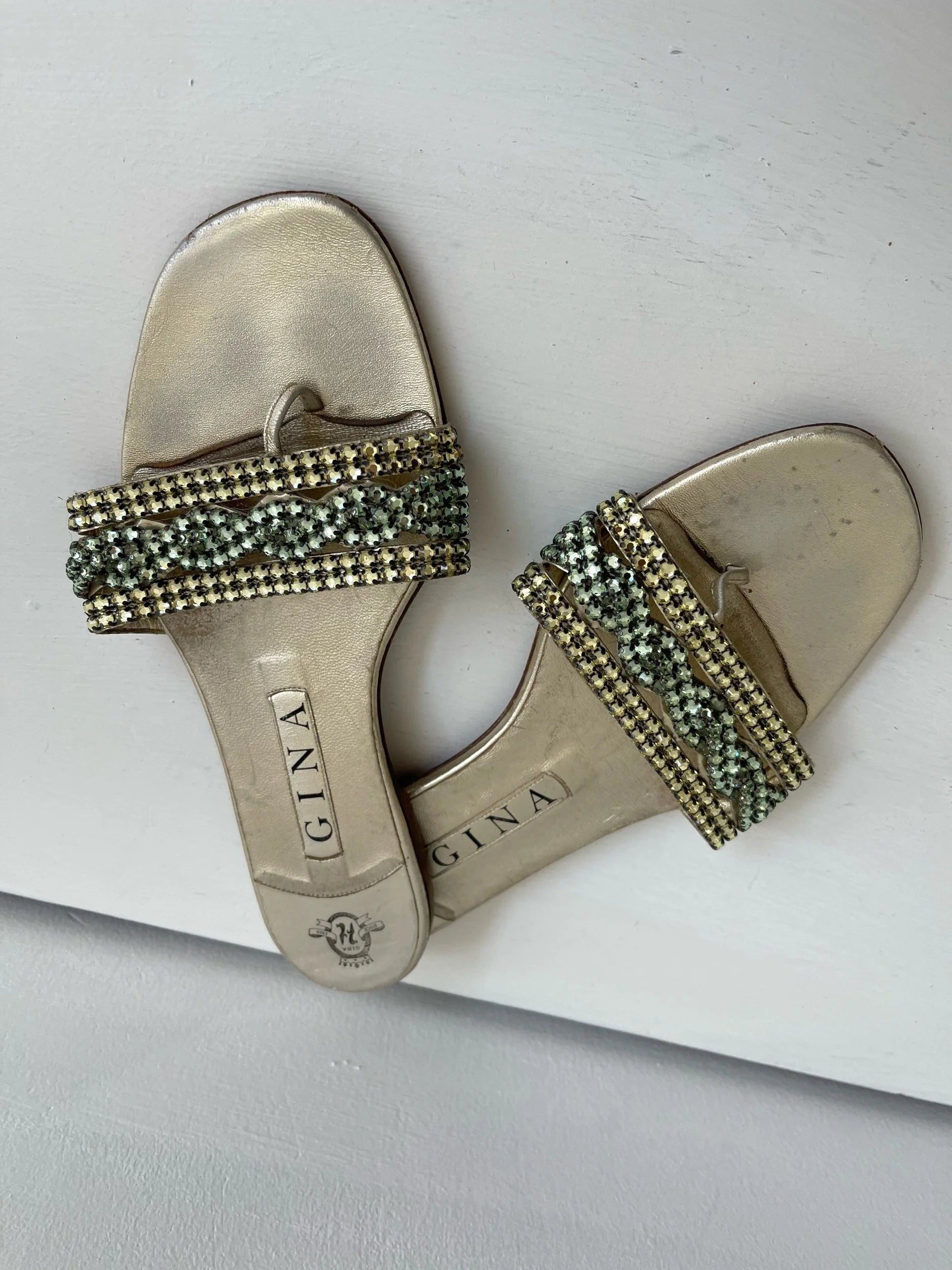 Step into early-2000s glamour with these rare Gina slip-on slides, crafted in shimmering gold leather and accented with a dreamy pastel crystal twist across the strap. Effortlessly chic with a nostalgic Y2K vibe, these flats bring together luxury craftsmanship and playful sparkle—perfect for elevating casual looks or adding a touch of glitz to evening wear.