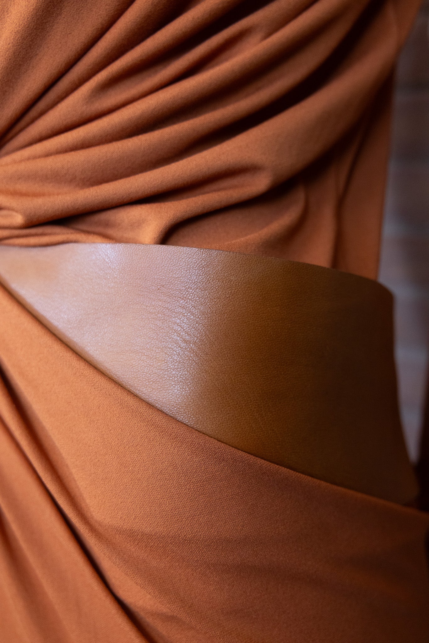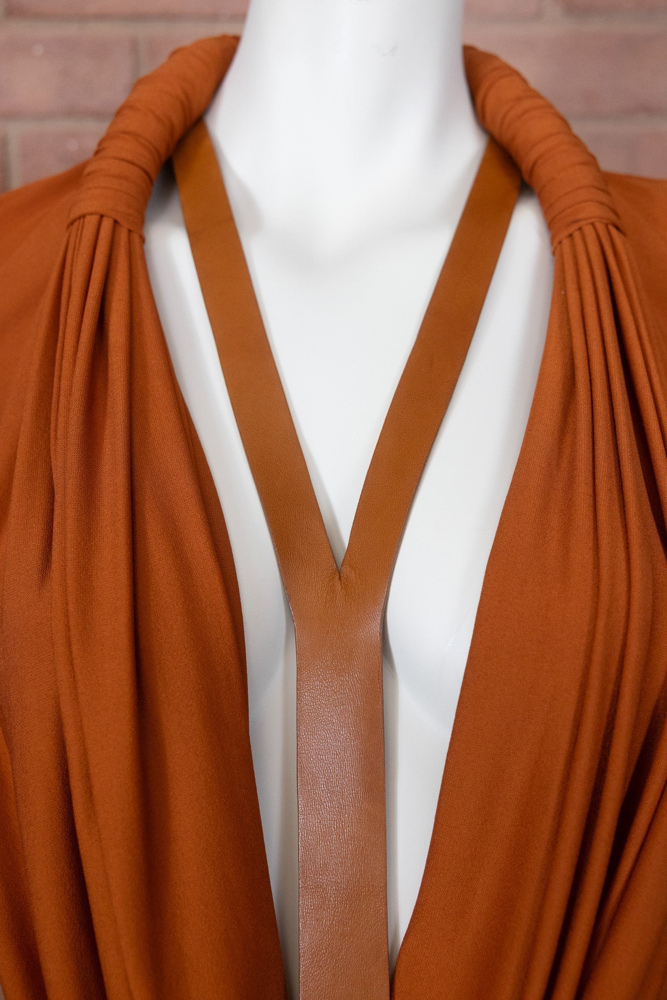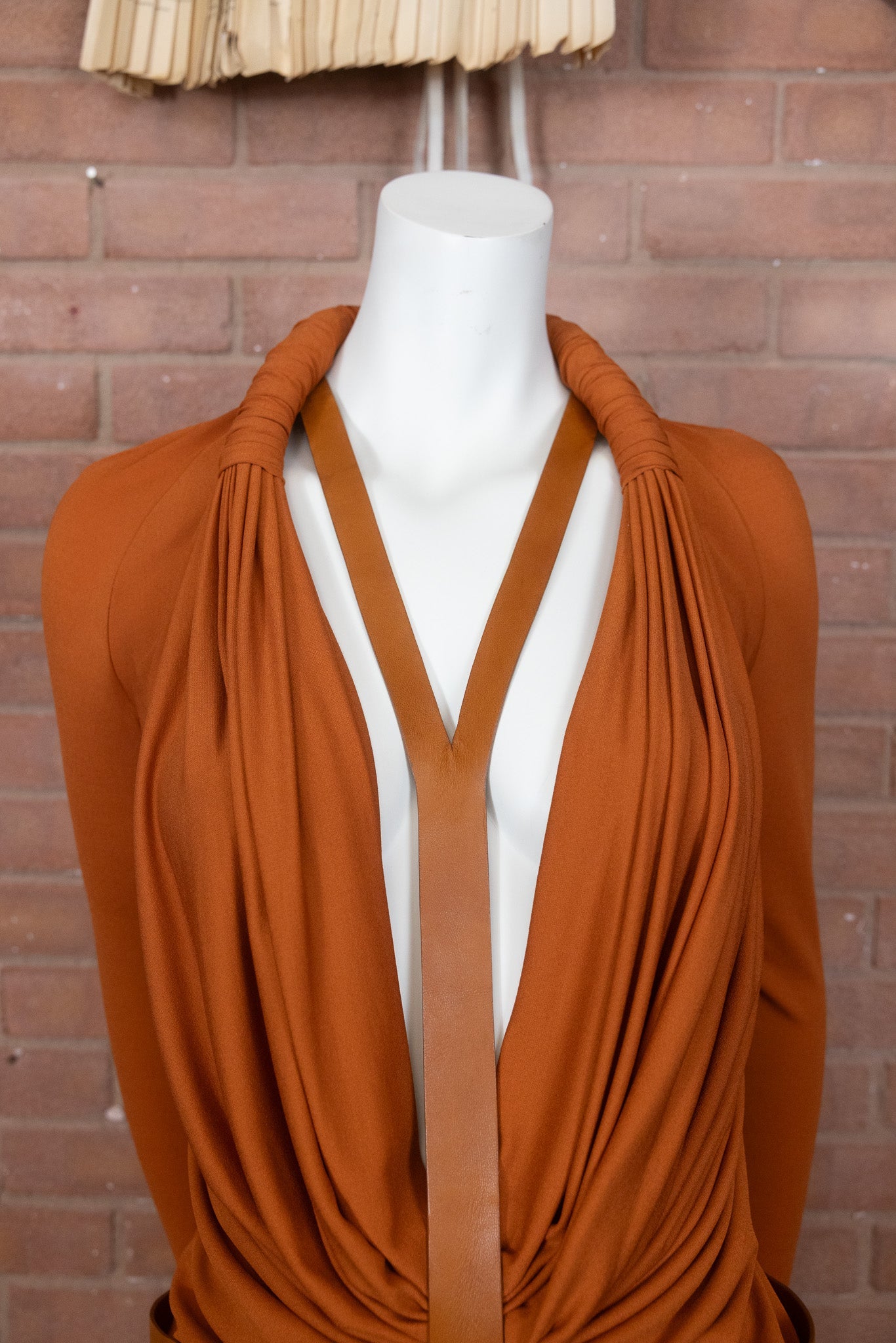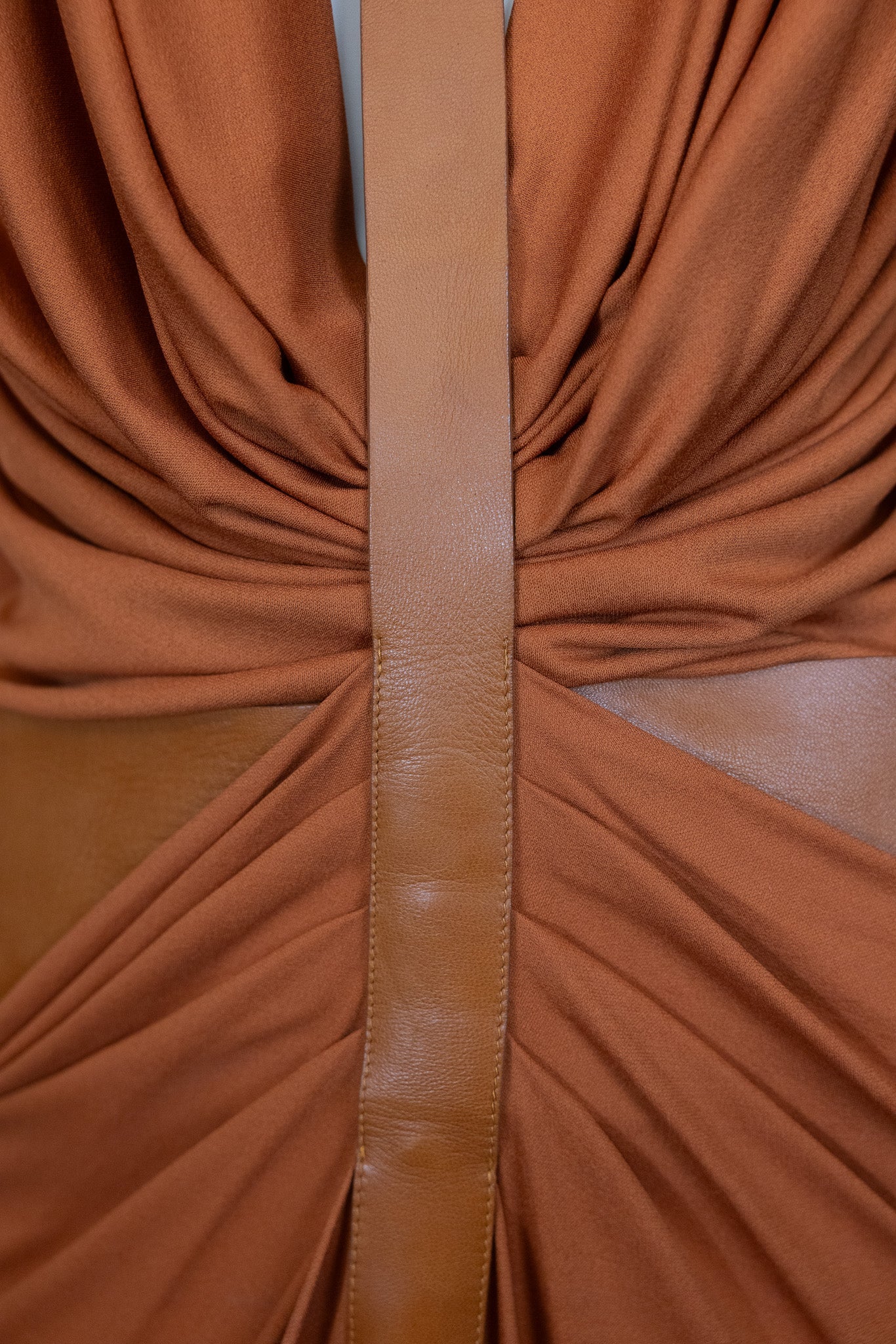 This Givenchy dress is an expertly crafted statement piece. Made of luxurious silk jersey, it features a low neckline and long sleeves, with a leather harness design on the bust for added edge. The wide tan leather belt accentuates the hips, while the draped skirt and front leg slit add movement and allure. Truly fabulous.