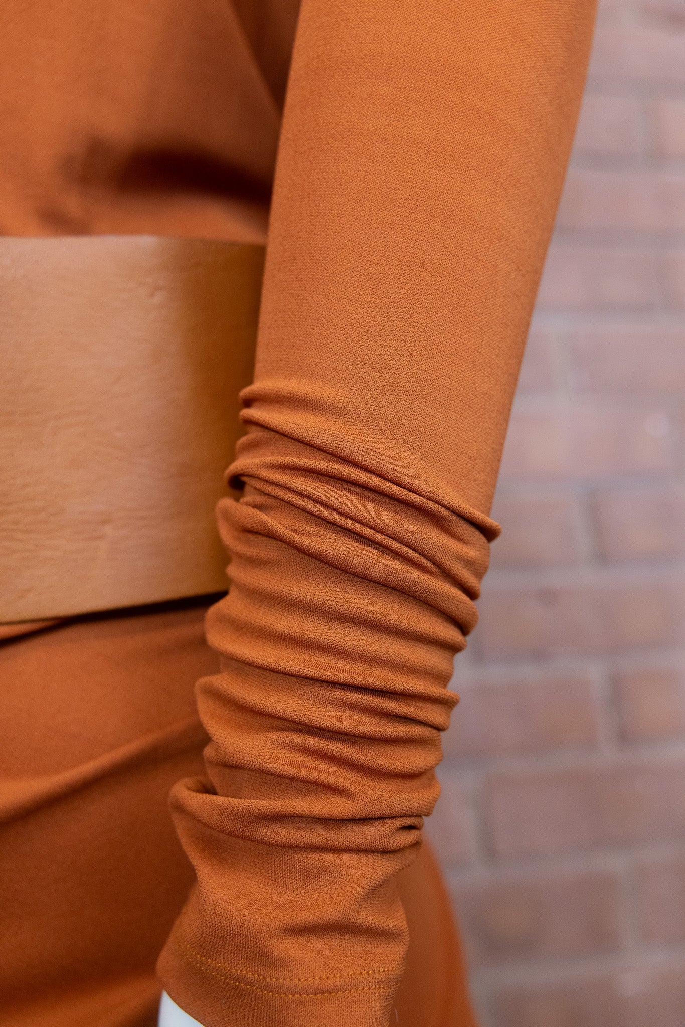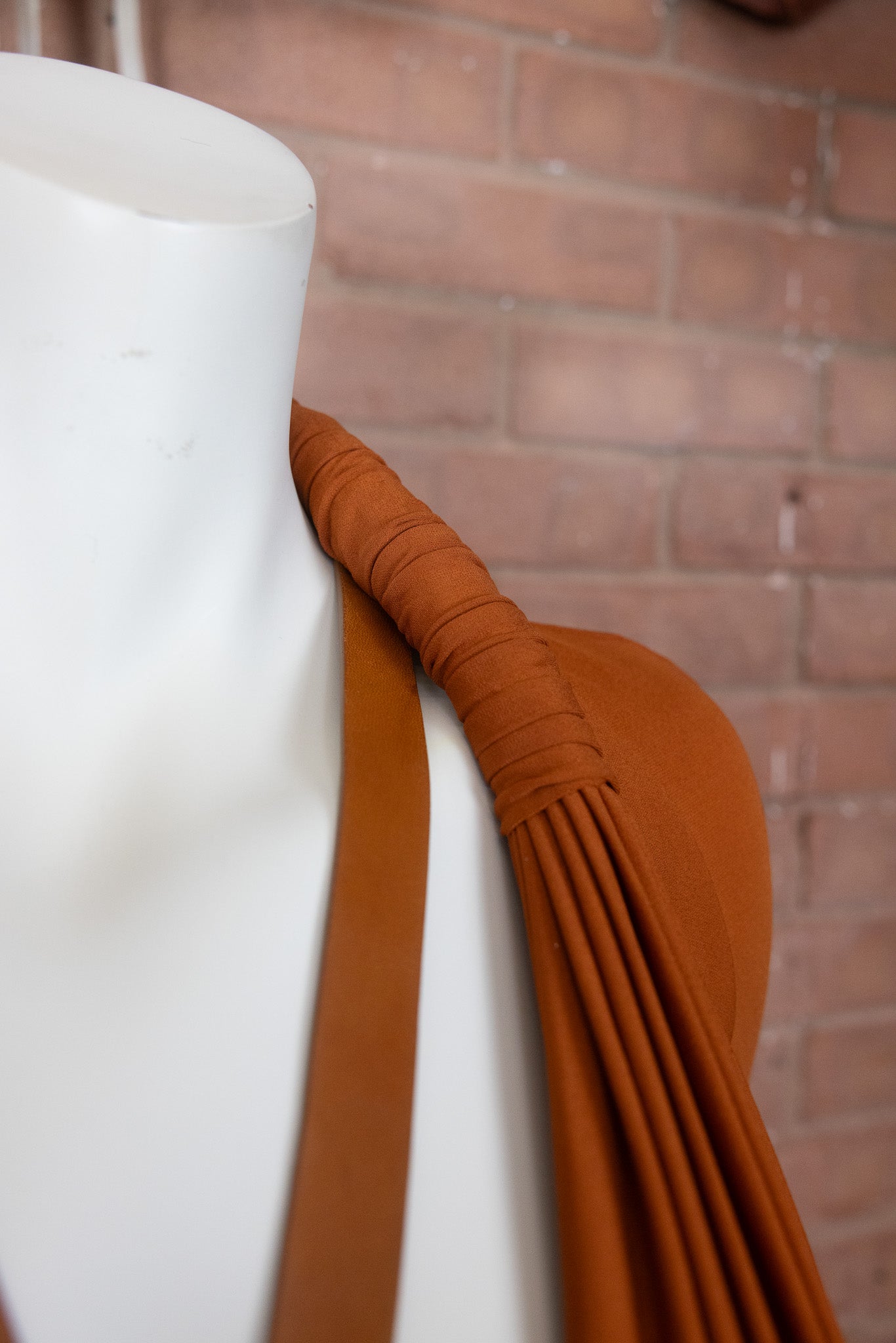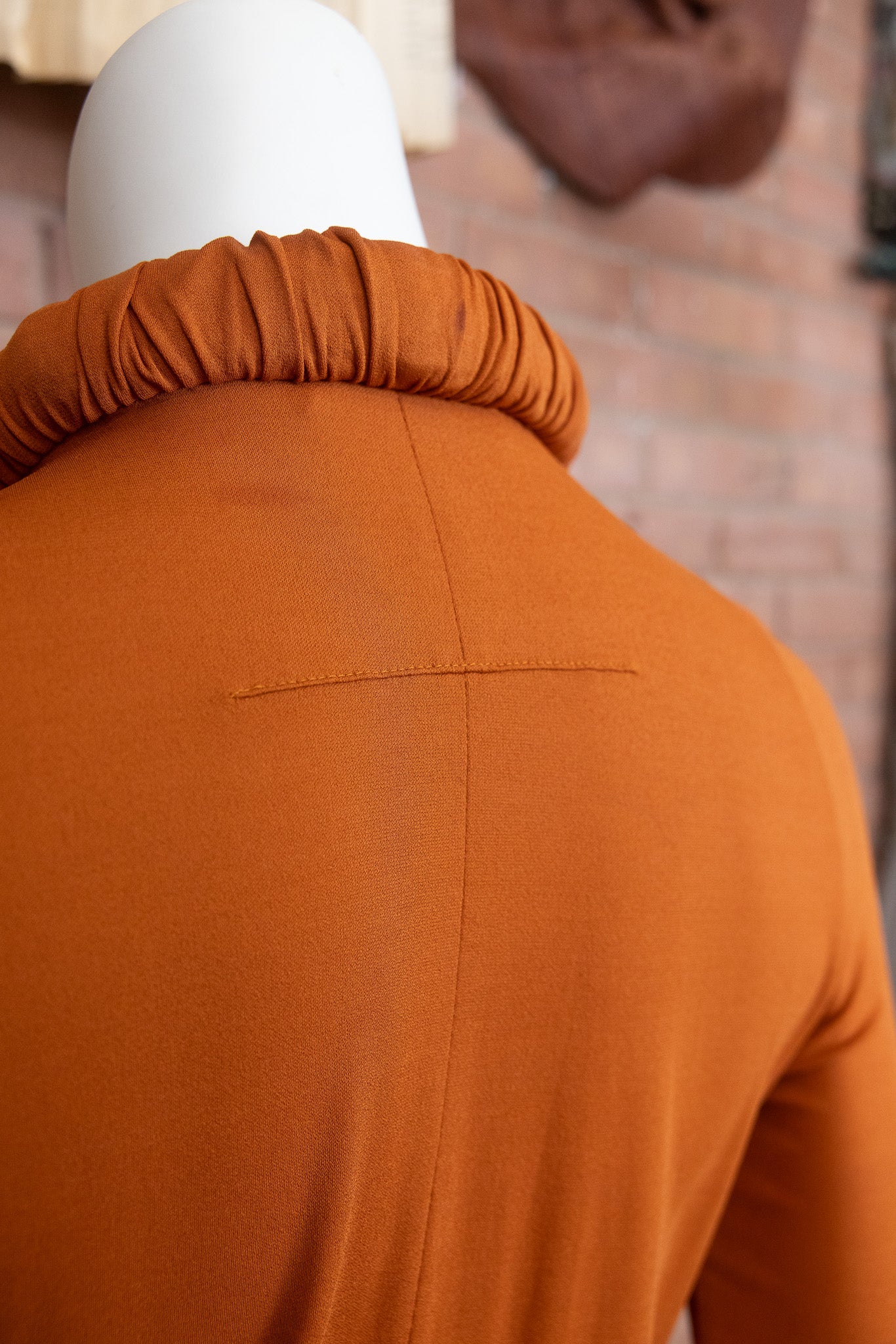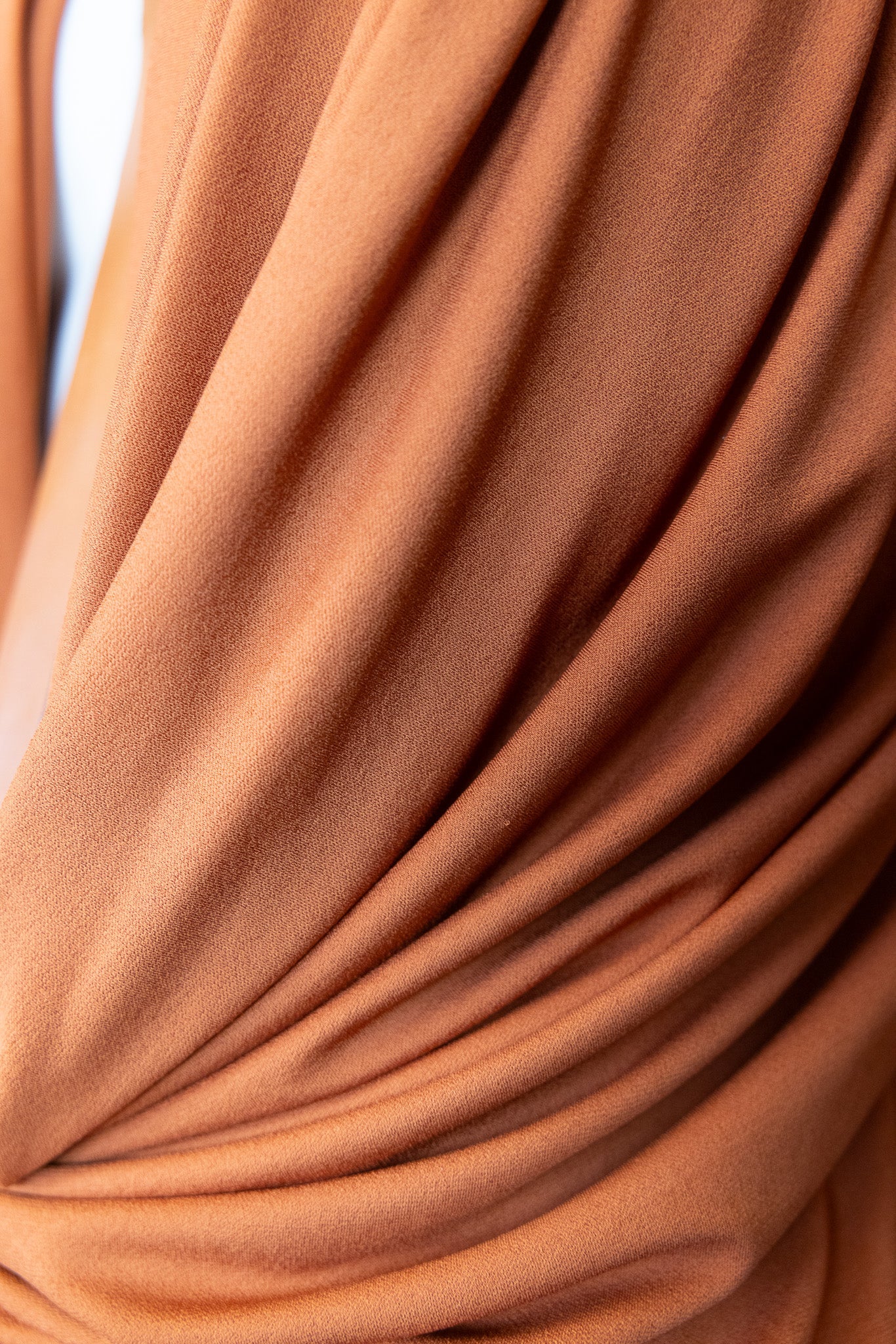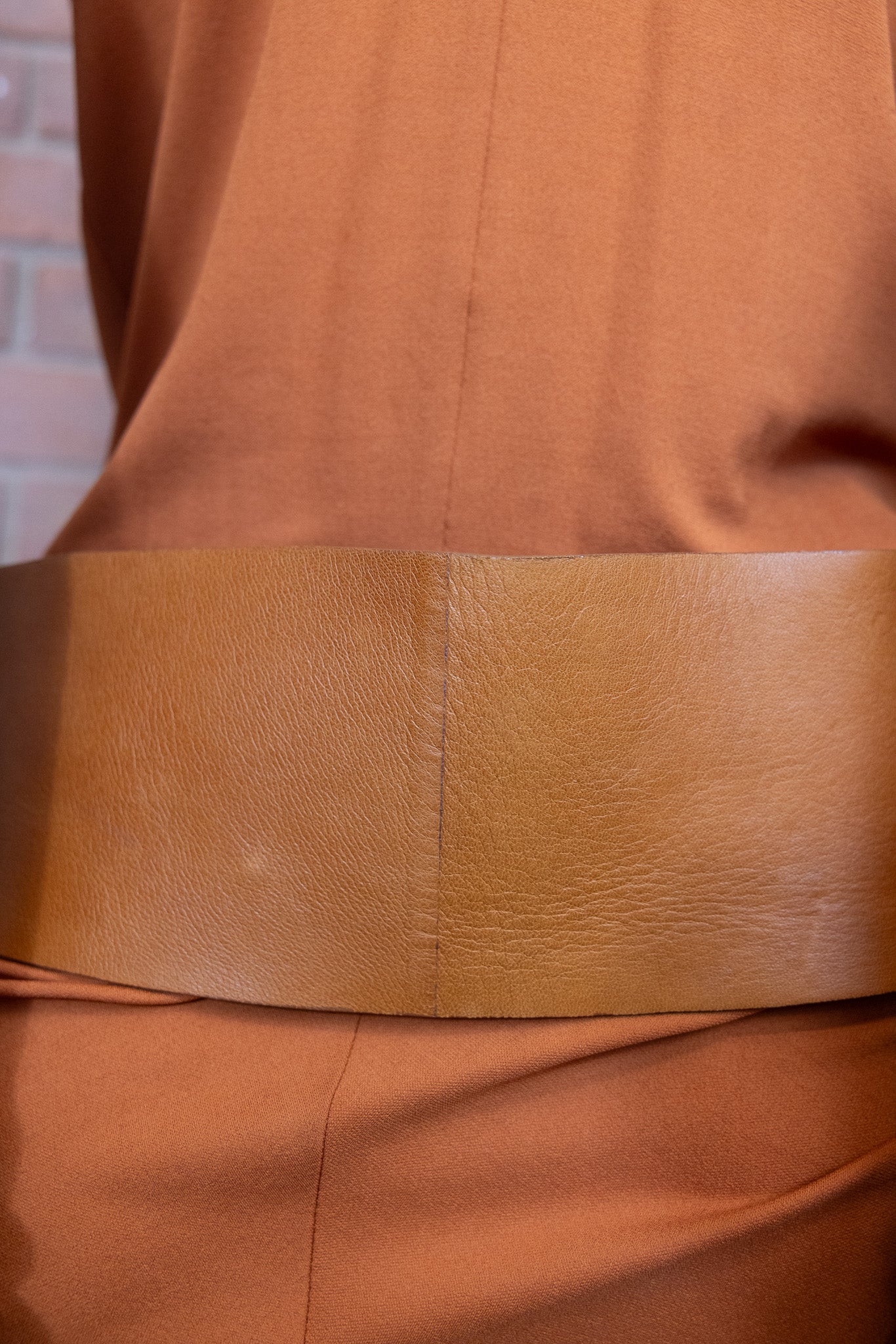 This Givenchy dress is an expertly crafted statement piece. Made of luxurious silk jersey, it features a low neckline and long sleeves, with a leather harness design on the bust for added edge. The wide tan leather belt accentuates the hips, while the draped skirt and front leg slit add movement and allure. Truly fabulous.