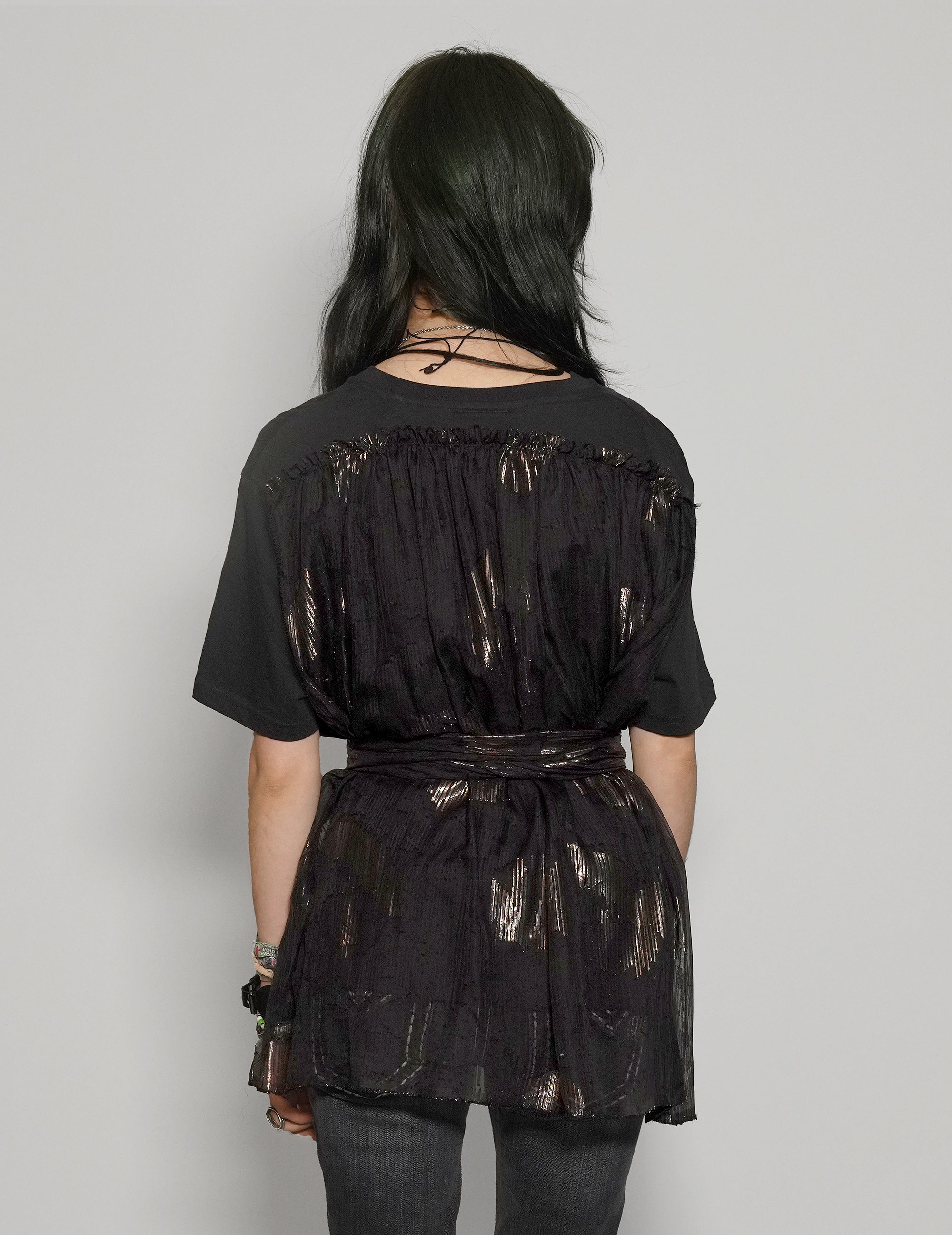 Women's cropped black t-shirt hand crafted in our East London Atelier m from soft, GOTS certified, 100% organic recycled cotton with relaxed fit, customised with an embroidered black and gold silk sequin party back and side tie with ST lined logo print on the front.