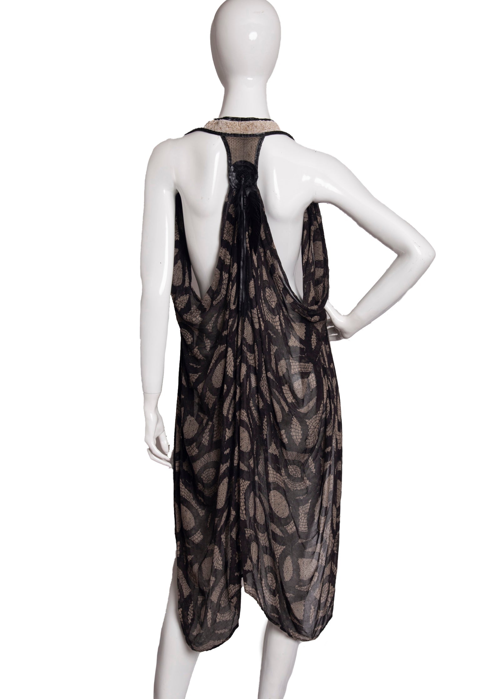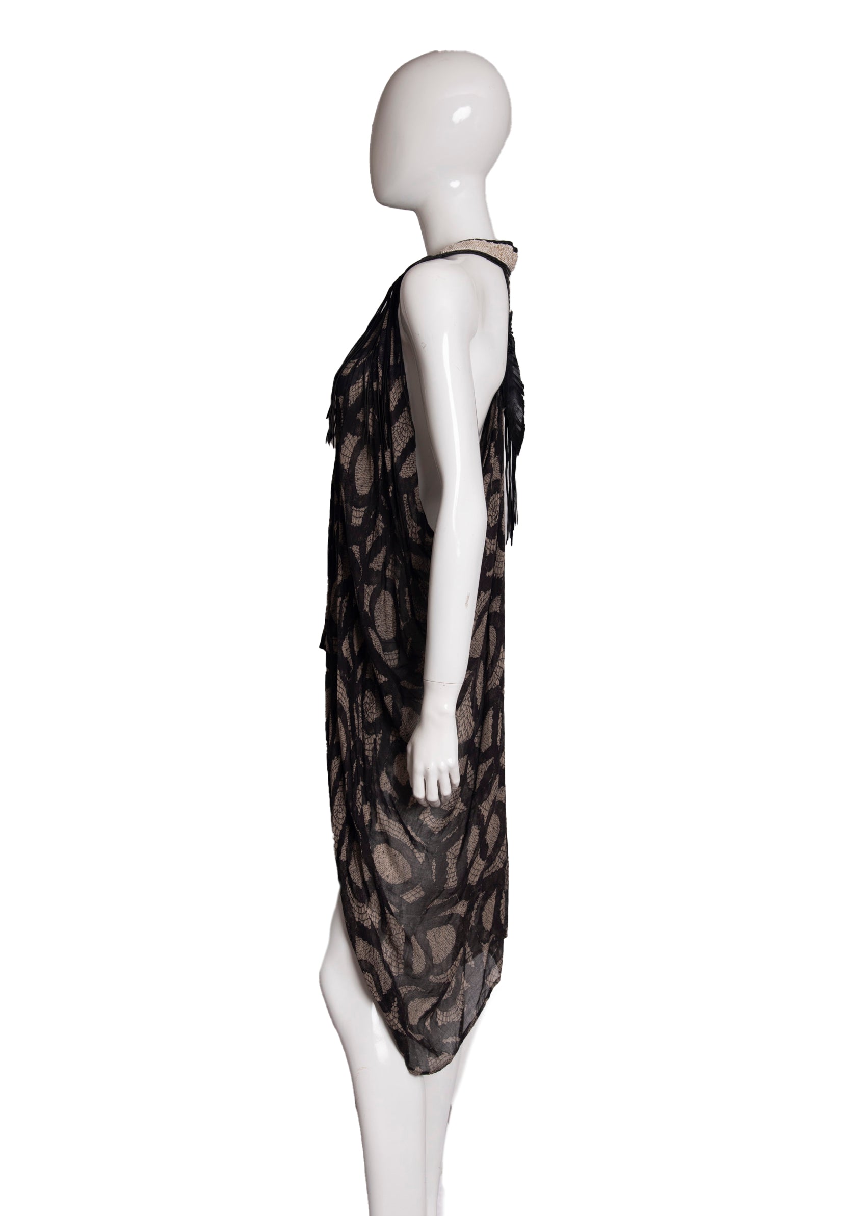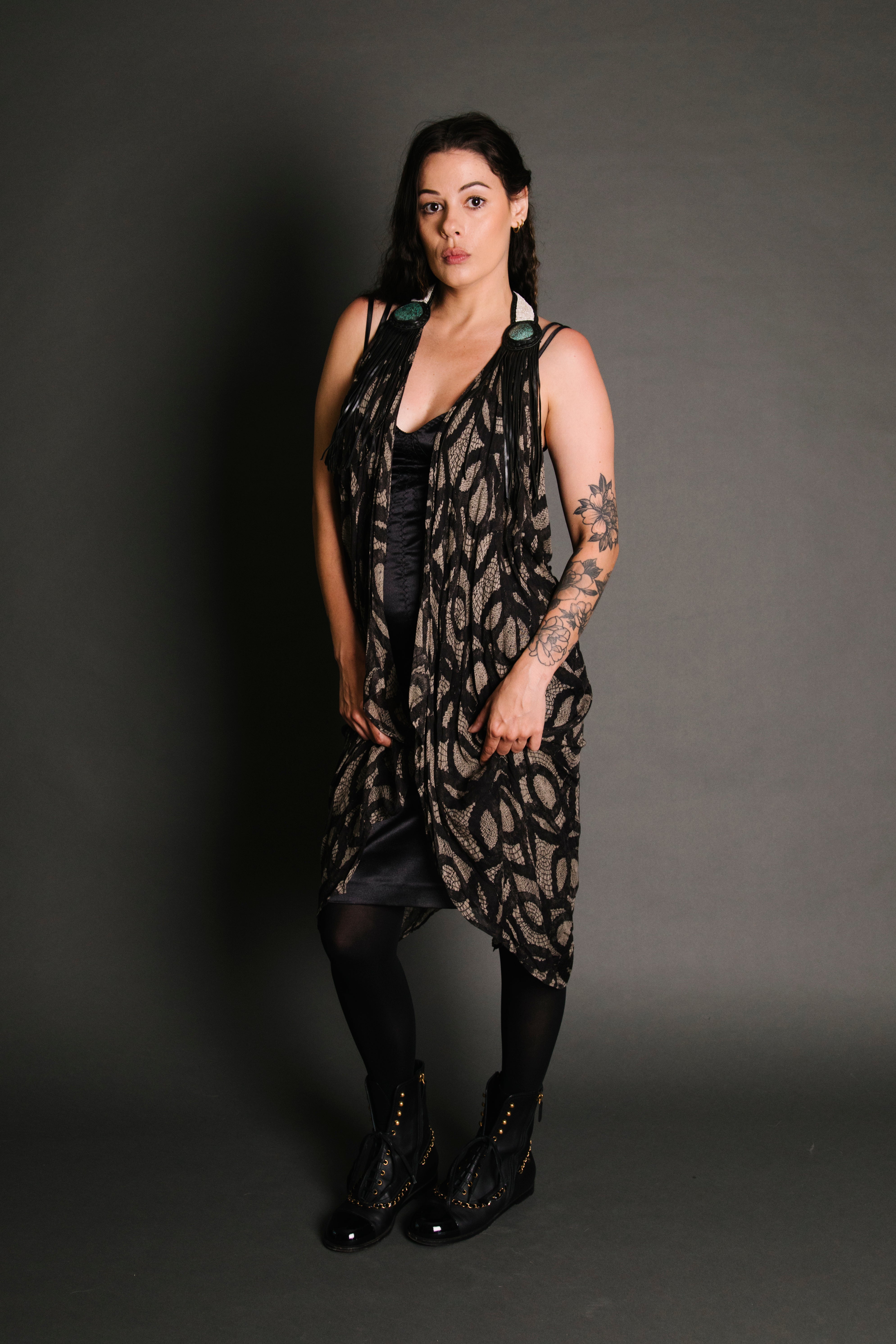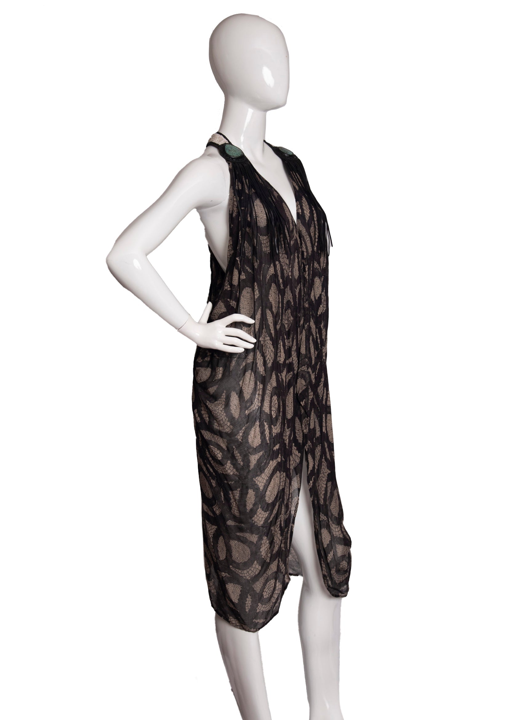 This amazing batique patterned vest is made from tissue silk and a leather yoke embellished with turquoise on the front, and features a gorgeous back made of snakeskin, custom beading and a soft leather rosette with feathers & tassels.