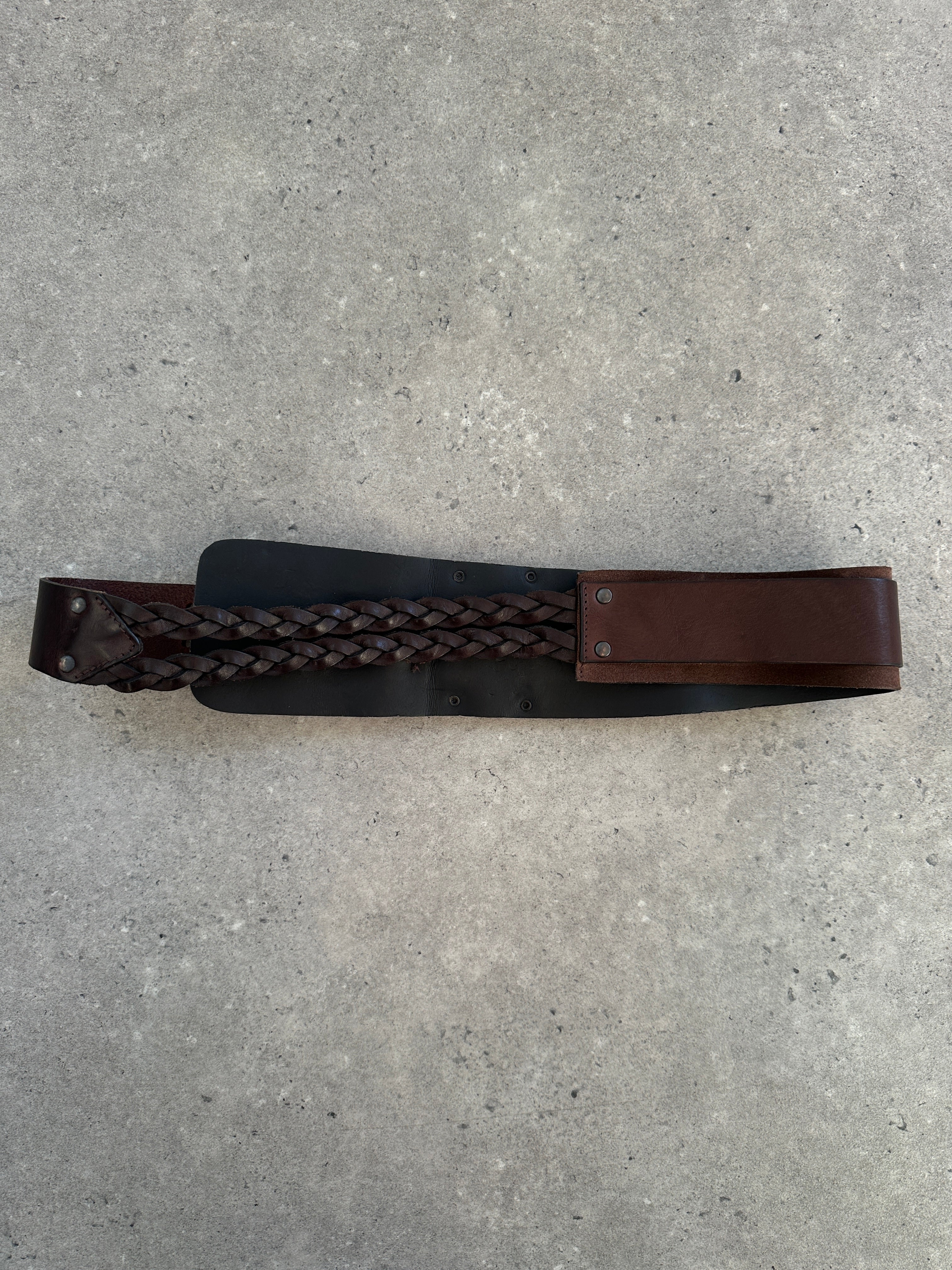 Vintage 1980s brown leather belt with braided detailing and aged metal hardware. A sculptural utilitarian accessory with character and structure.