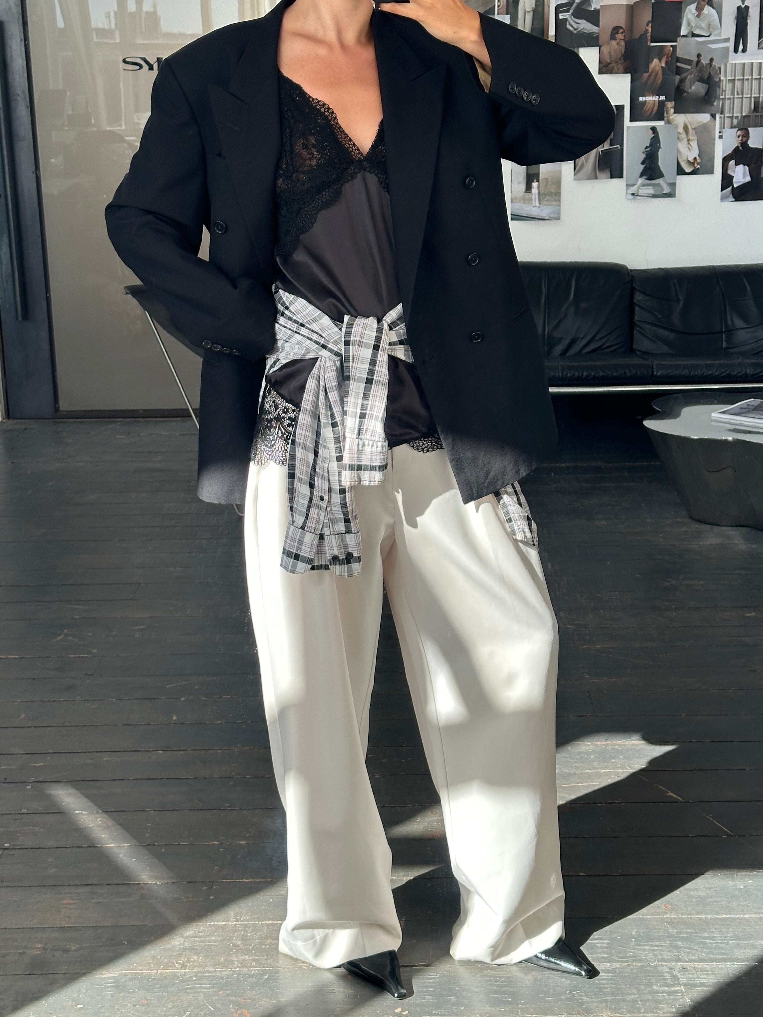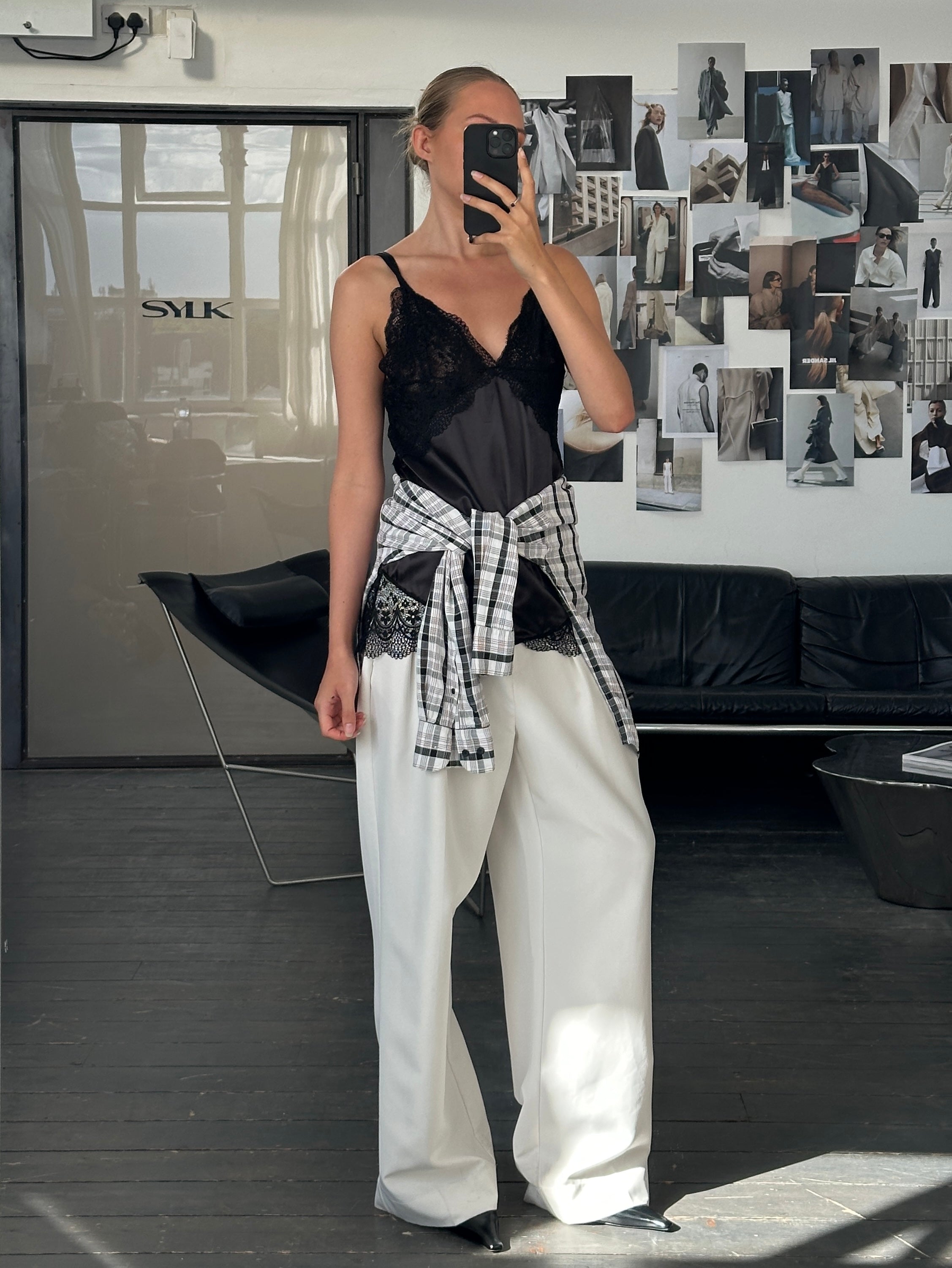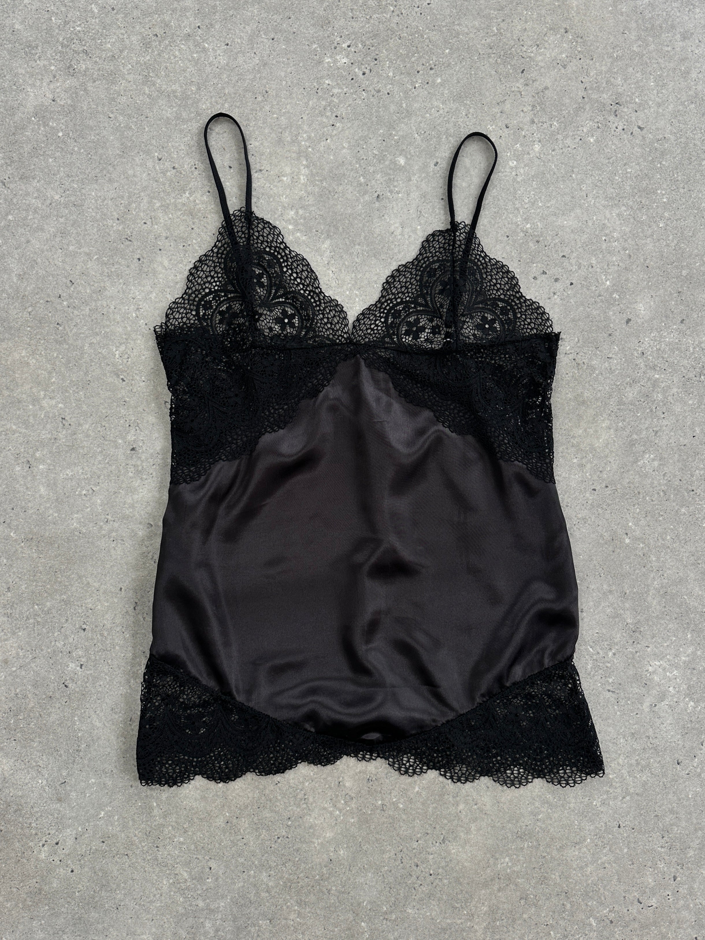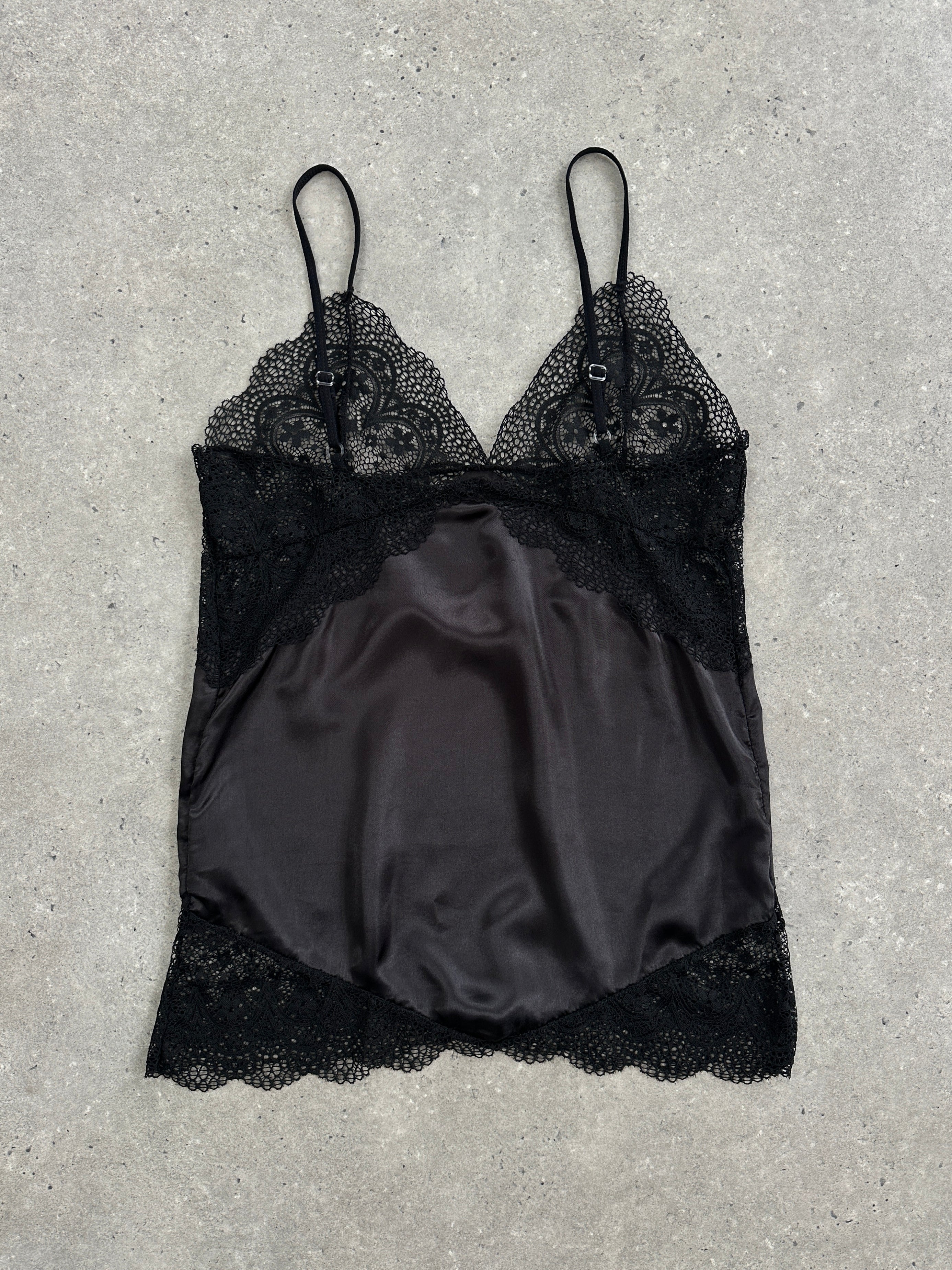 A 2000s lingerie inspired black satin camisole with lace bust and hem detailing, cut with a soft drape and straps for an elegant evening or layering piece.