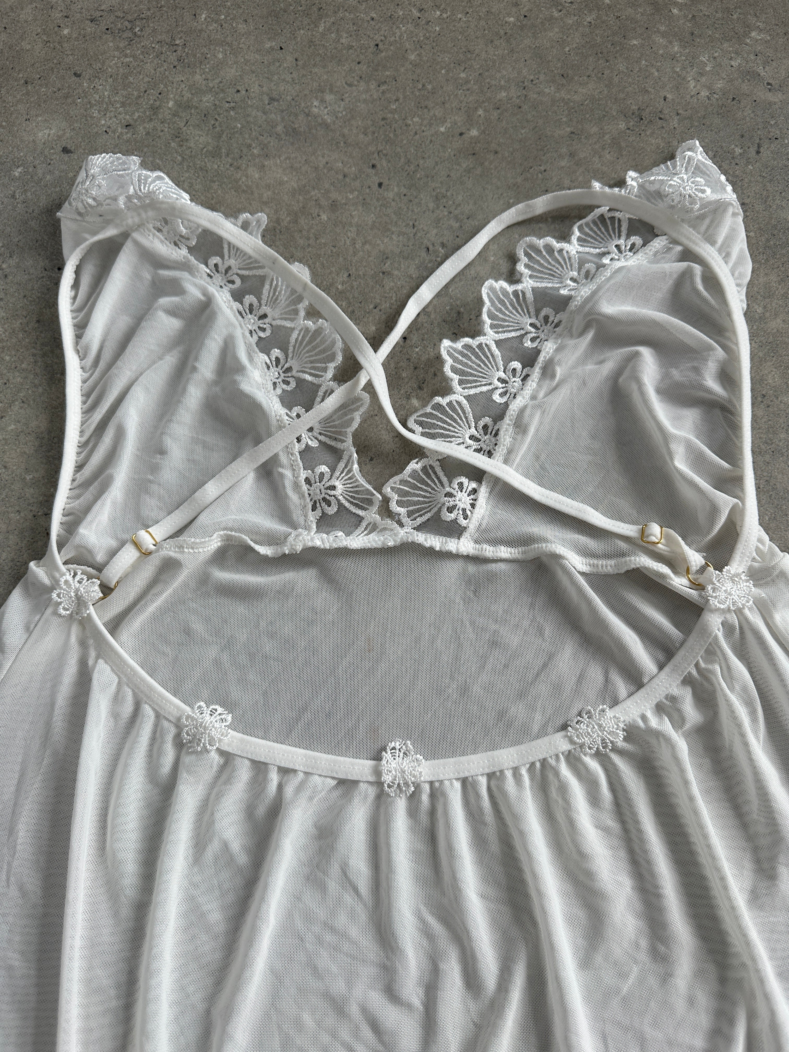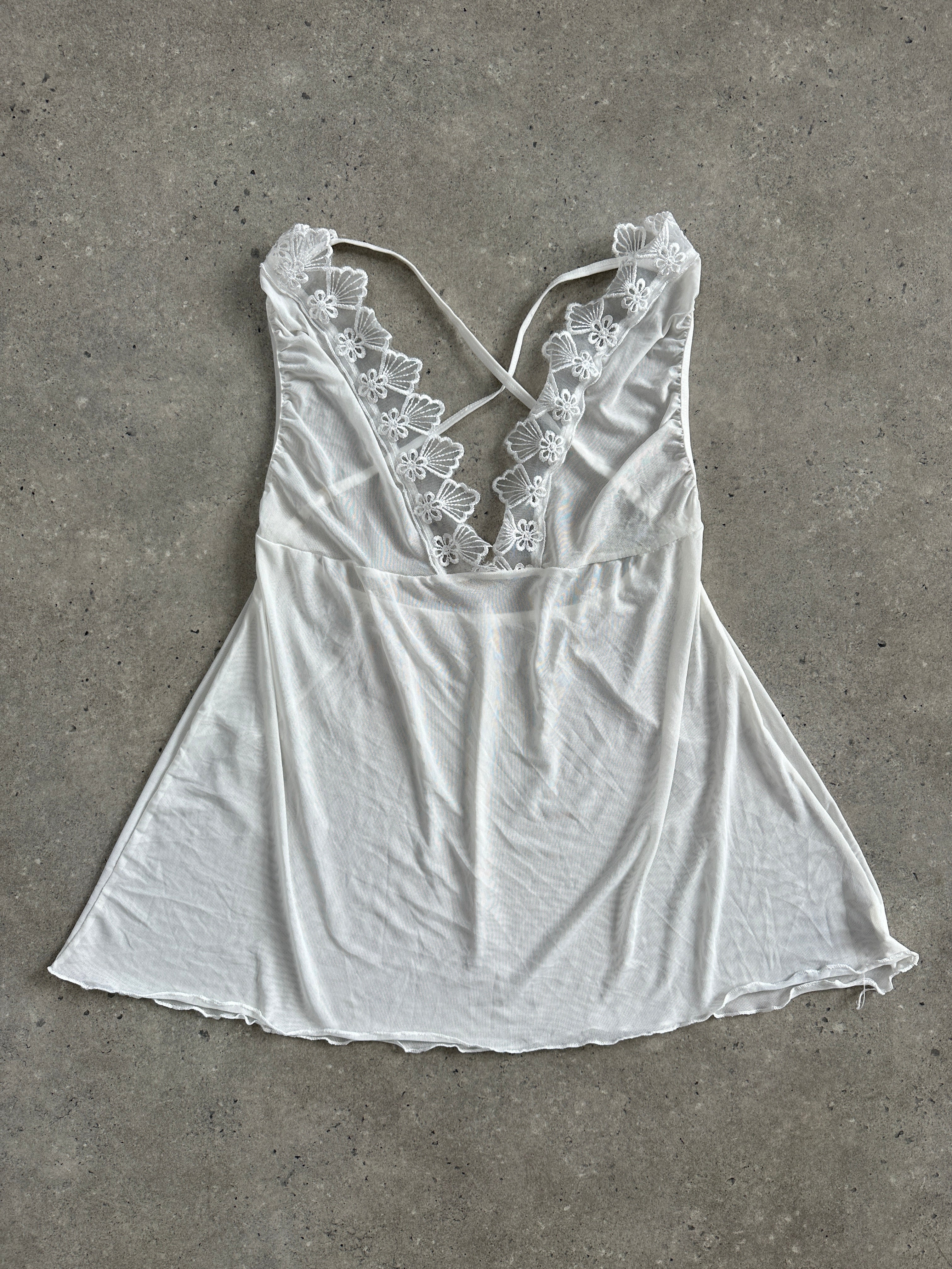 A sheer whisper of Y2K nostalgia, this white mesh slip top is framed with delicate floral lace and cut to a plunging silhouette that drapes effortlessly against the body. Lightweight and ethereal, it channels the era’s lingerie-inspired minimalism with a modern sense of ease.