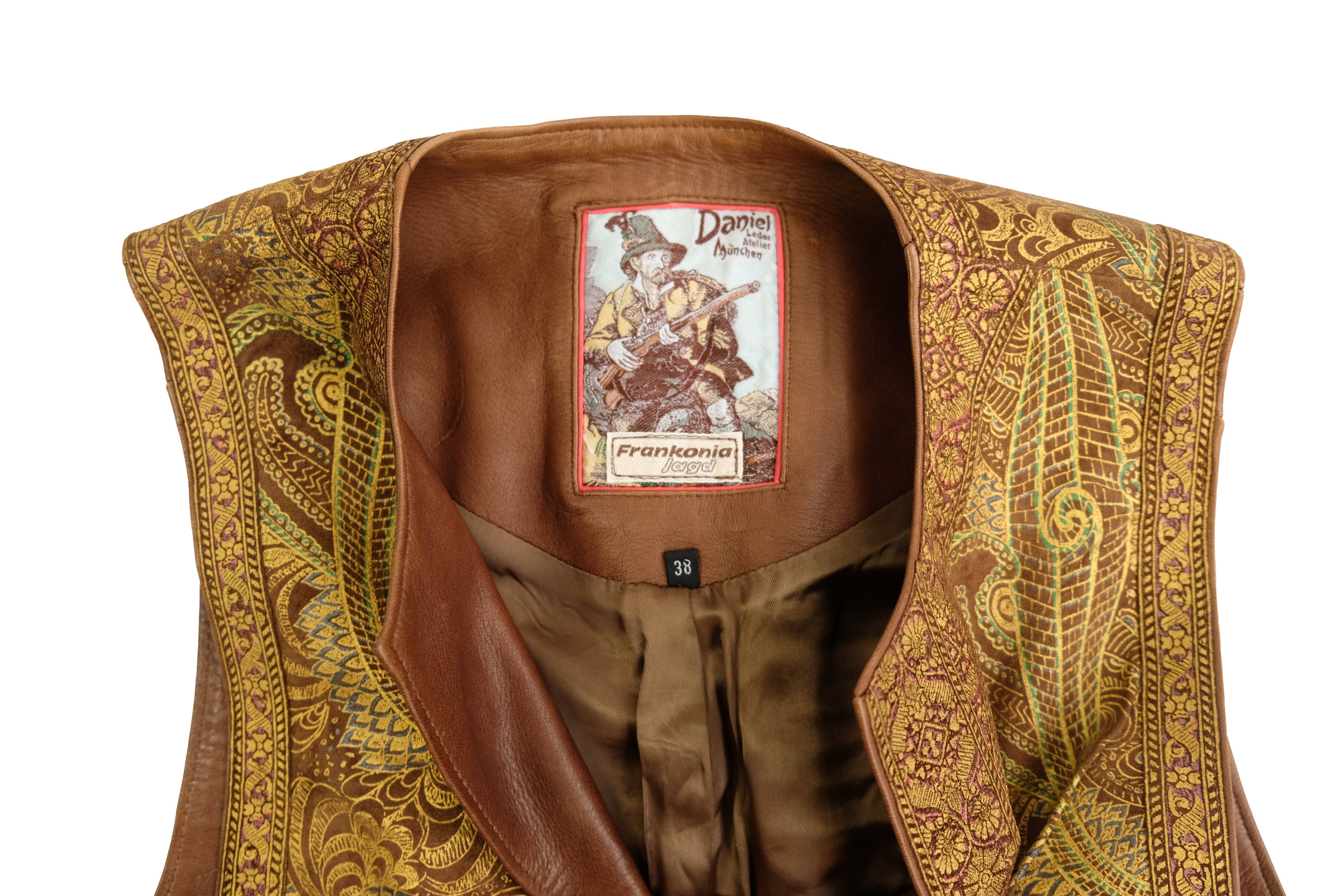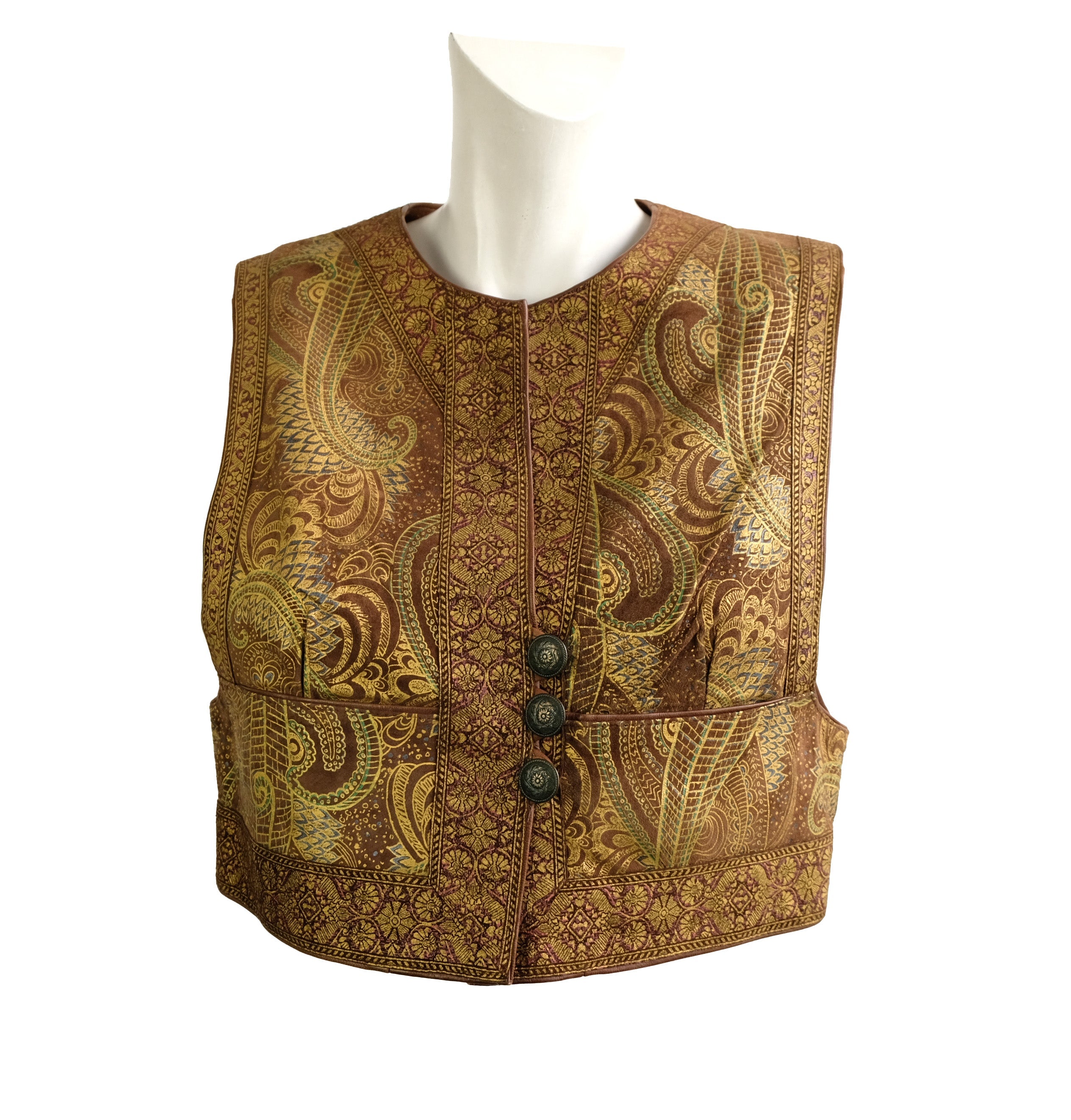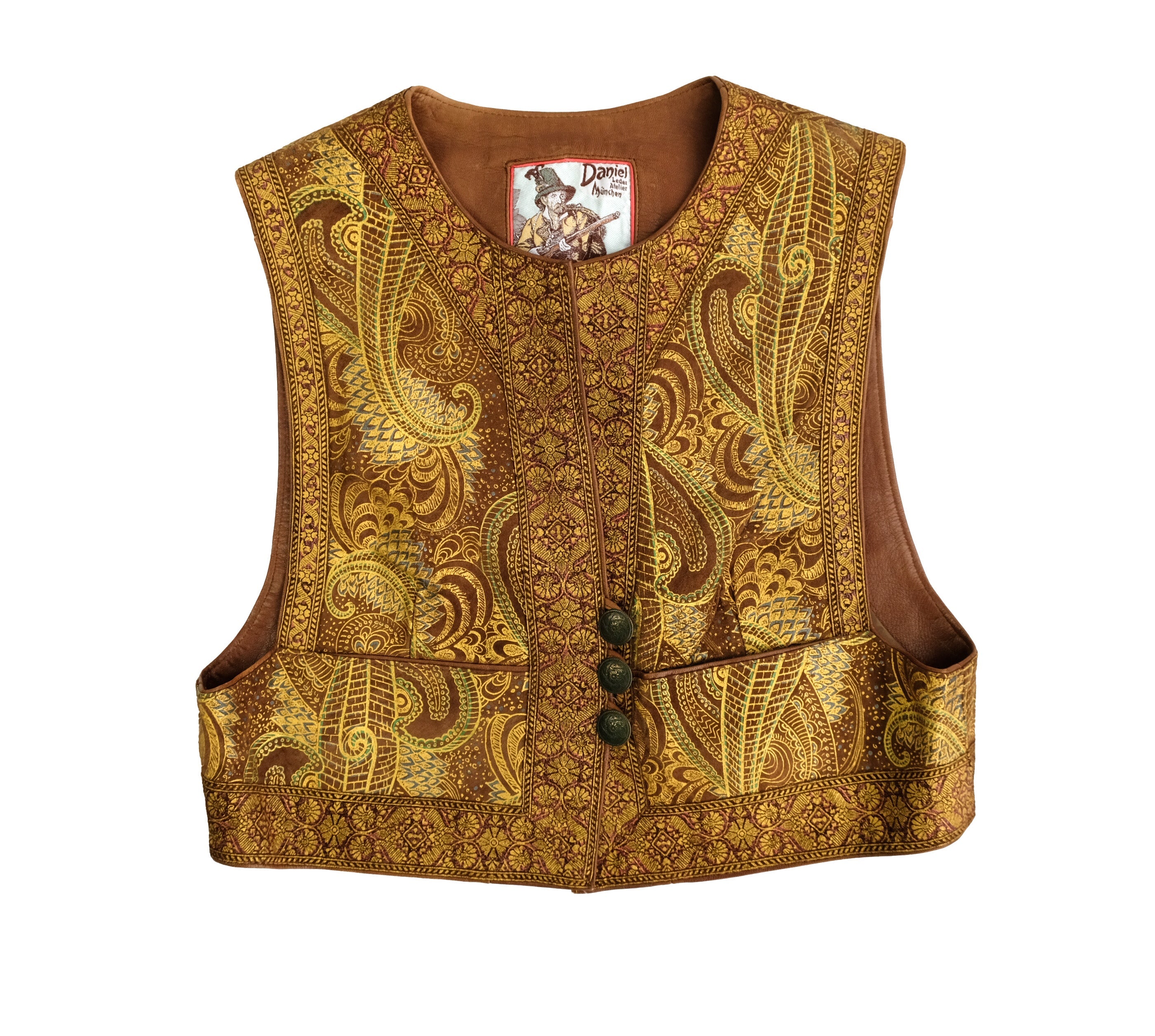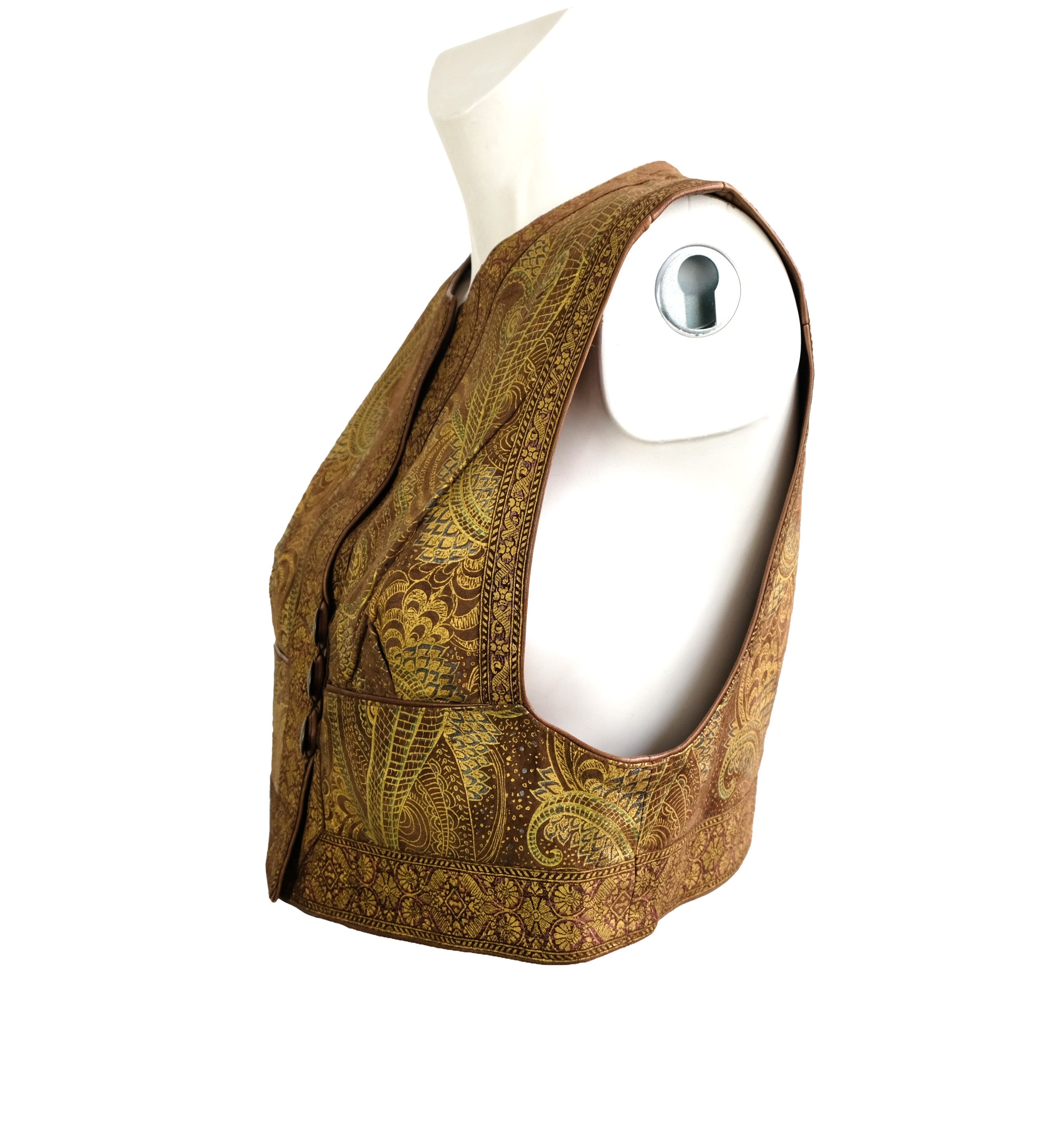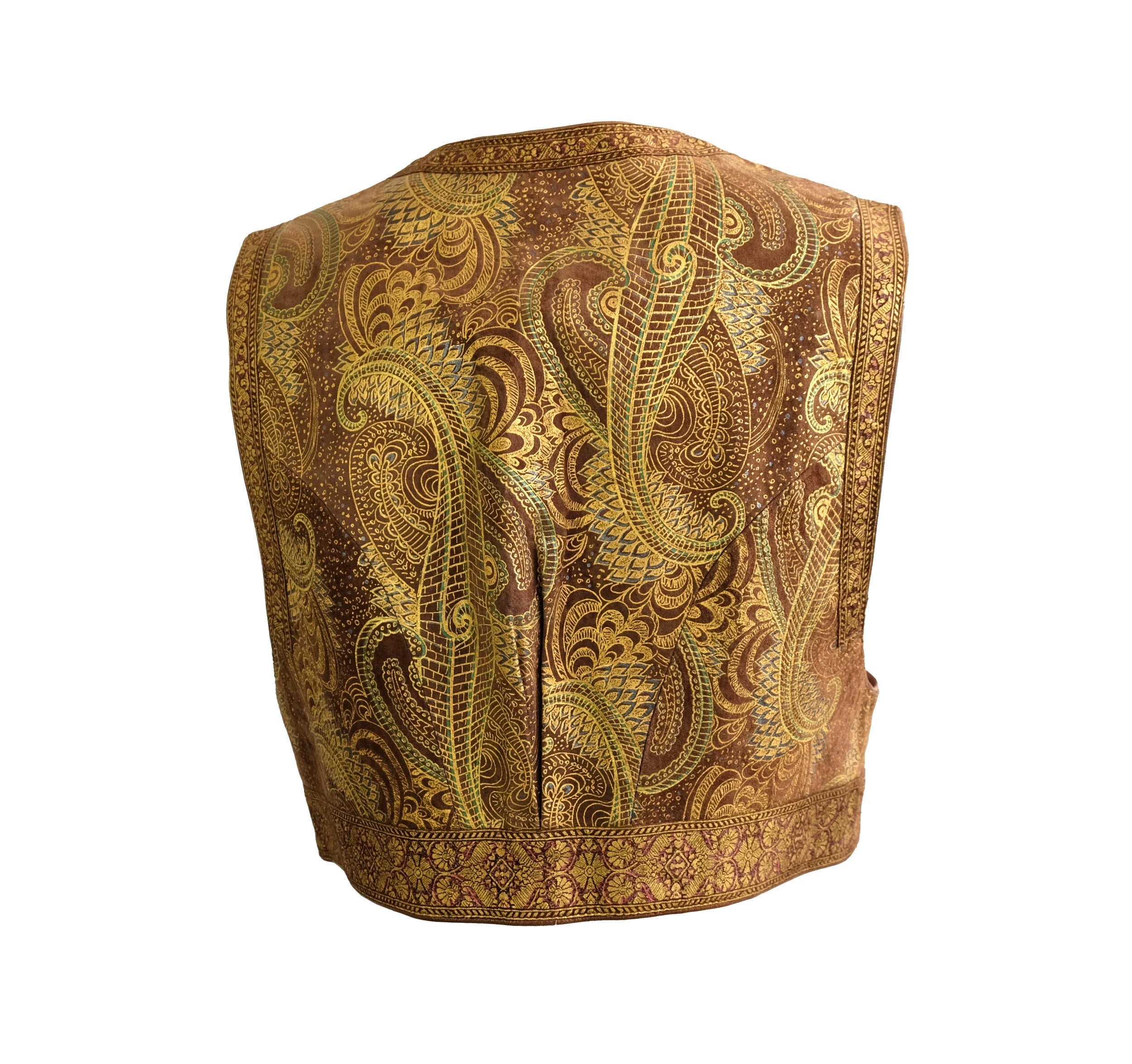 A fantastic and unique cropped waistcoat of unknown vintage in brown nubuck, exquisitely hand painted in delicate gold and green exotic paisley patterns.