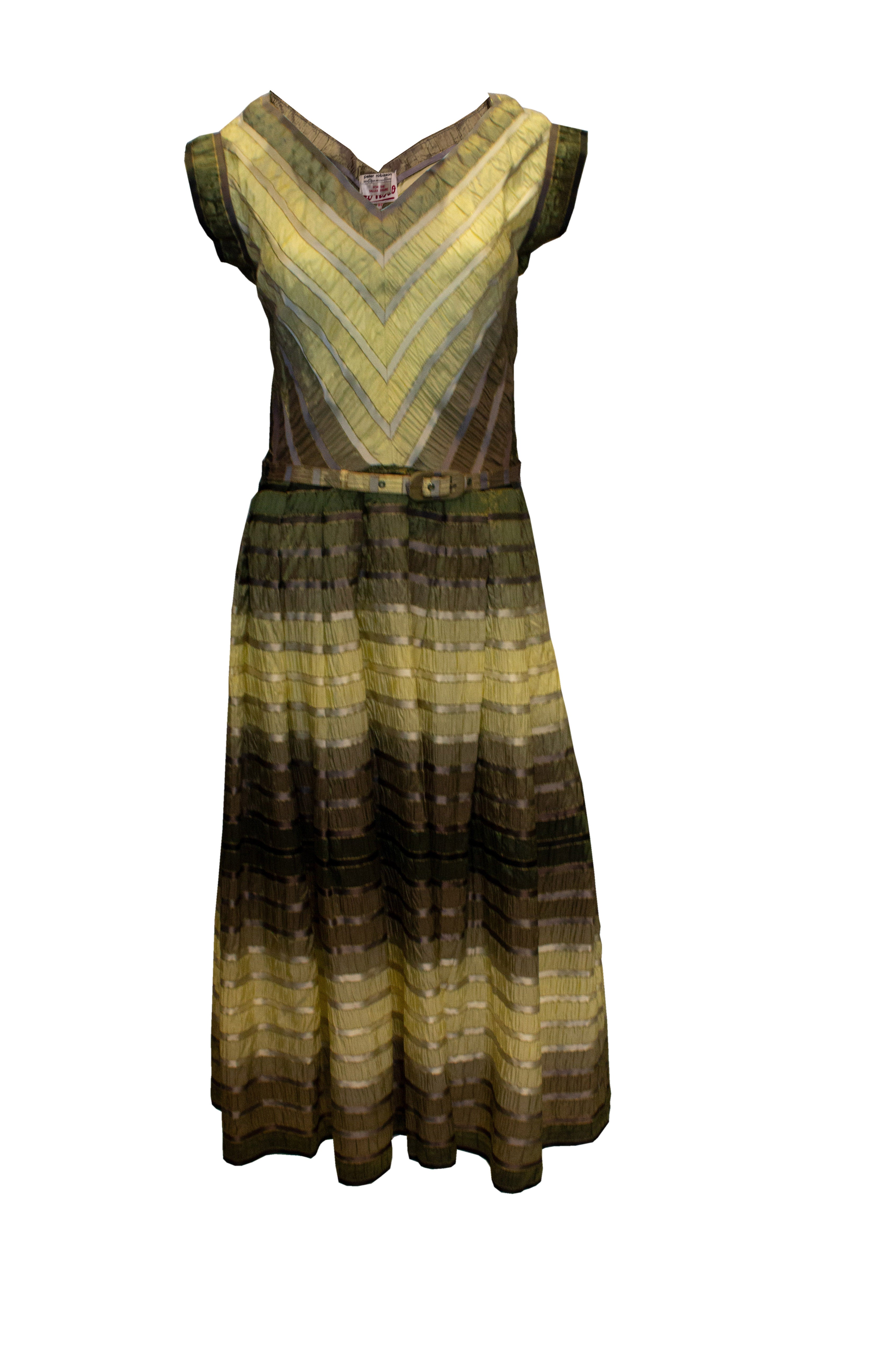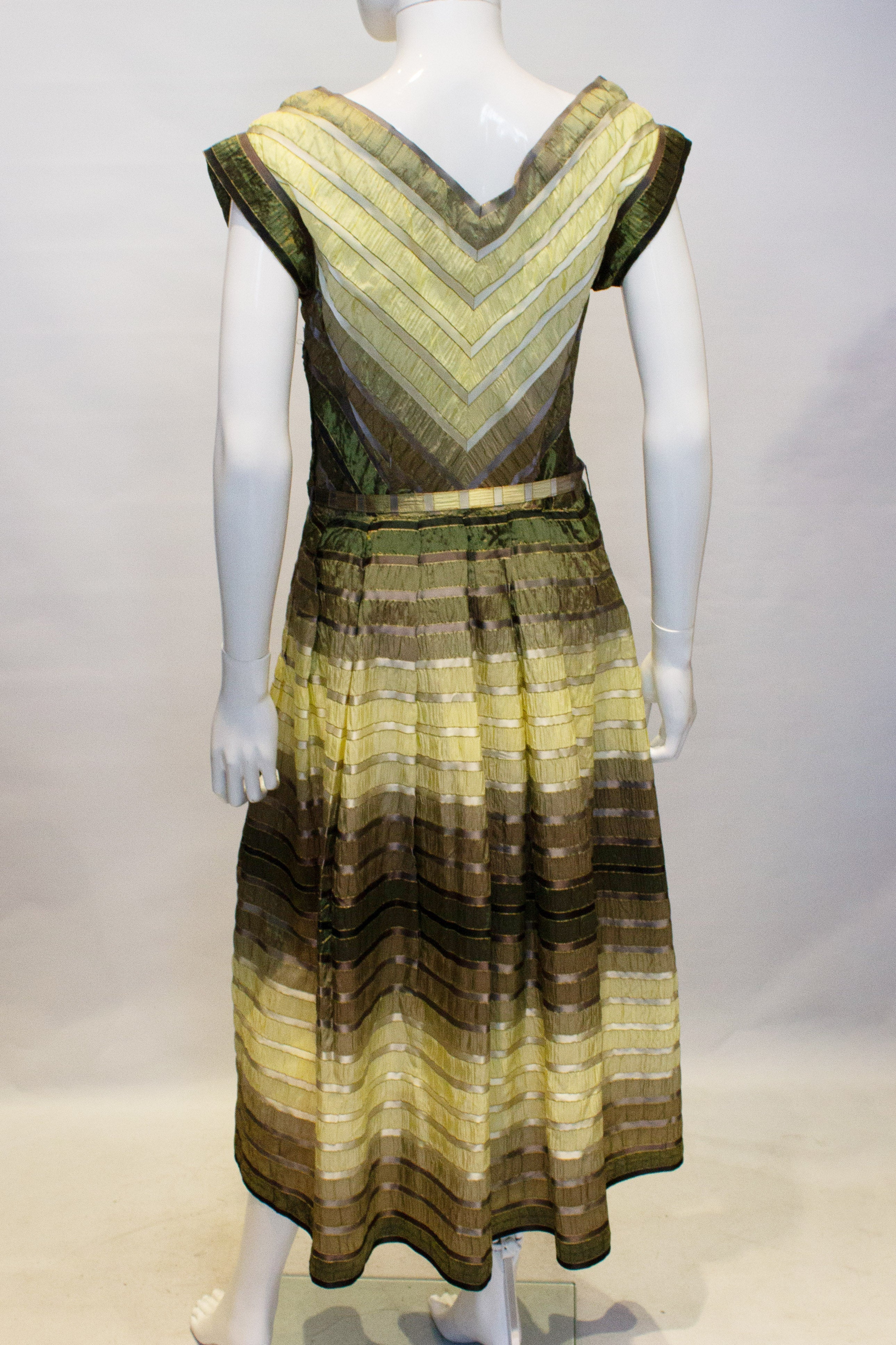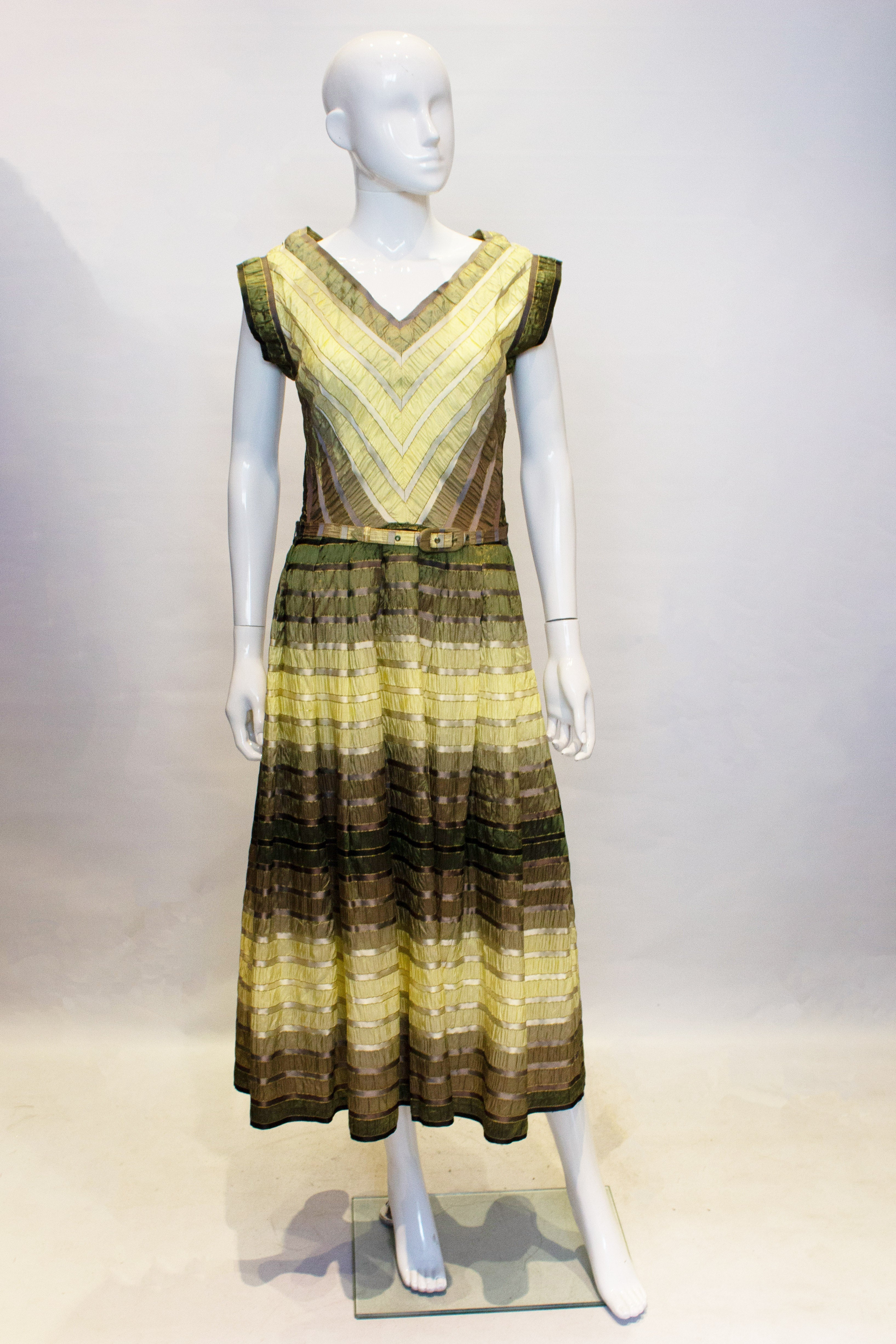 A colourful vintage cocktail dress by Peter Robinson. The dress is in a wonderful combination of colours, yellow, olive and ivory stripes with gold trim. It has a v neckline and backline, with a side zip opening and self fabric belt. Measurements : Bust 37'', waist 31'',length 51''