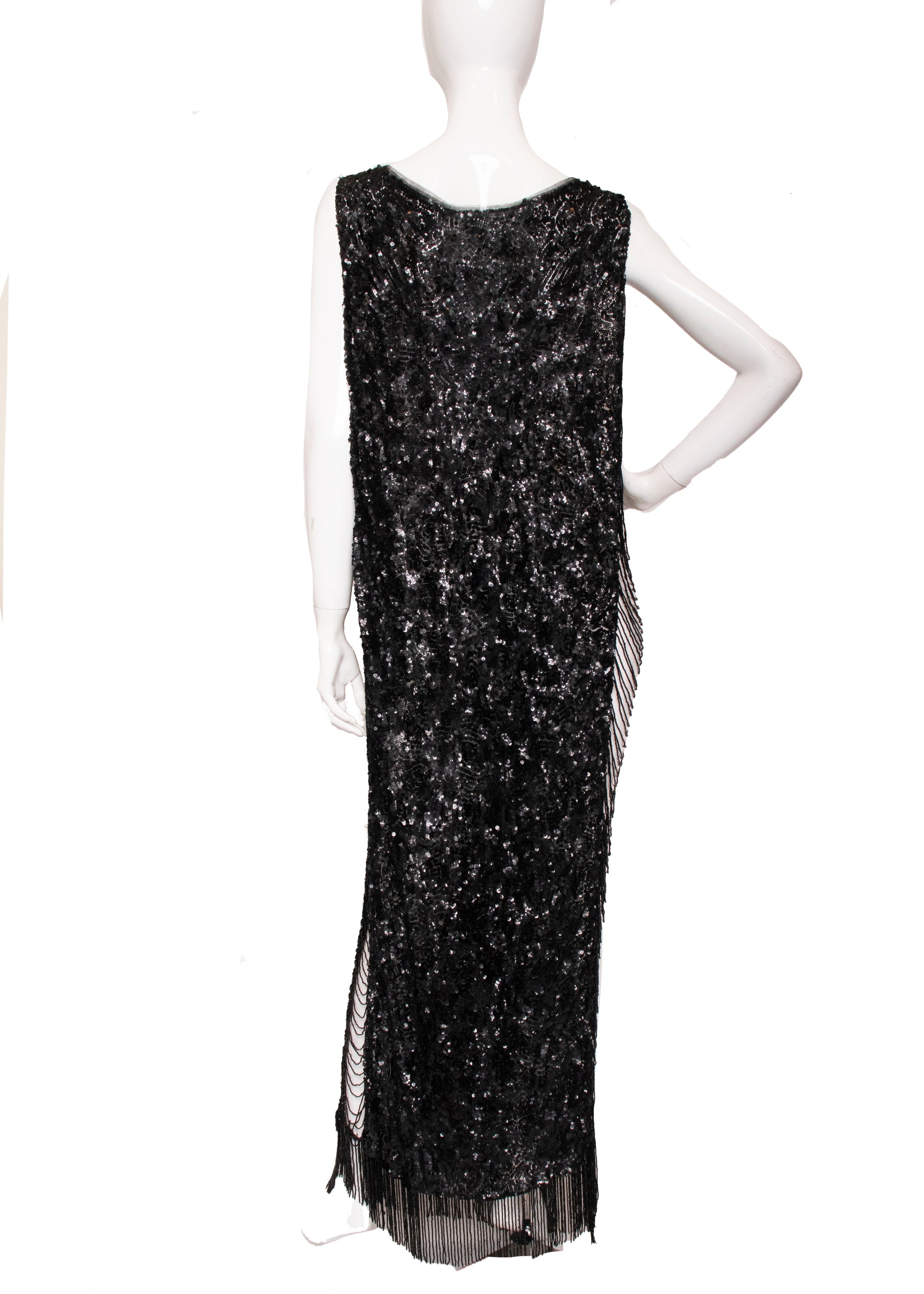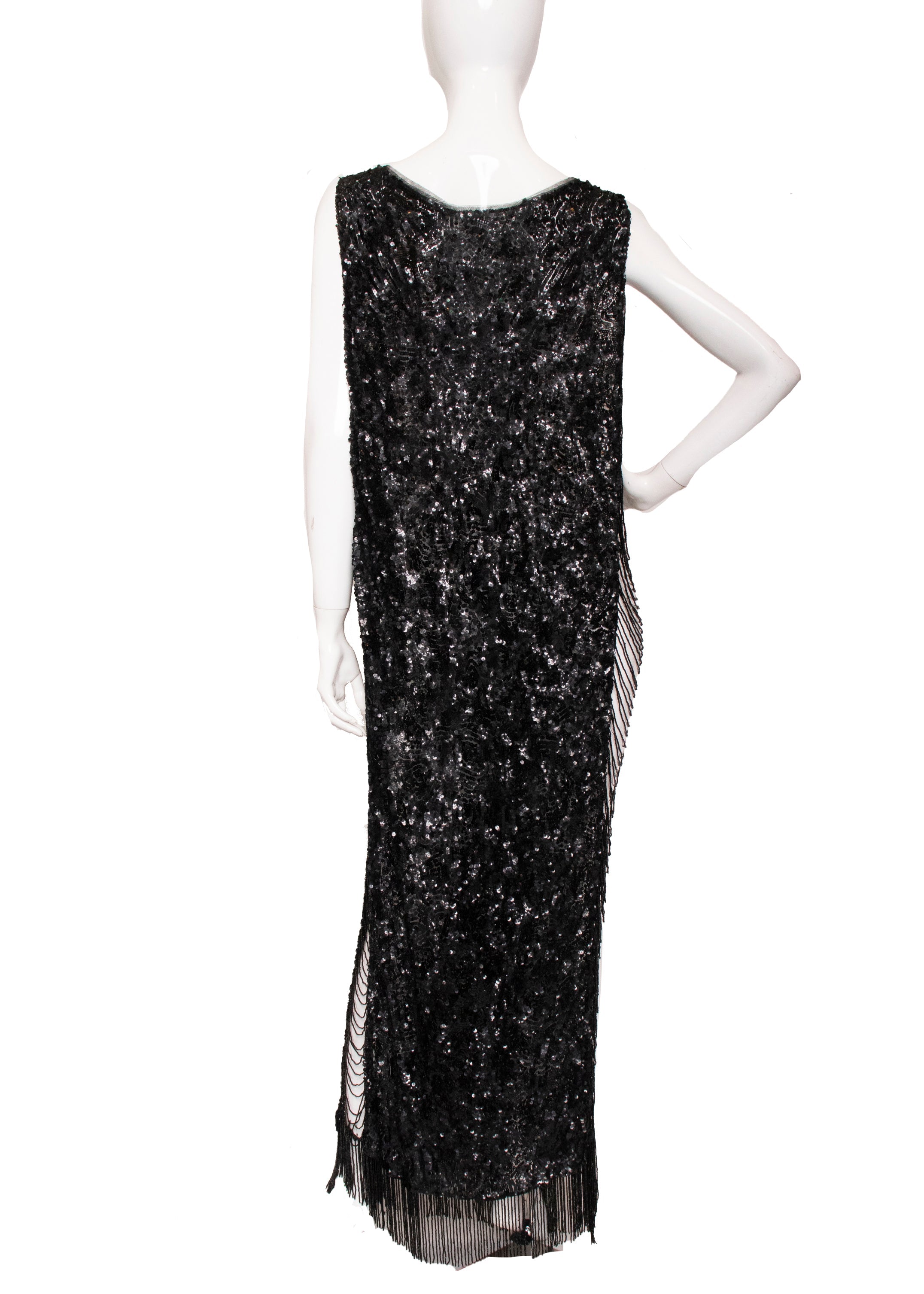 This Antique Black Sequin Cocktail Dress is truly exceptional, showcasing remarkable craftsmanship and quality that make it a standout favorite. It features two black sequin tank-style panels connected by strings of black beads along the sides. The sequined fabric is light, while the beads and hem add a captivating weight. Its simple silhouette allows for easy alterations, and the signature open sides offer endless styling possibilities to make it uniquely yours.