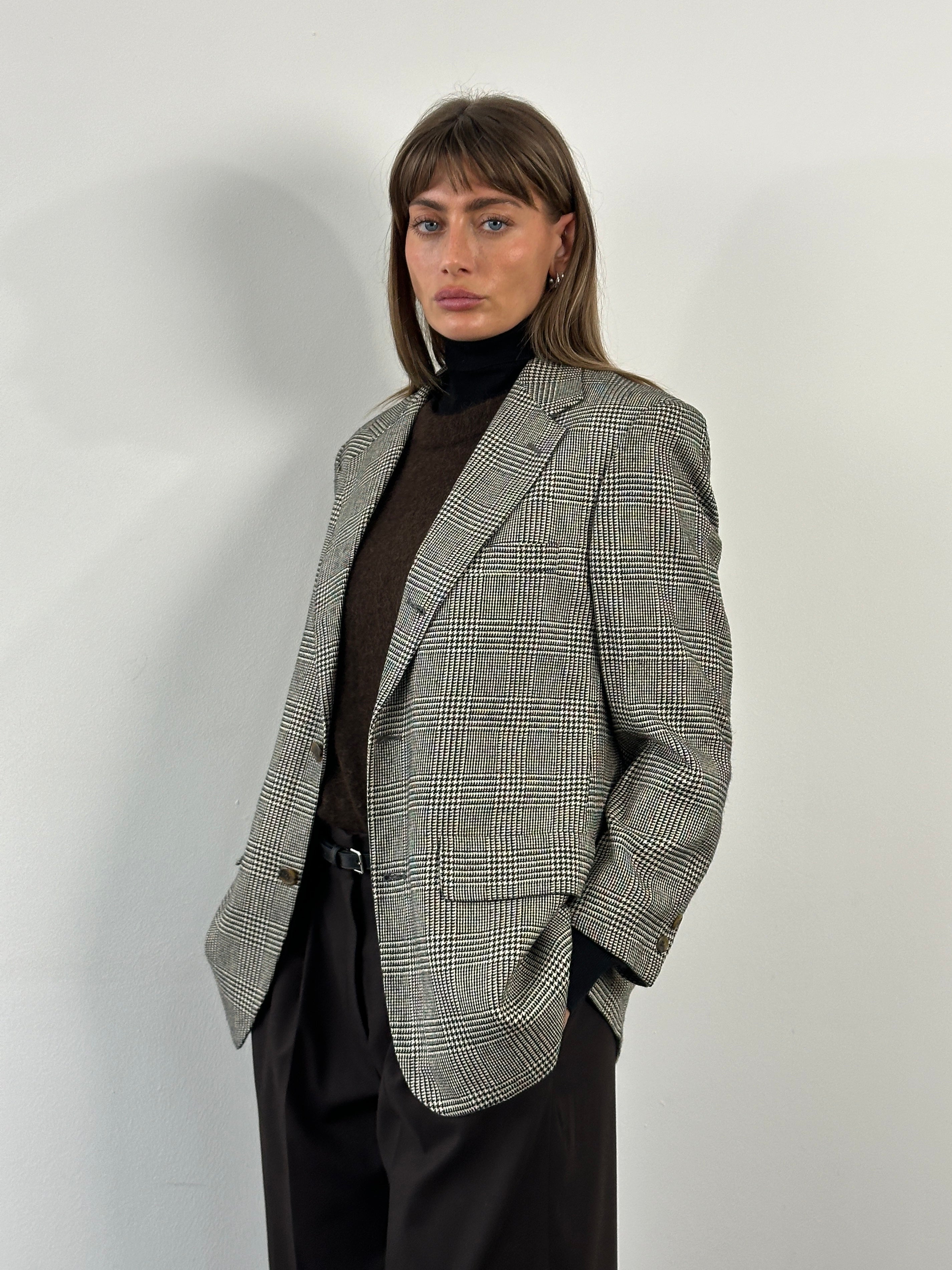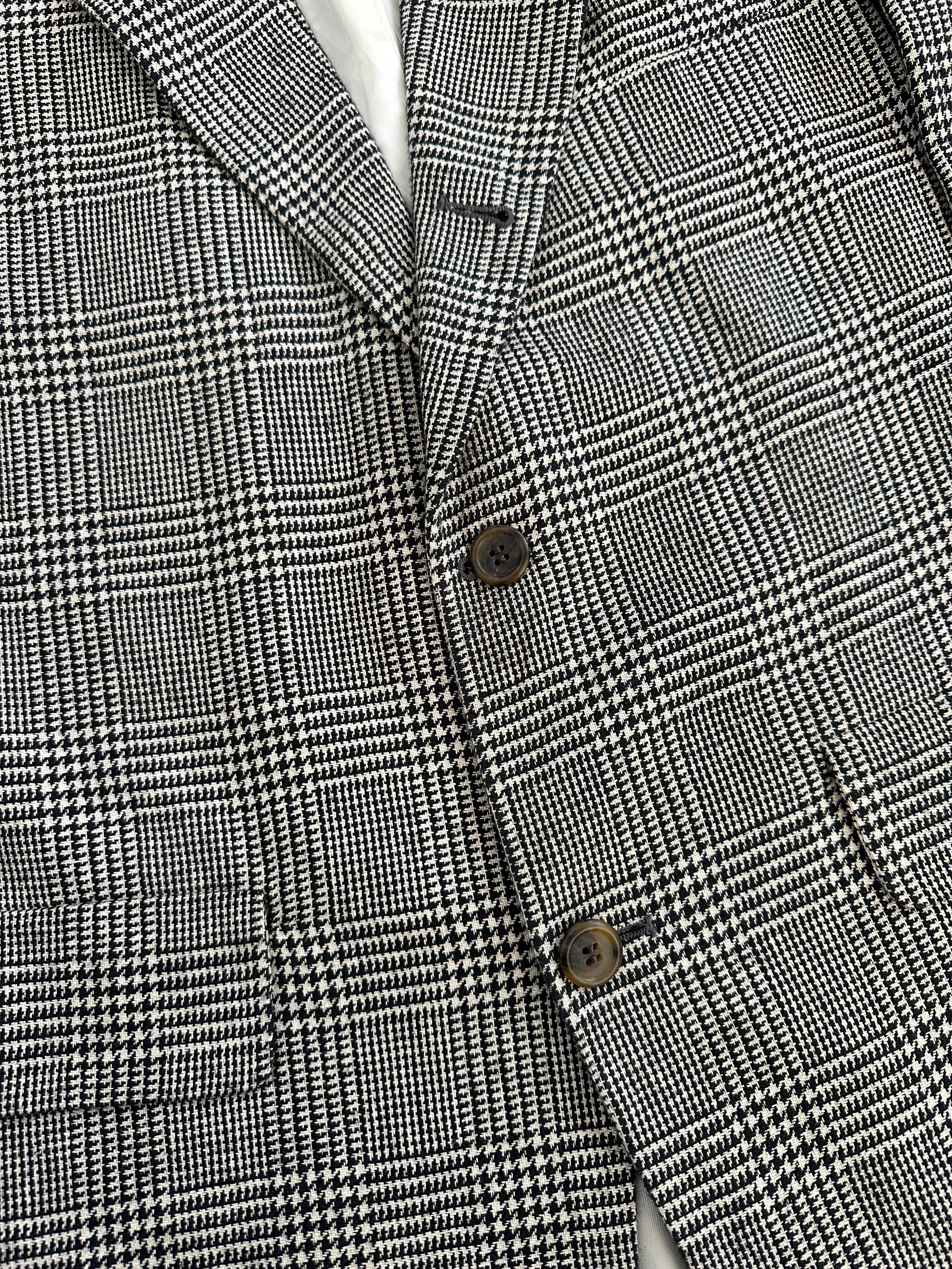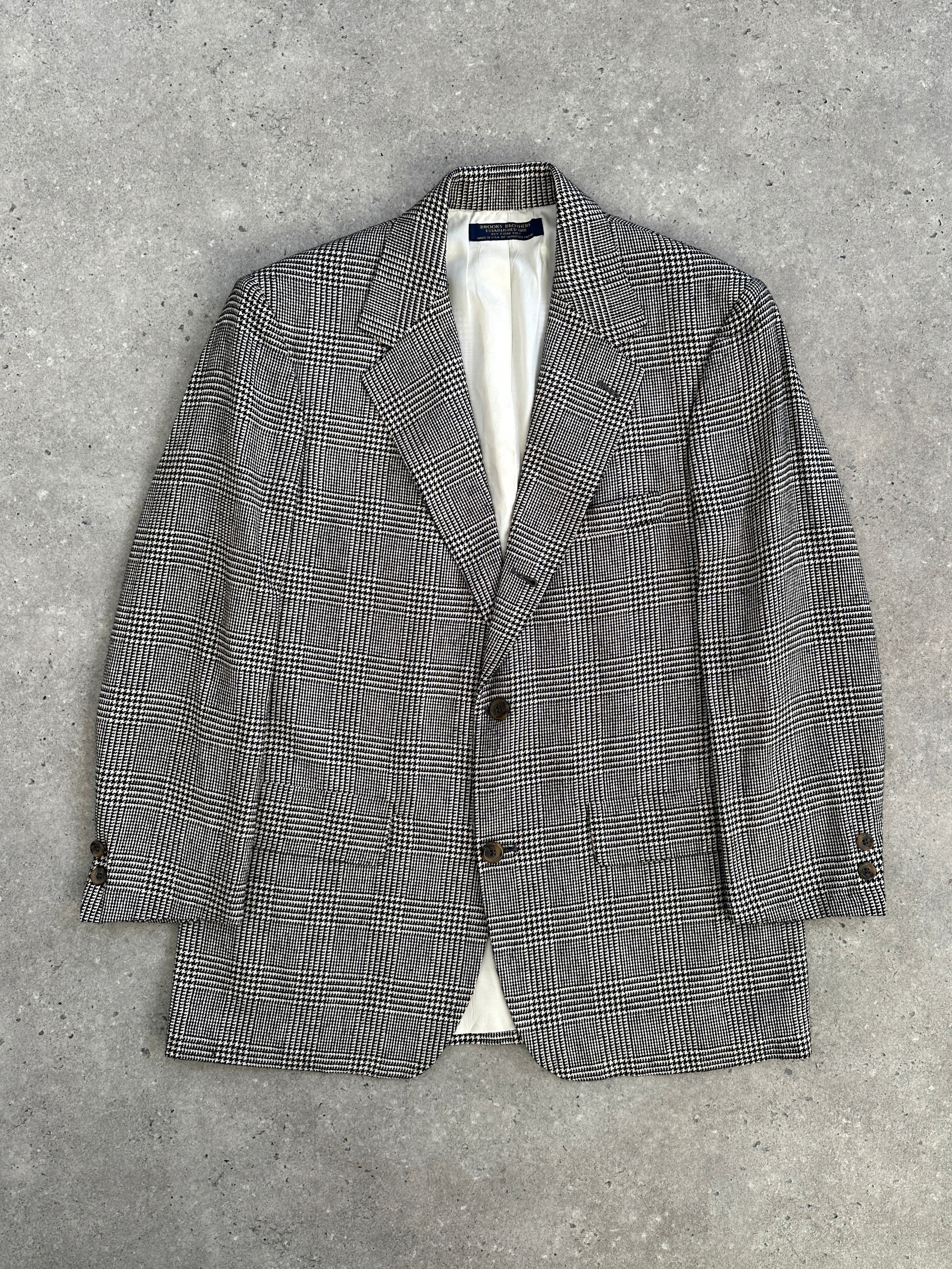 A classic 1990s Brooks Brothers single breasted blazer in a refined black and beige check, featuring a 100% silk lining, softly structured silhouette and traditional American tailoring.