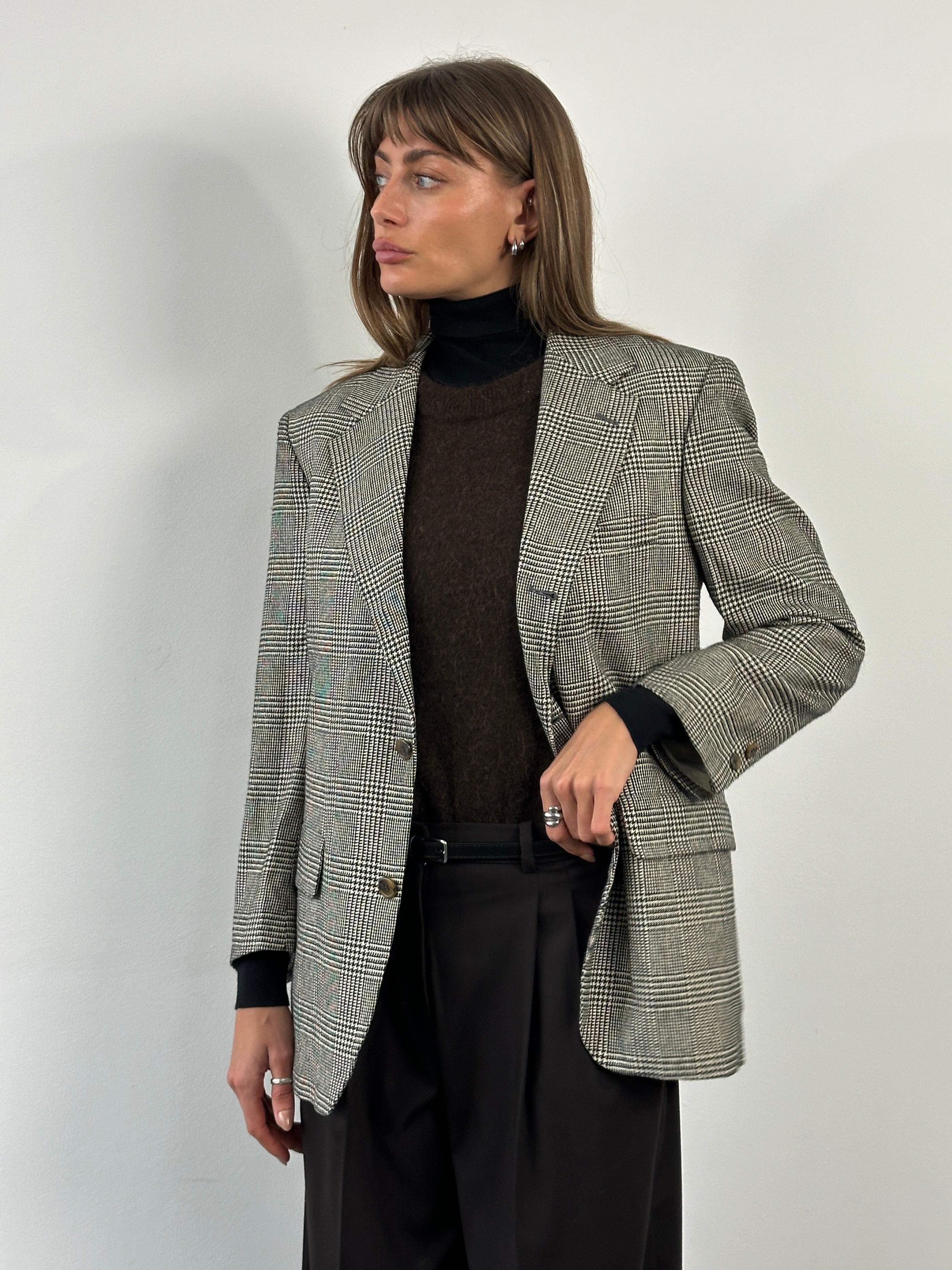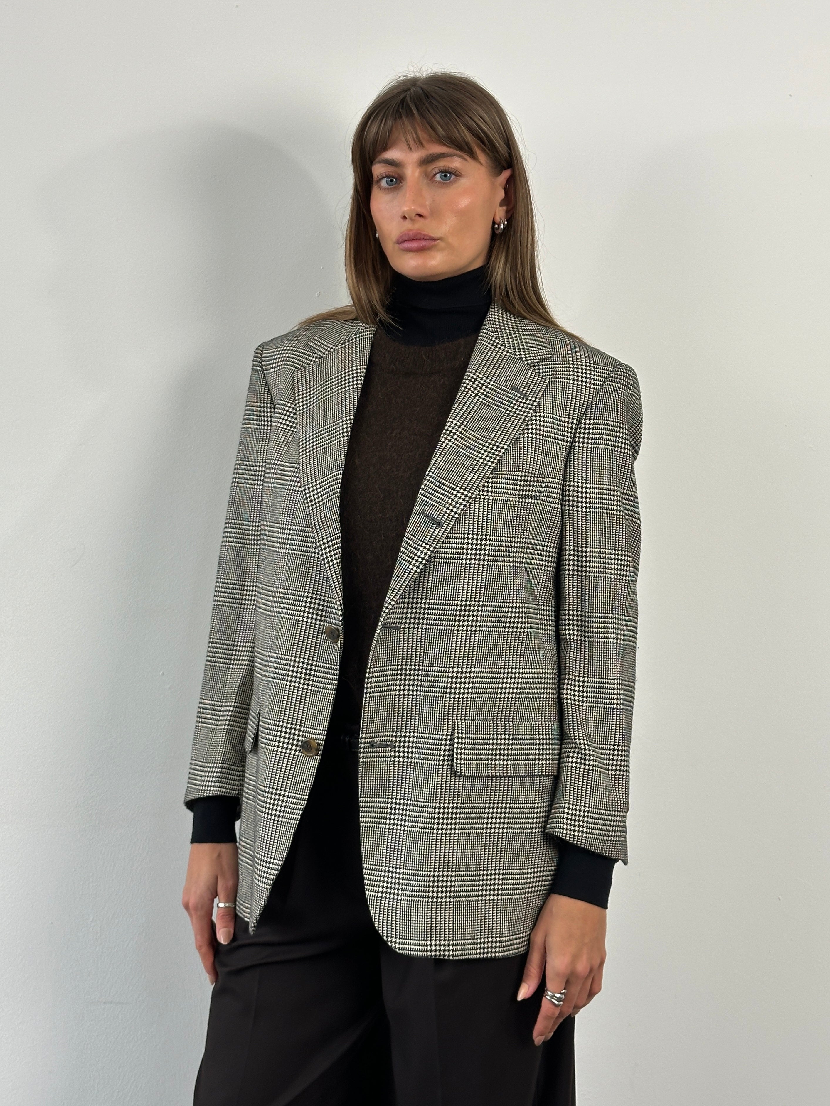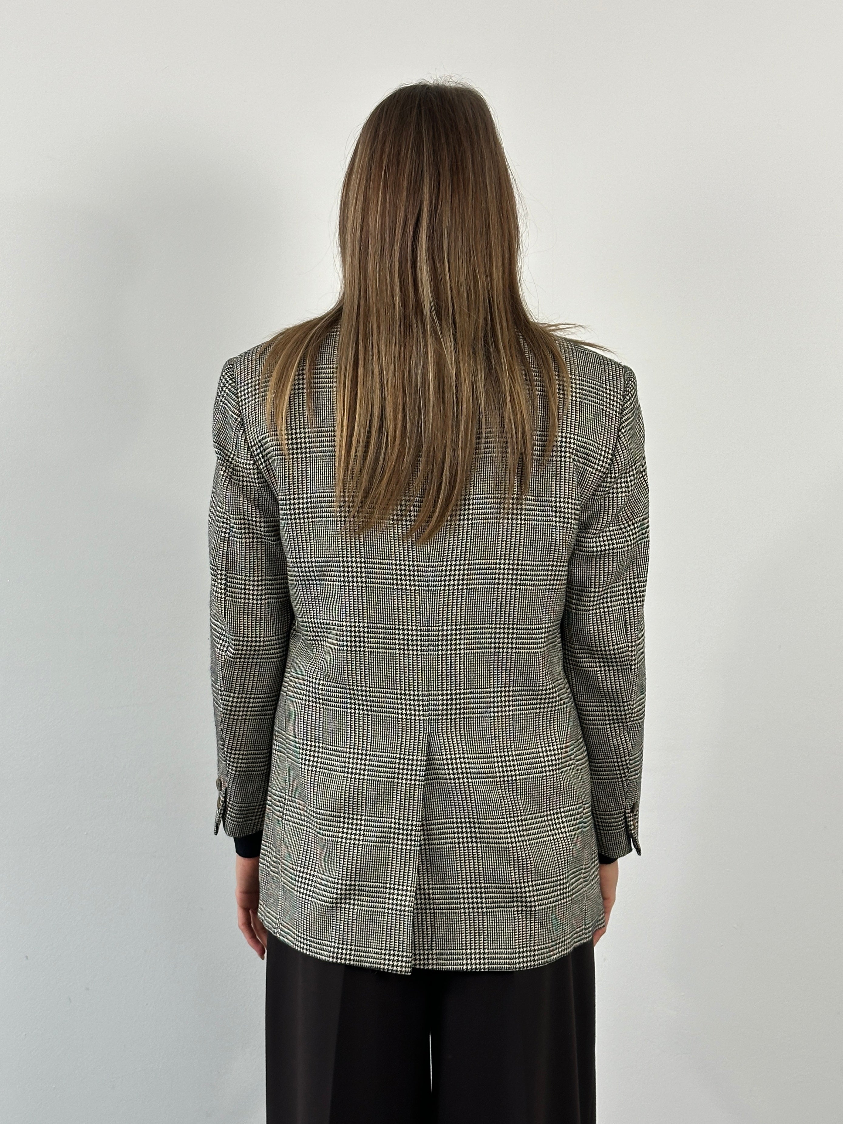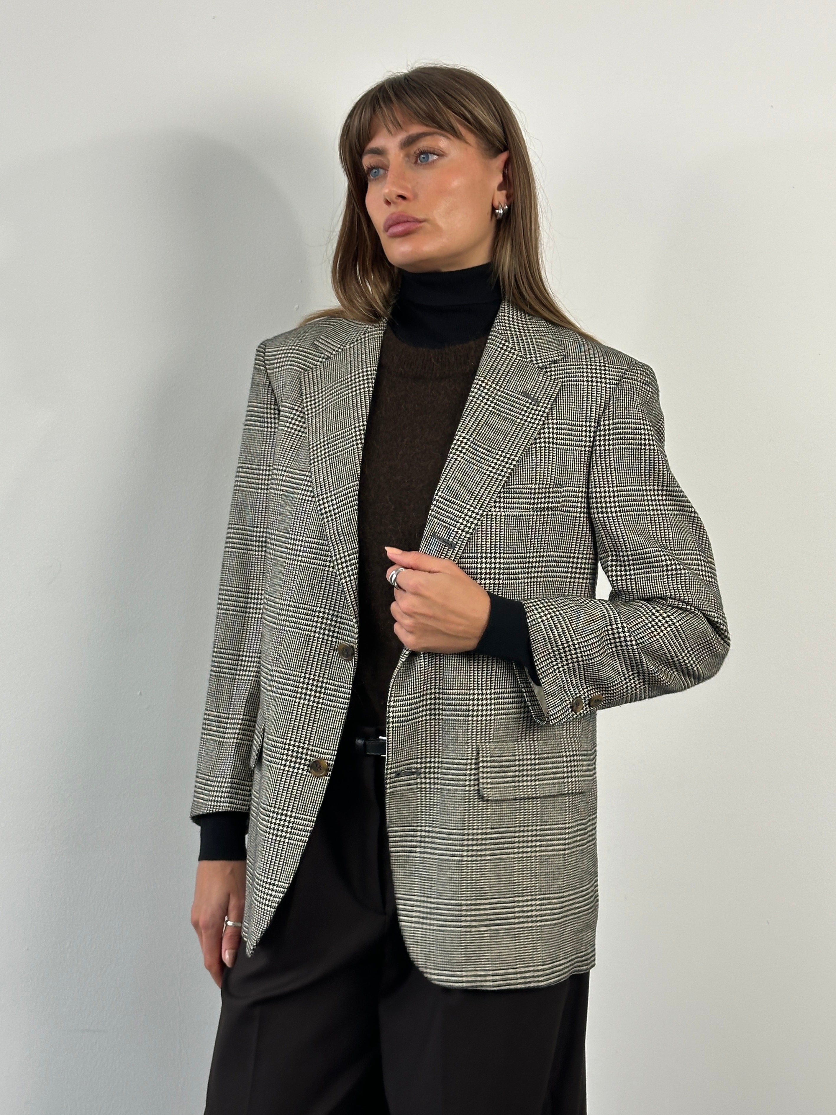 A classic 1990s Brooks Brothers single breasted blazer in a refined black and beige check, featuring a 100% silk lining, softly structured silhouette and traditional American tailoring.