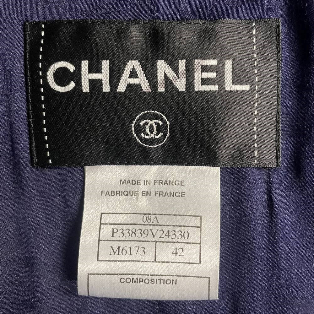 2000s Chanel blue herringbone wool jacket. Classic collar with trimming and decorative buttons. Front logoed button fastening and two patch pockets. Year: 2008
