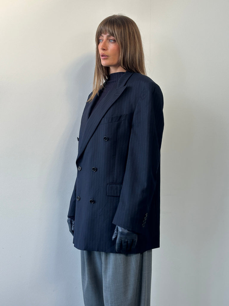 Vintage Daniel Cremieux double-breasted blazer in a deep navy tone with a refined pinstripe, crafted from pure Loro Piana wool and tailored for Dillard’s. A structured 1990s silhouette with sharp lapels and understated American luxury detailing.