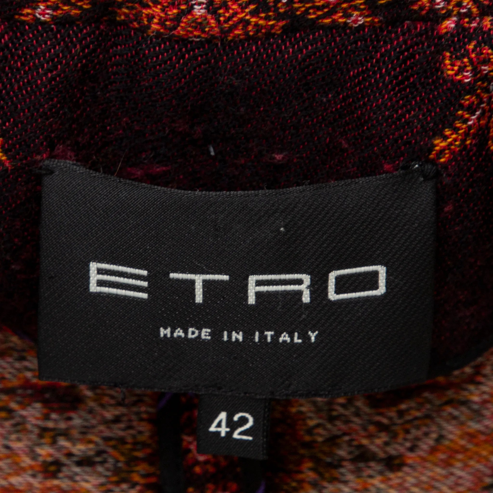 Etro Fall 2019 long wool coat in rich paisley print. Unlined with an open front and lapel collar, showcasing Etro’s signature bohemian elegance.