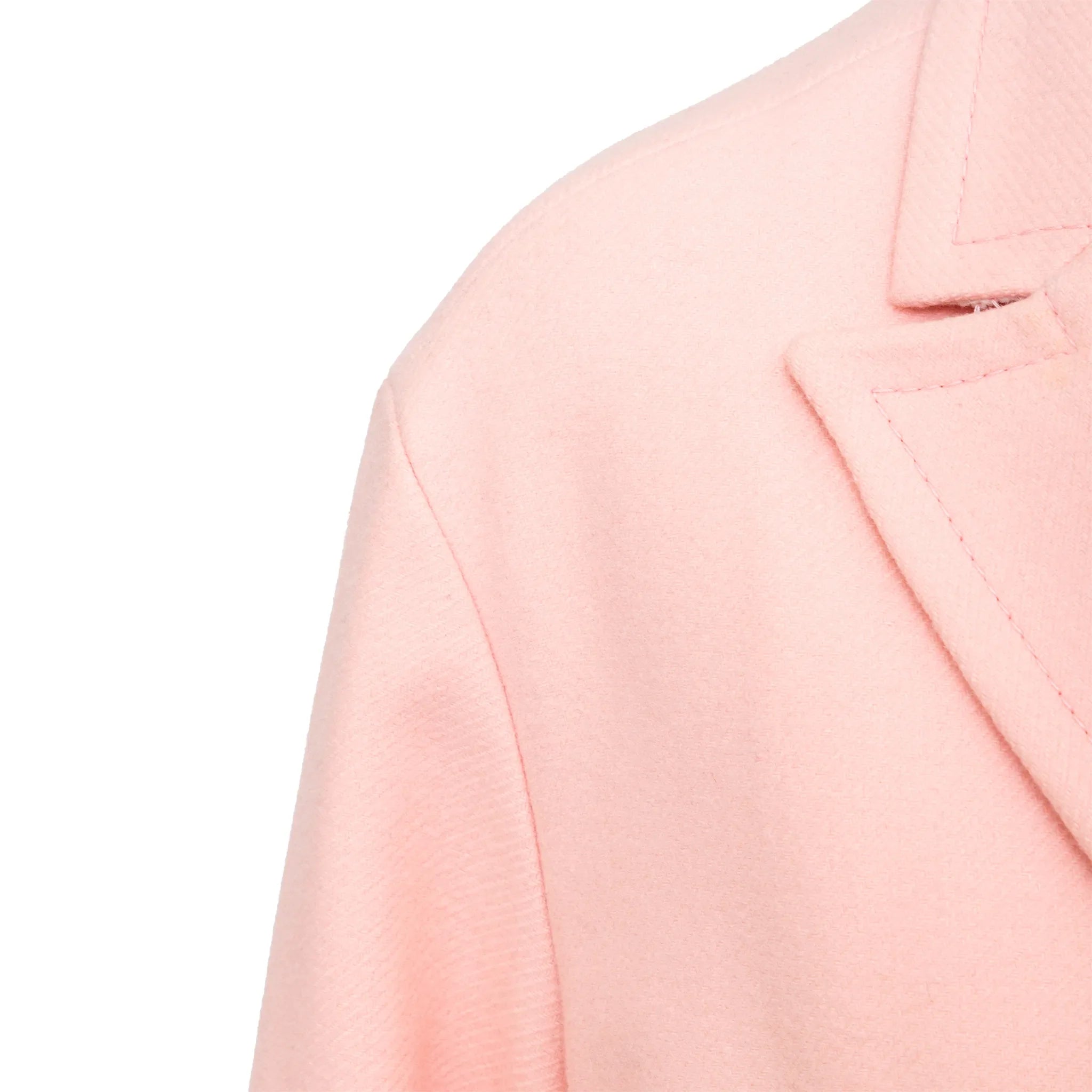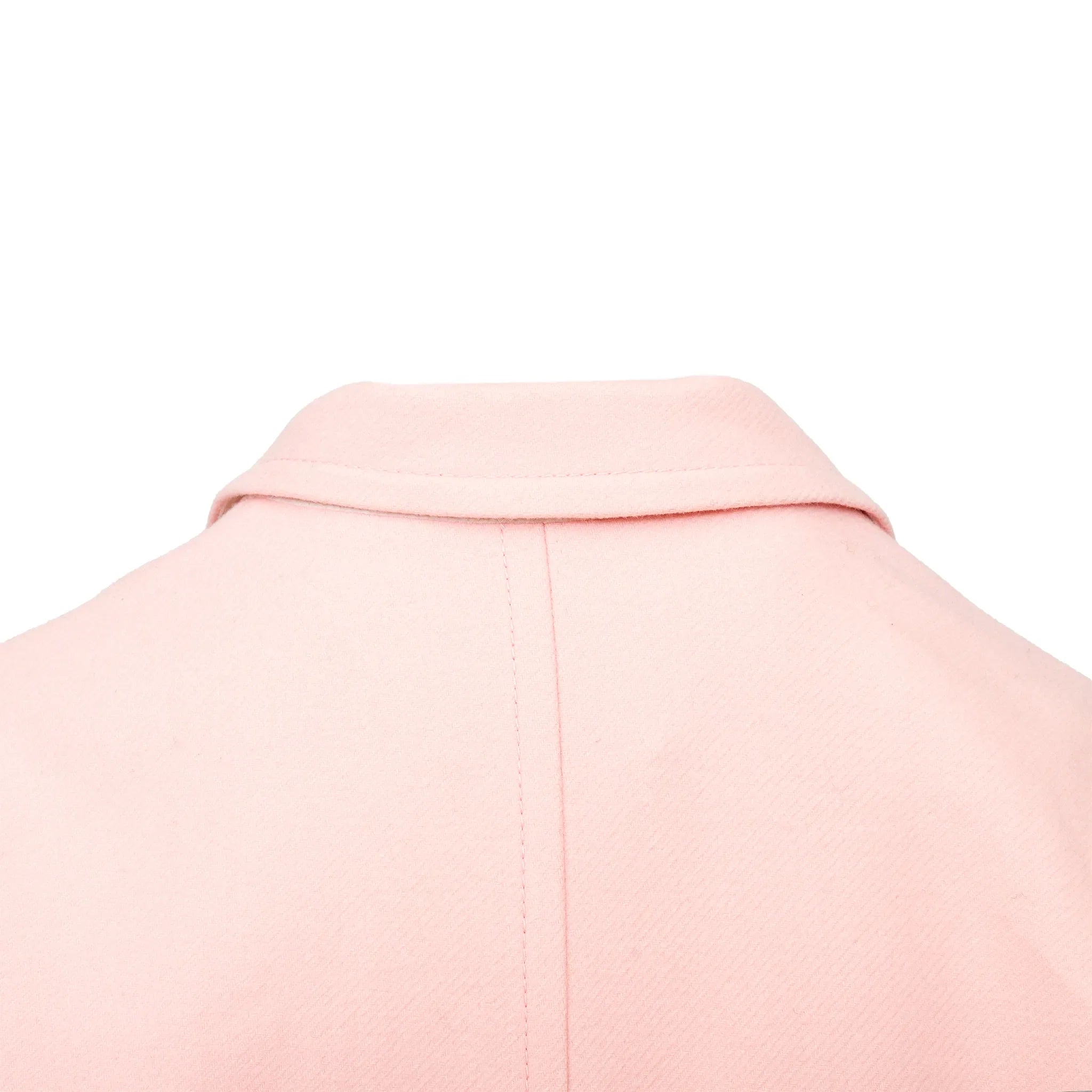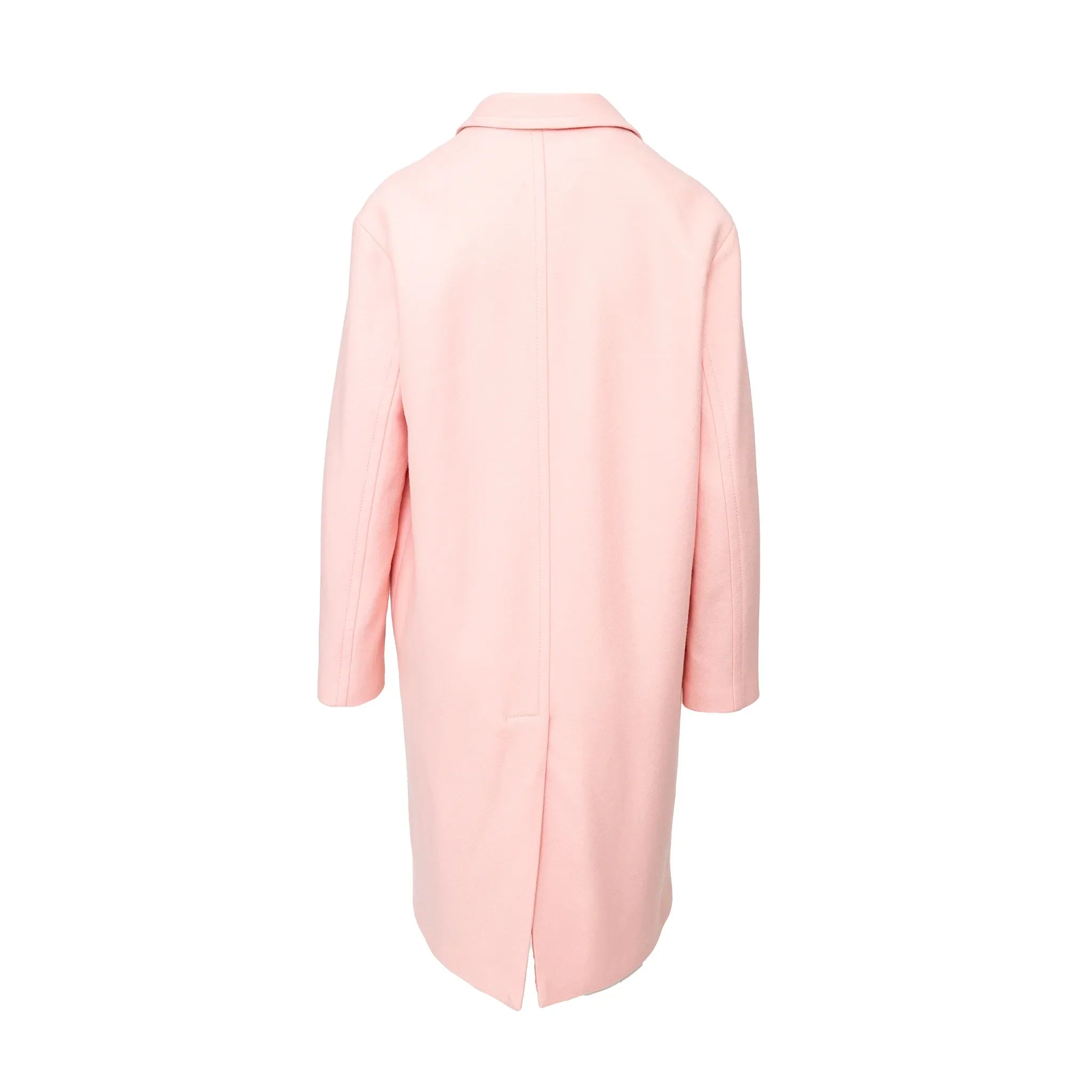 Iceberg long coat in soft pink virgin wool blend features a relaxed fit, star-shaped snap buttons, classic lapel collar, and smooth acetate lining for comfort.