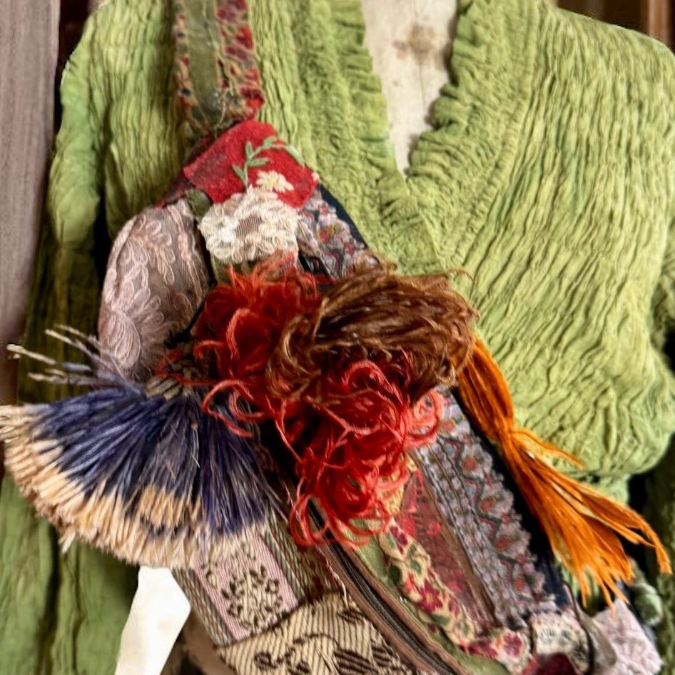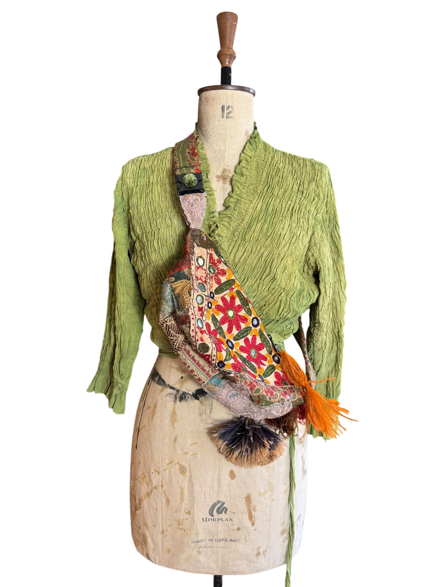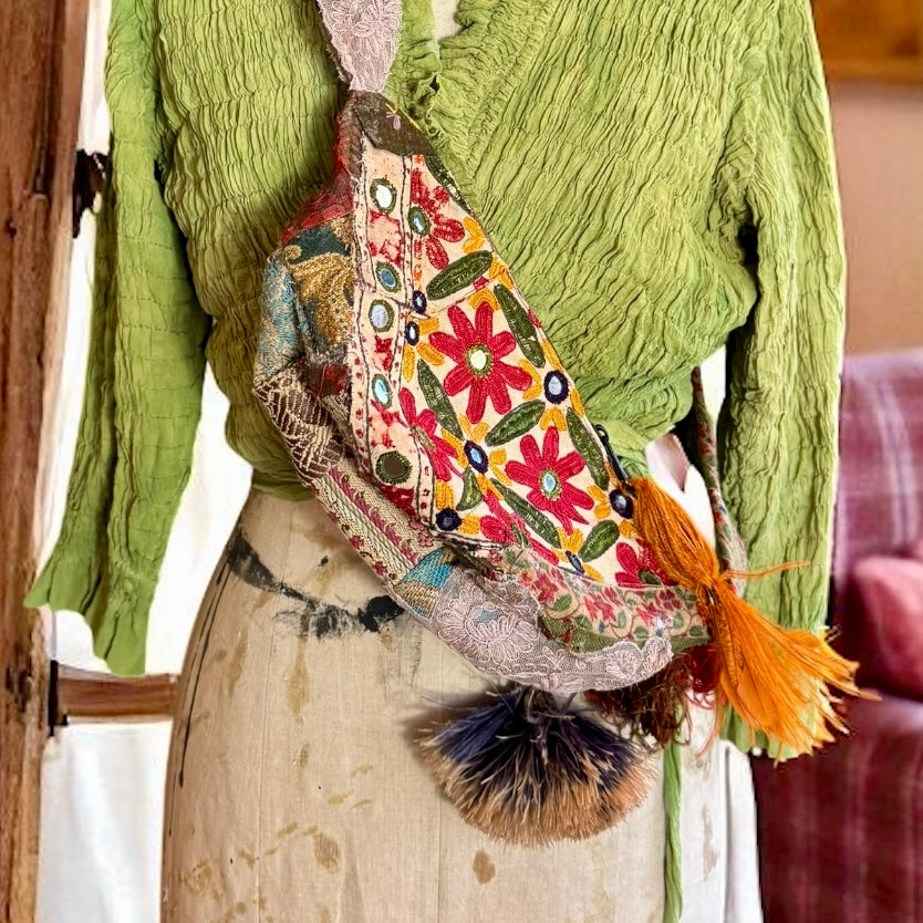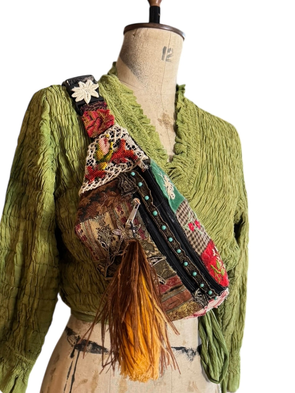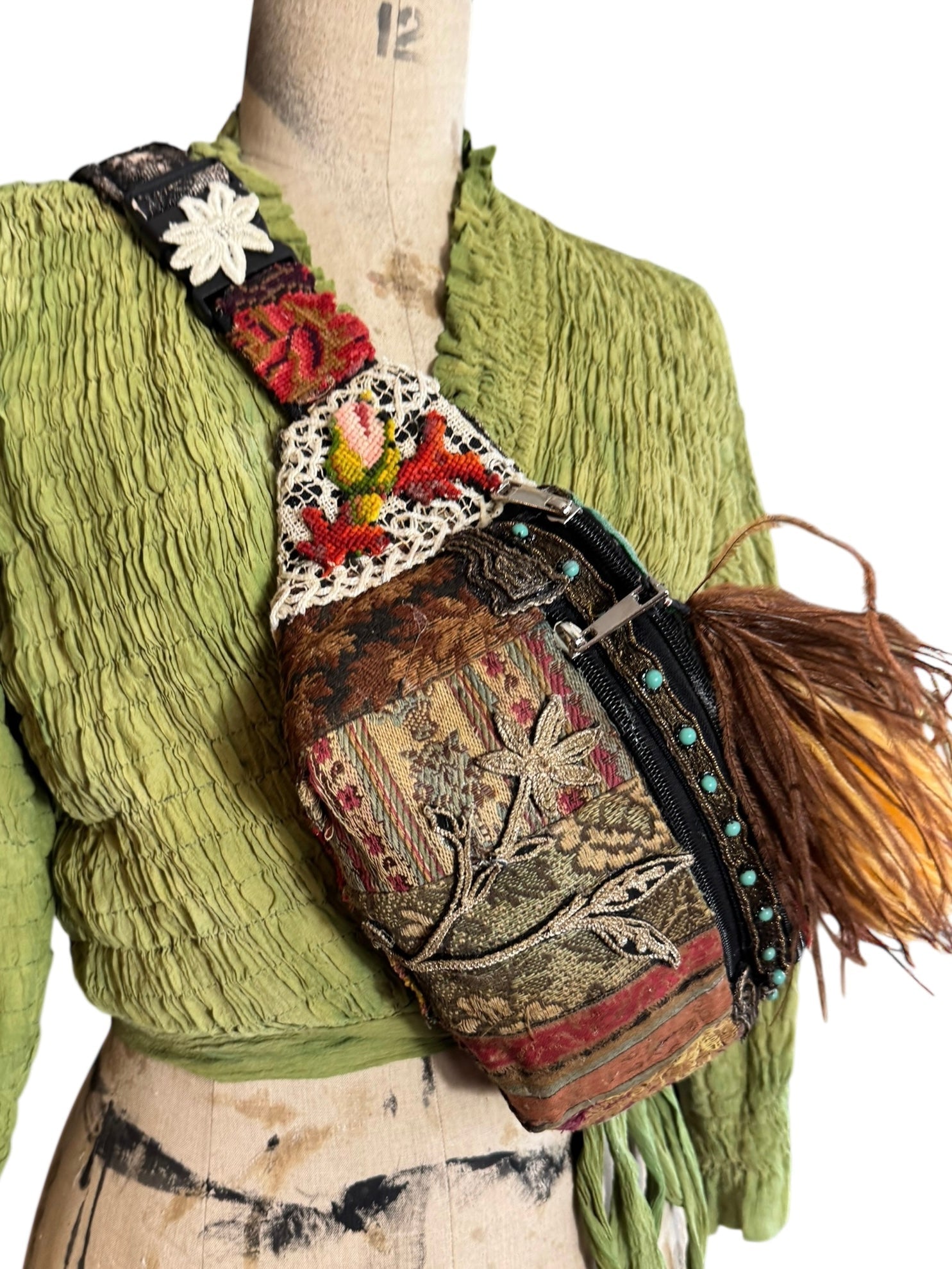 Introducing the ultimate reworked 80s crossbody bag. Waterproof with a 3 pocket design and adjustable strap, it's practical and an every day dog walking or errand bag Has been Patch-worked with beautiful Edwardian fabrics and finished with a 20s Austrich fold and brown feather zip design, this fanny pack elevates any casual outfit. Say goodbye to unattractive everyday items and hello to one-off covetable pieces.