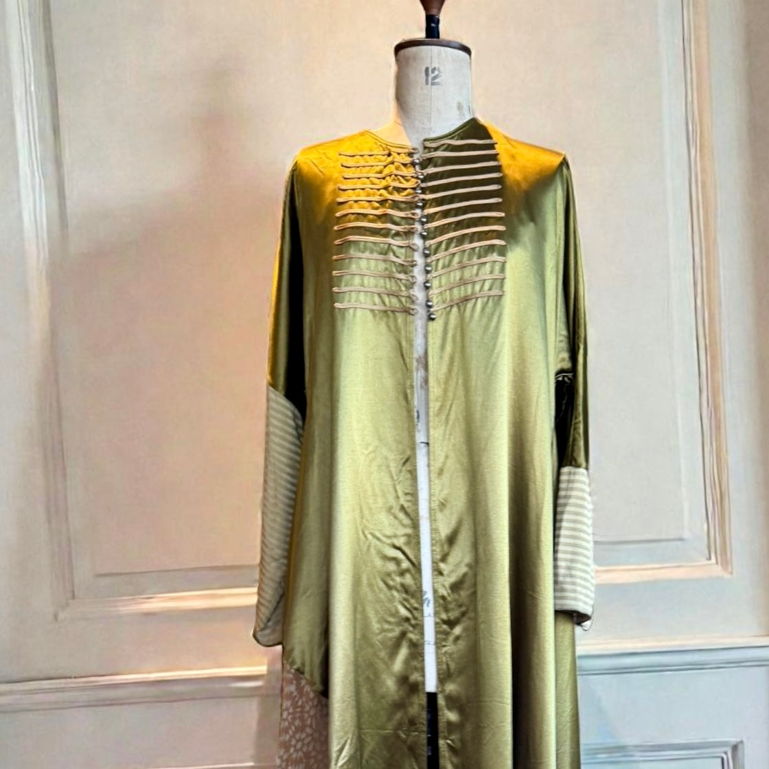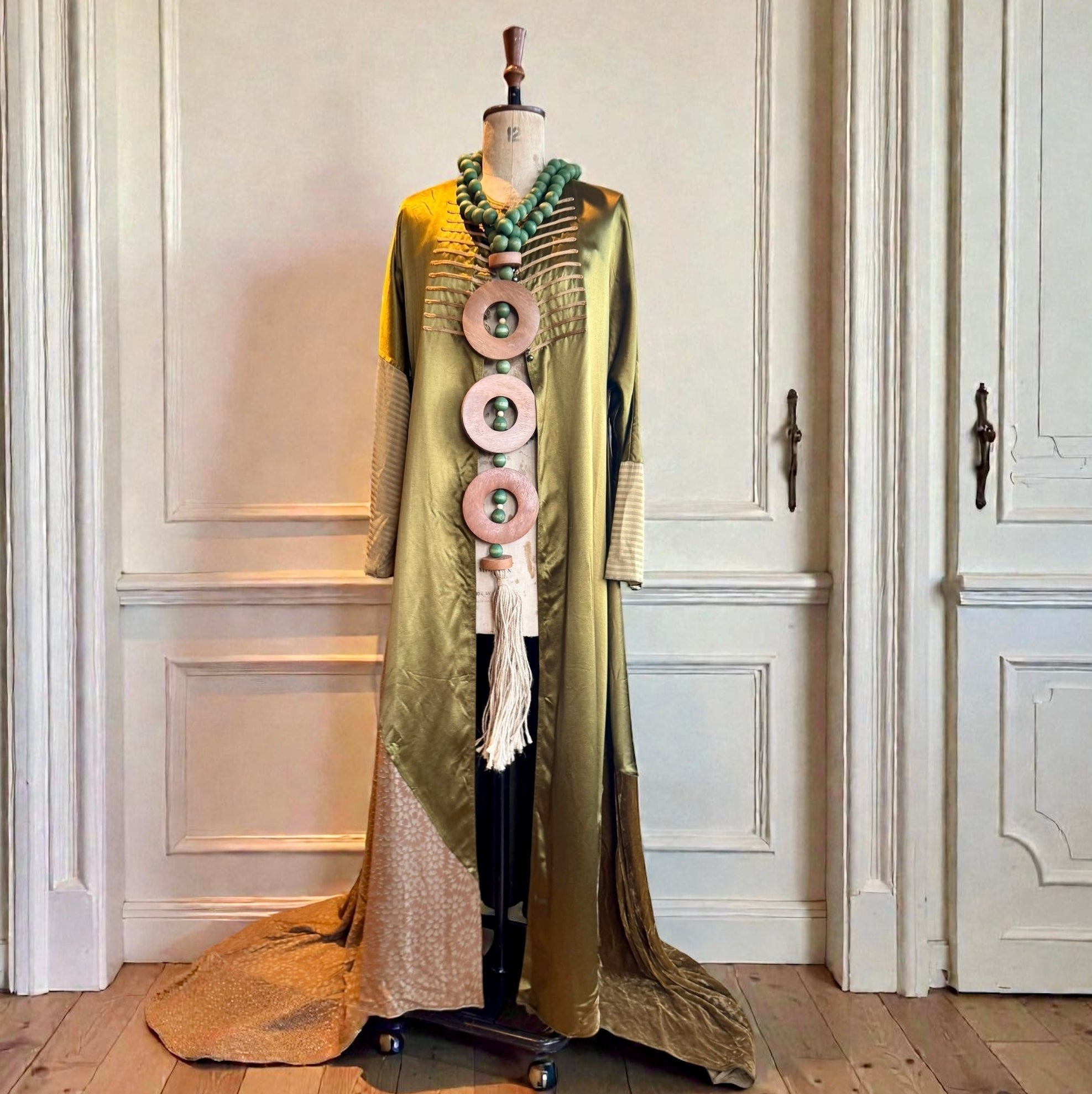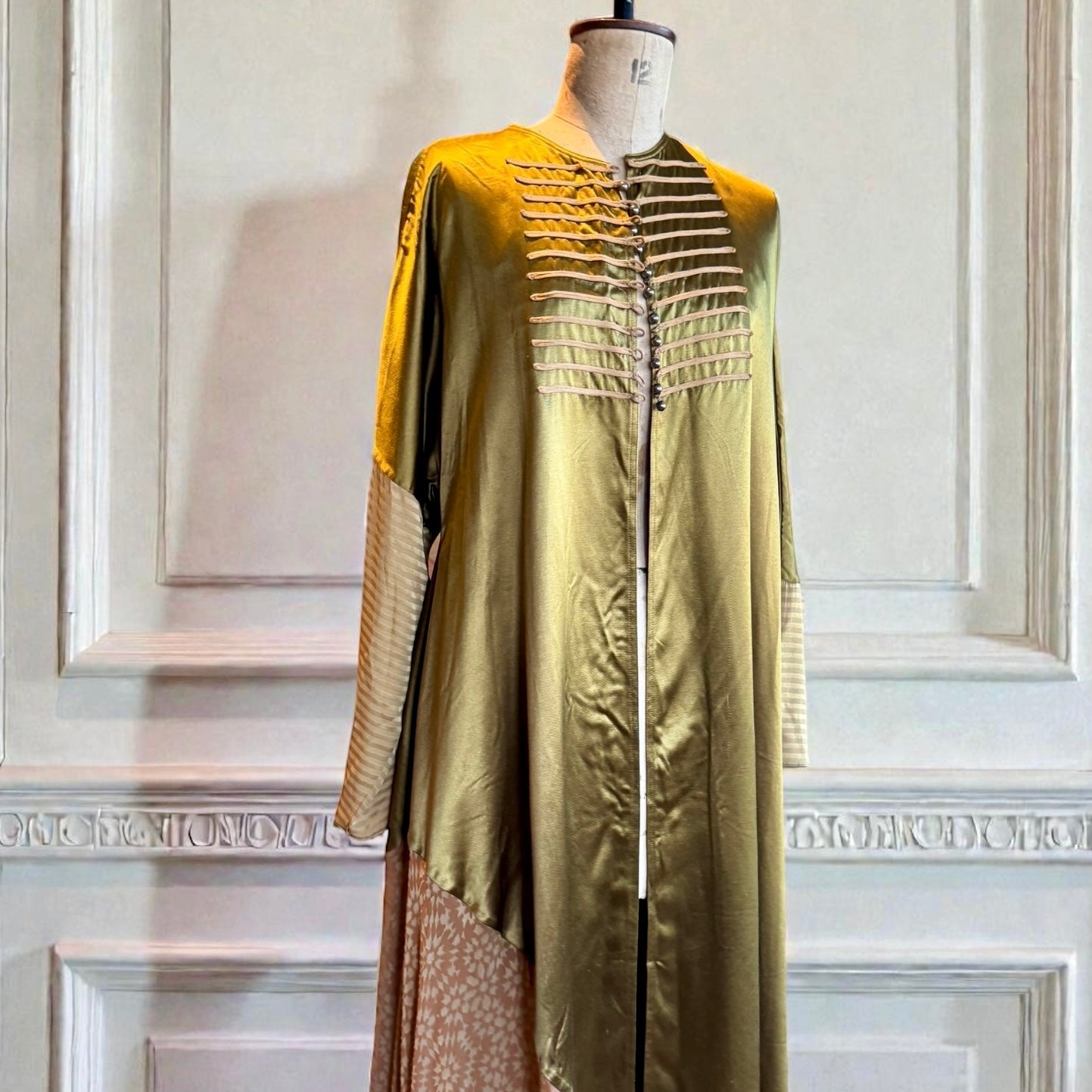 Expertly crafted by designer Rifat Ozbek, this collectable robe is a must-have for any fan of 90s fashion. Made with luxurious silk and velvet, this long robe features a unique patchwork design with a handkerchief hem and statement front button closures in metal. A timeless piece of catwalk history.