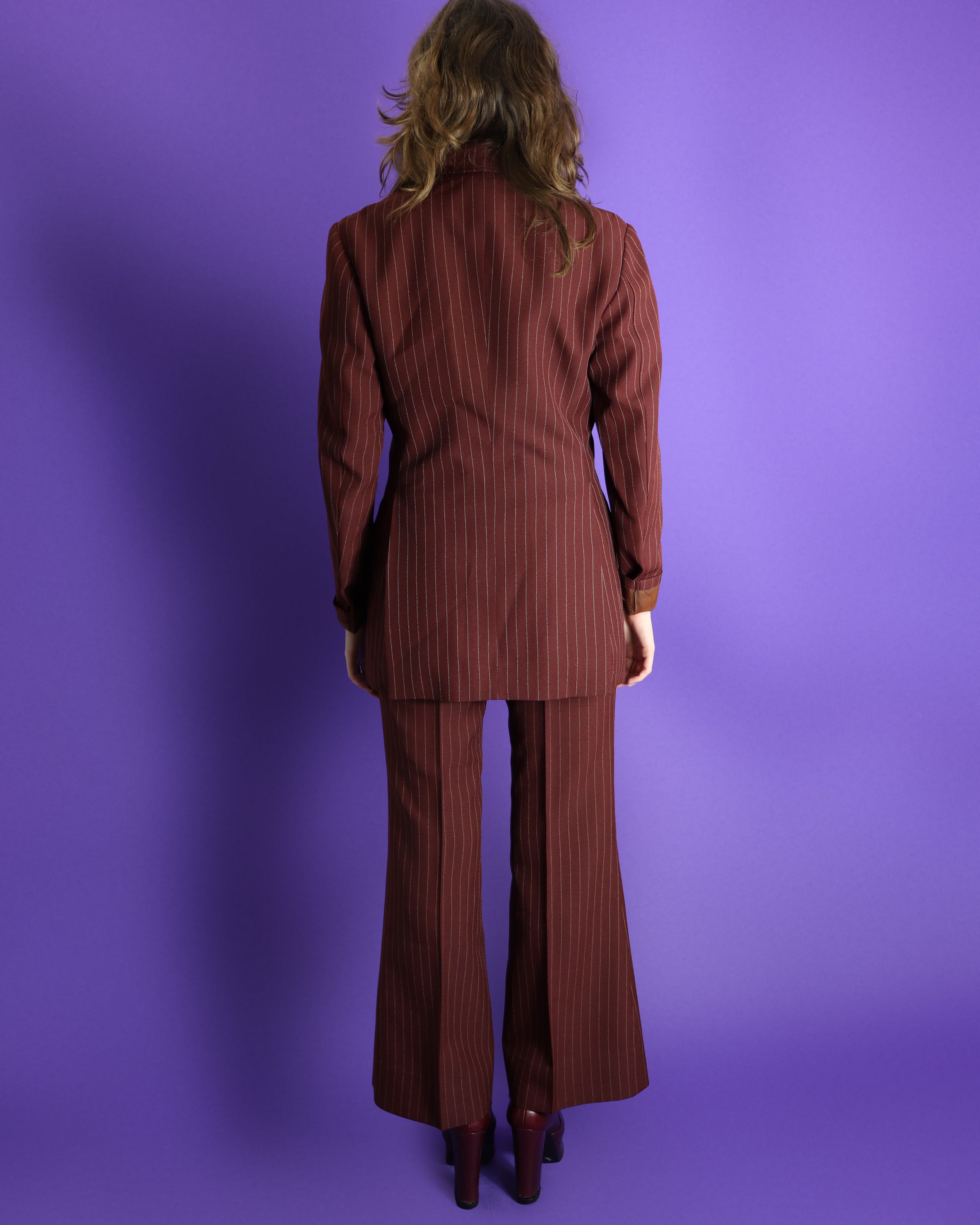 Fabulous vintage 1970s burgundy pinstripe suit tailored in Japan. Beautiful example of Japanese tailoring- I love the 40s style wide shoulder and bell bottom flare with ultra high waistband with double belt loops. I really love the oversized blazer on this suit and the unusual colourway. A 70s pinstripe suit is a timeless wardrobe addition!