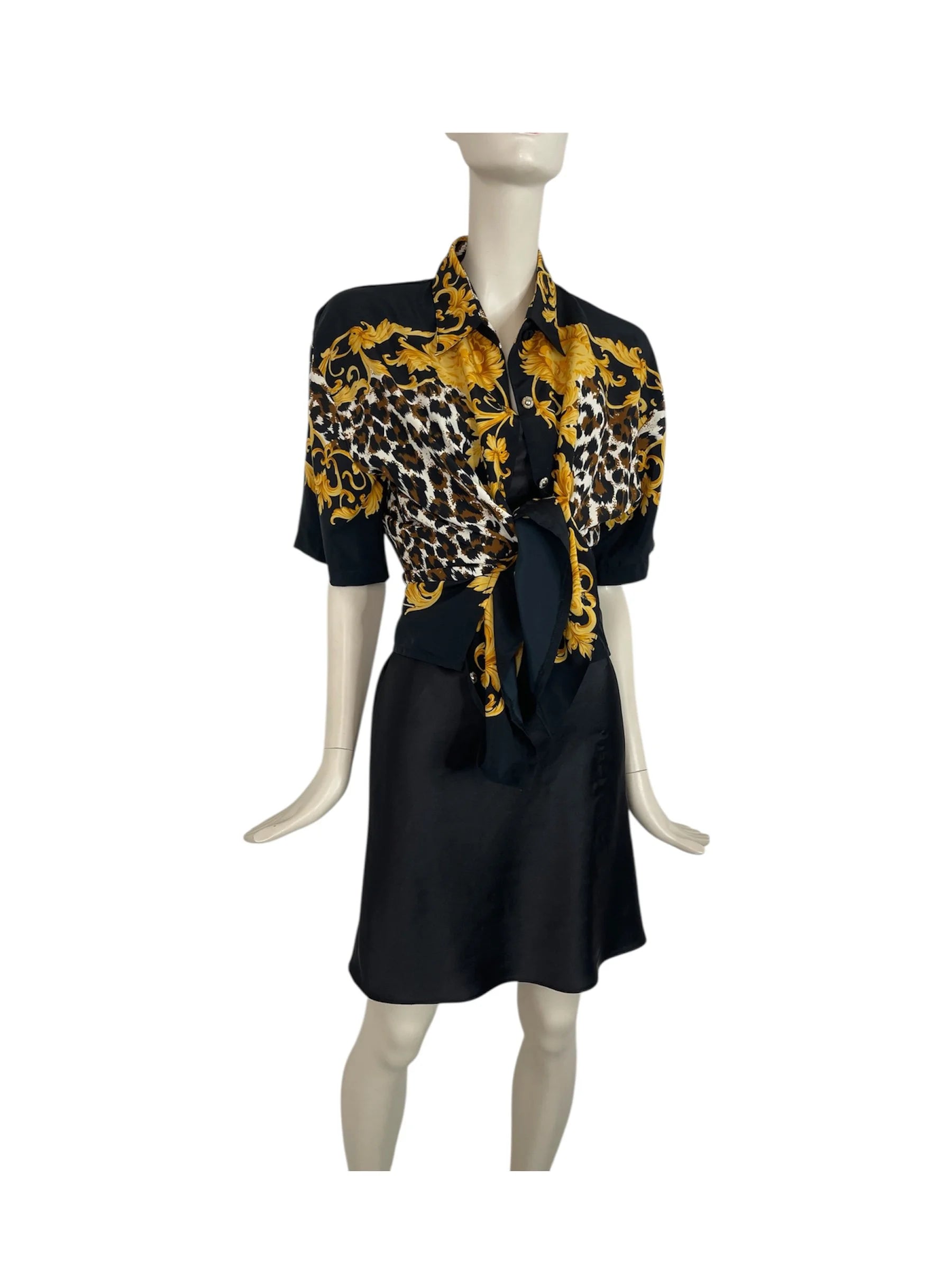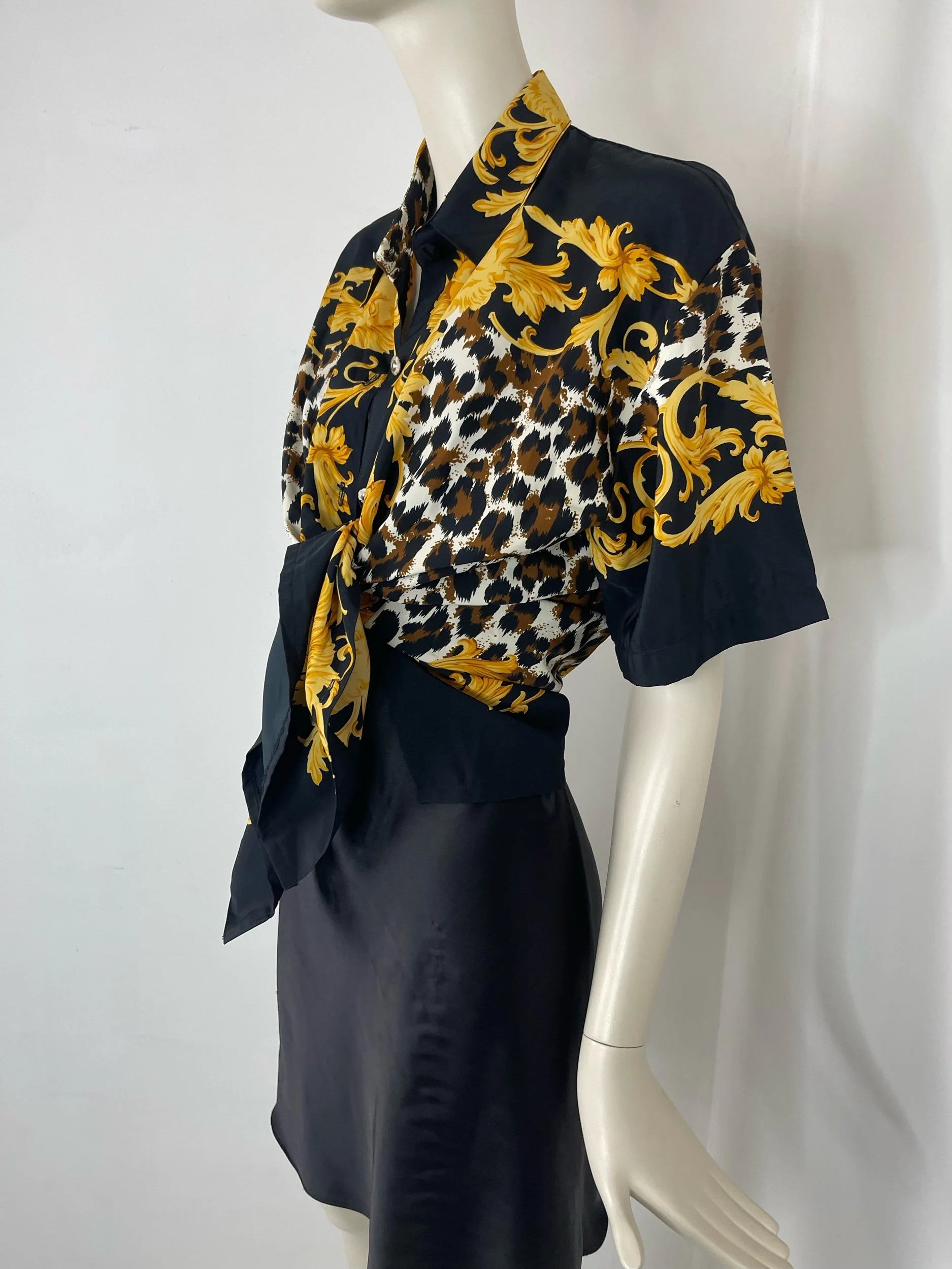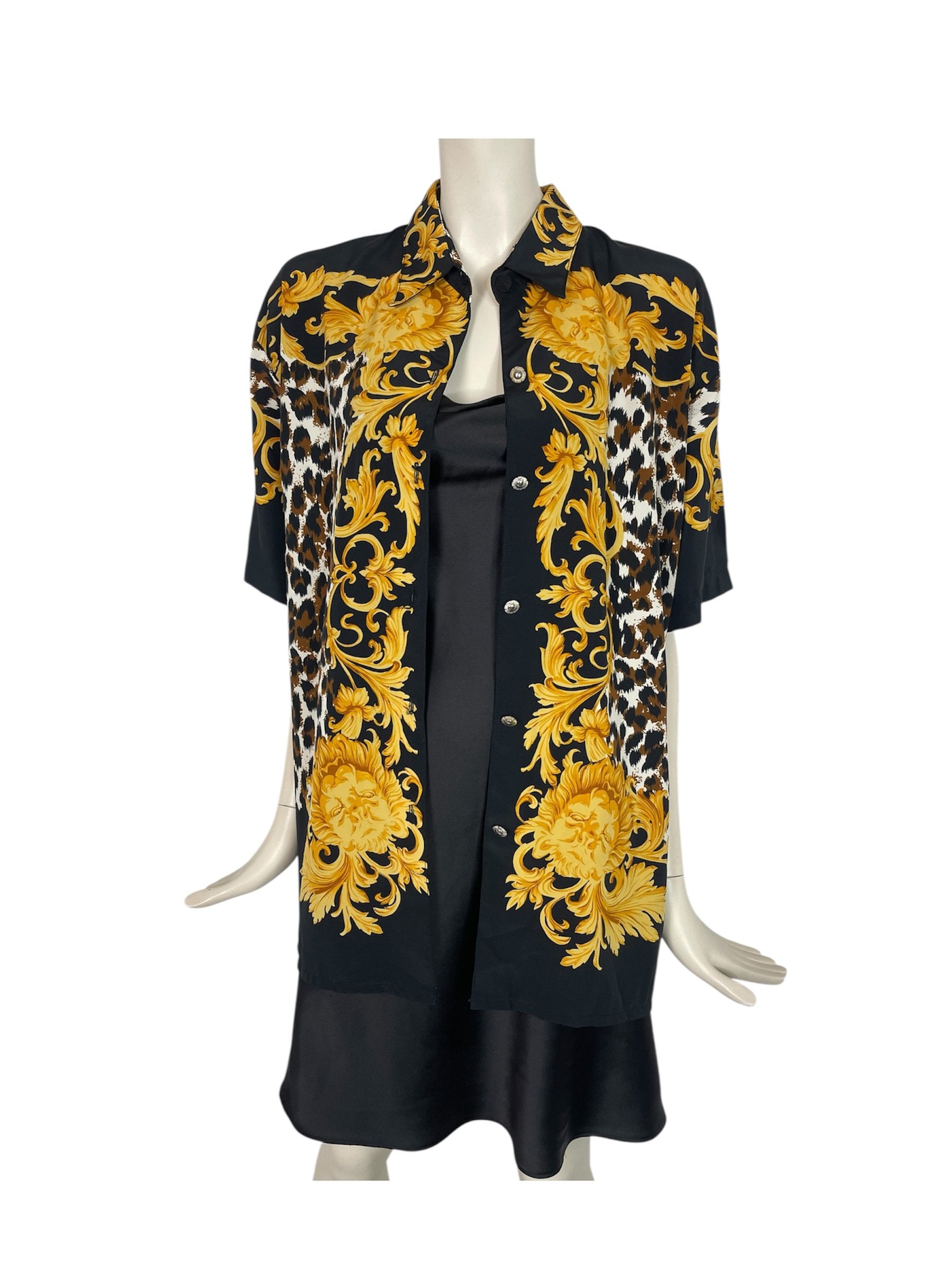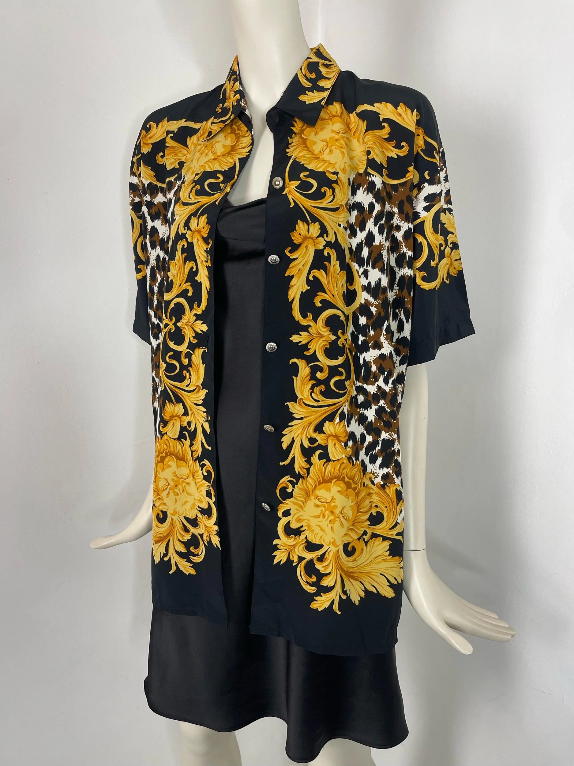 Turn heads with this striking vintage button-up shirt featuring an opulent mix of bold baroque scrolls and fierce leopard print. Designed in a silky, lightweight fabric, it drapes beautifully whether worn loose, layered, or tied at the waist. The rich black base highlights the ornate golden motifs, giving the shirt a luxurious, statement-making feel.