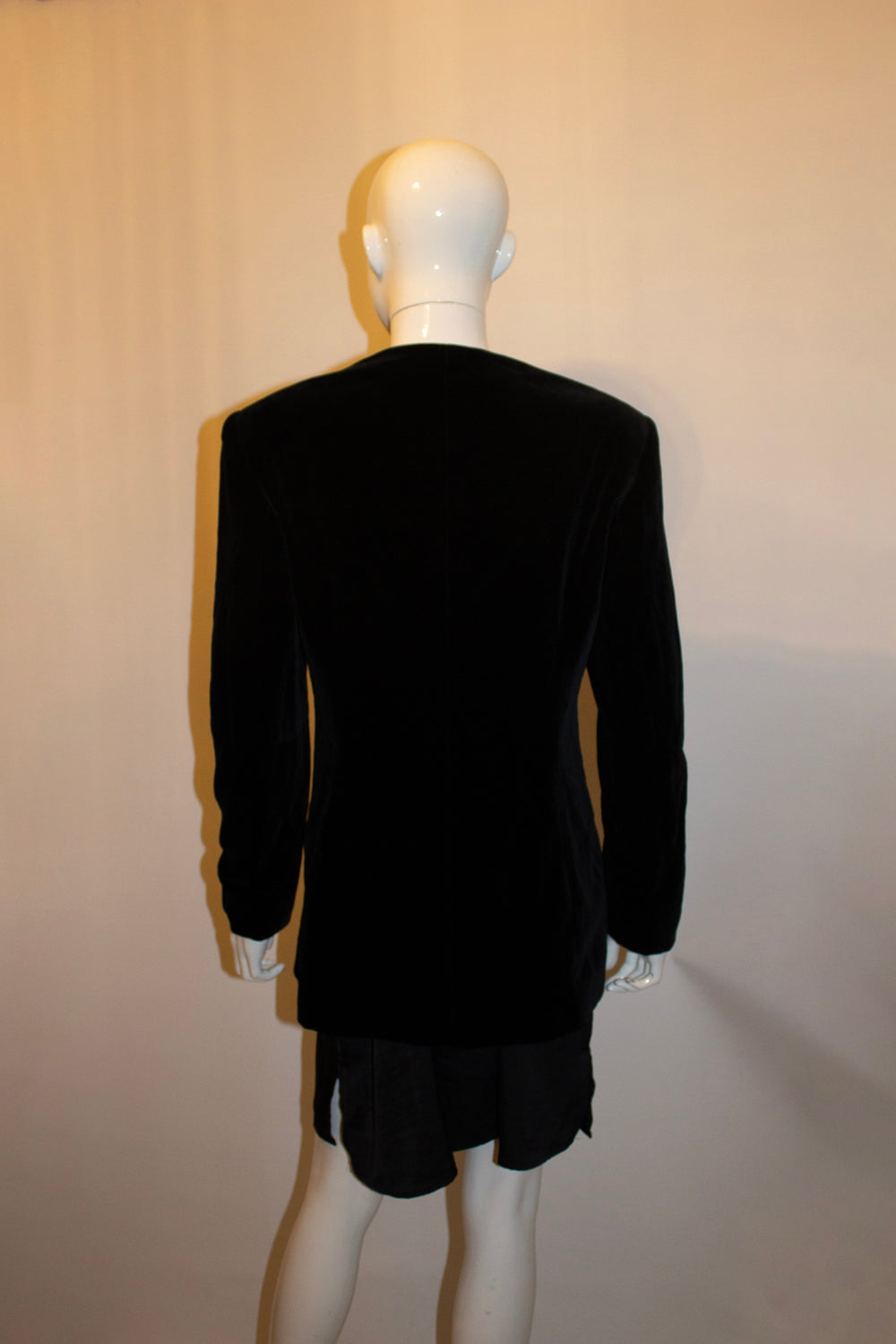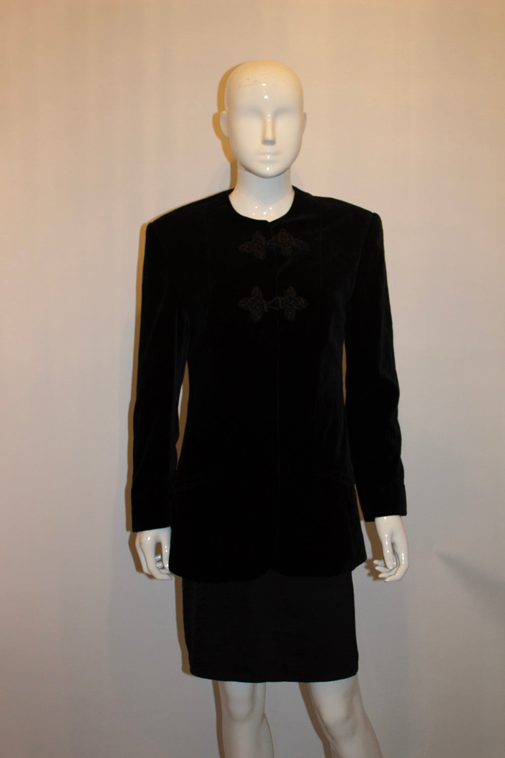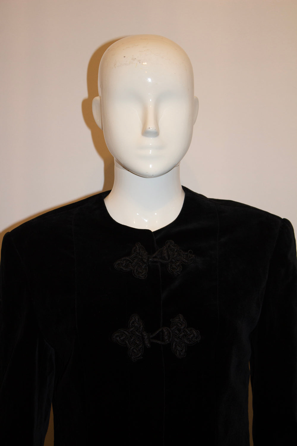 A super chic vintage velvet jacket by Bruce Oldfield. Bruce Oldfield designed Queen Camillas coronation gown in addition to designing for the late Princess of Wales. The jacket dates from 1992, and is in a super soft velvet.  It fastens with invisible buttons and decorative toggles, and is fully lined.
