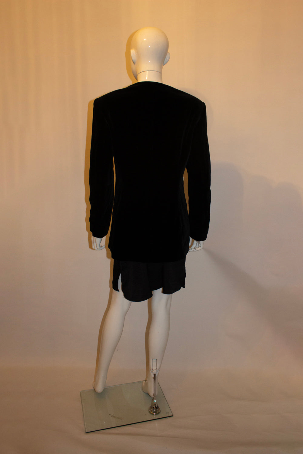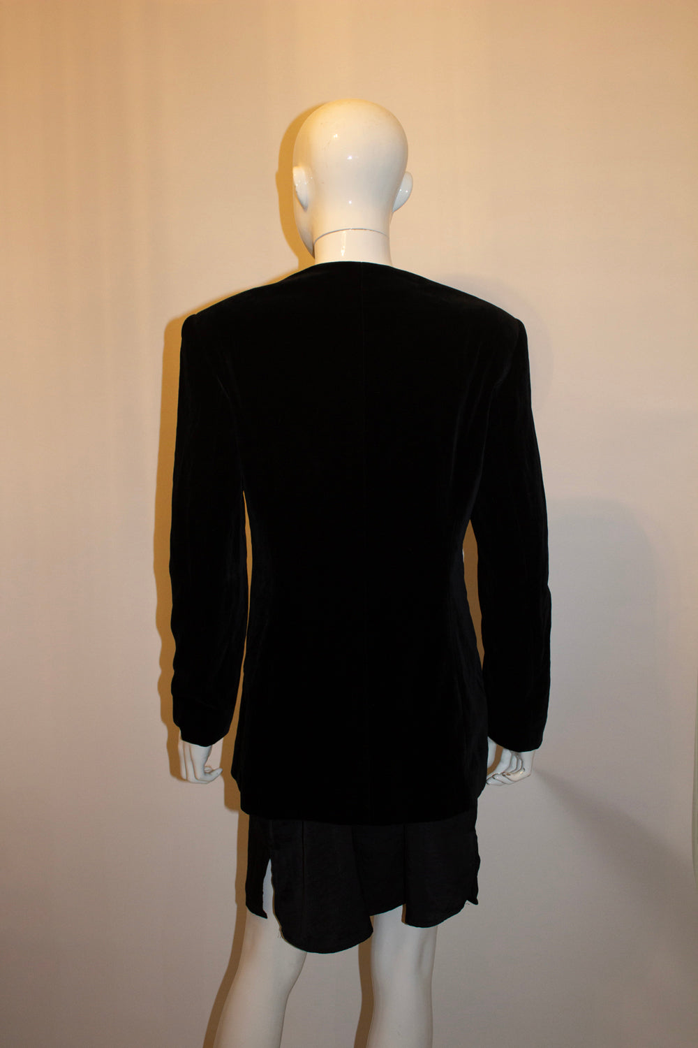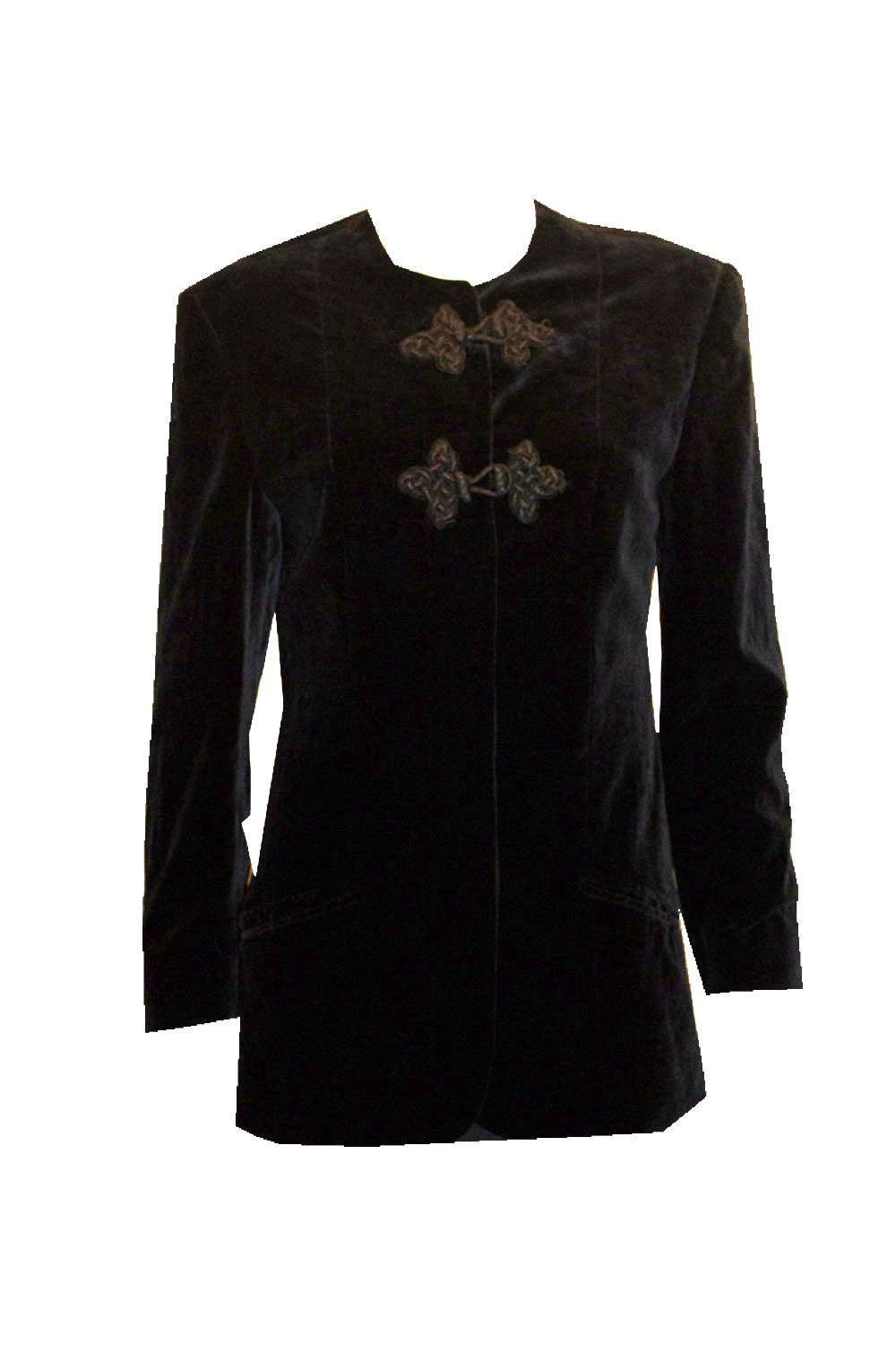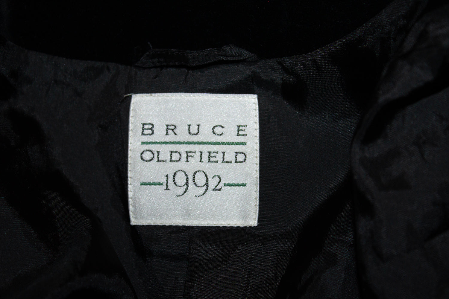 A super chic vintage velvet jacket by Bruce Oldfield. Bruce Oldfield designed Queen Camillas coronation gown in addition to designing for the late Princess of Wales. The jacket dates from 1992, and is in a super soft velvet.  It fastens with invisible buttons and decorative toggles, and is fully lined.