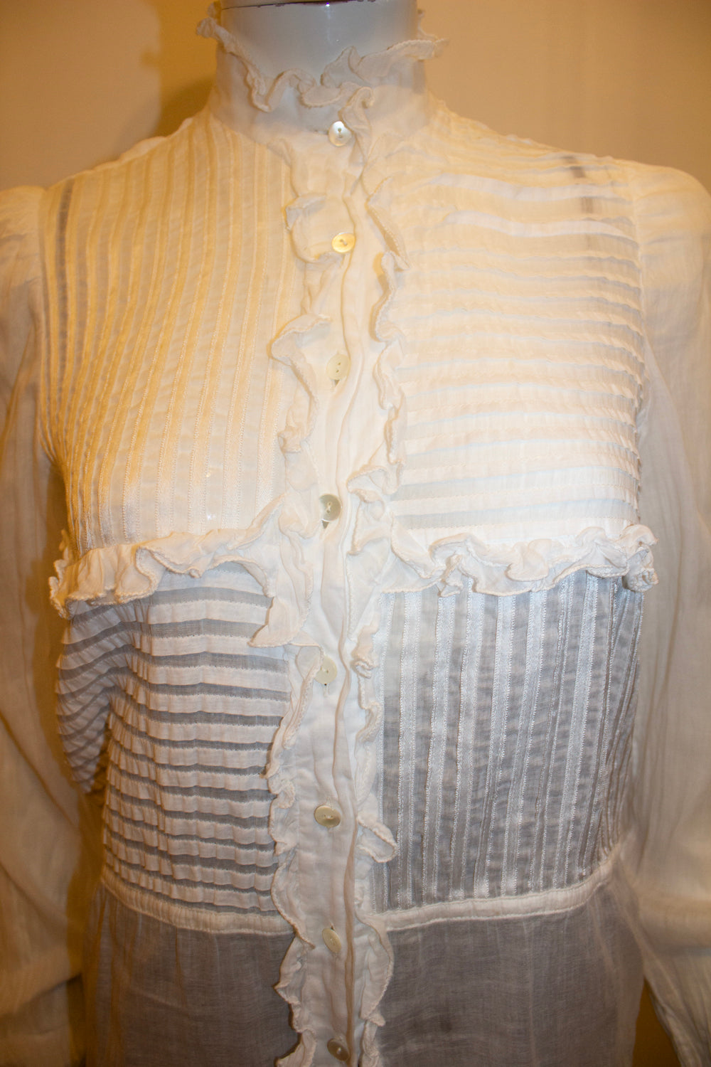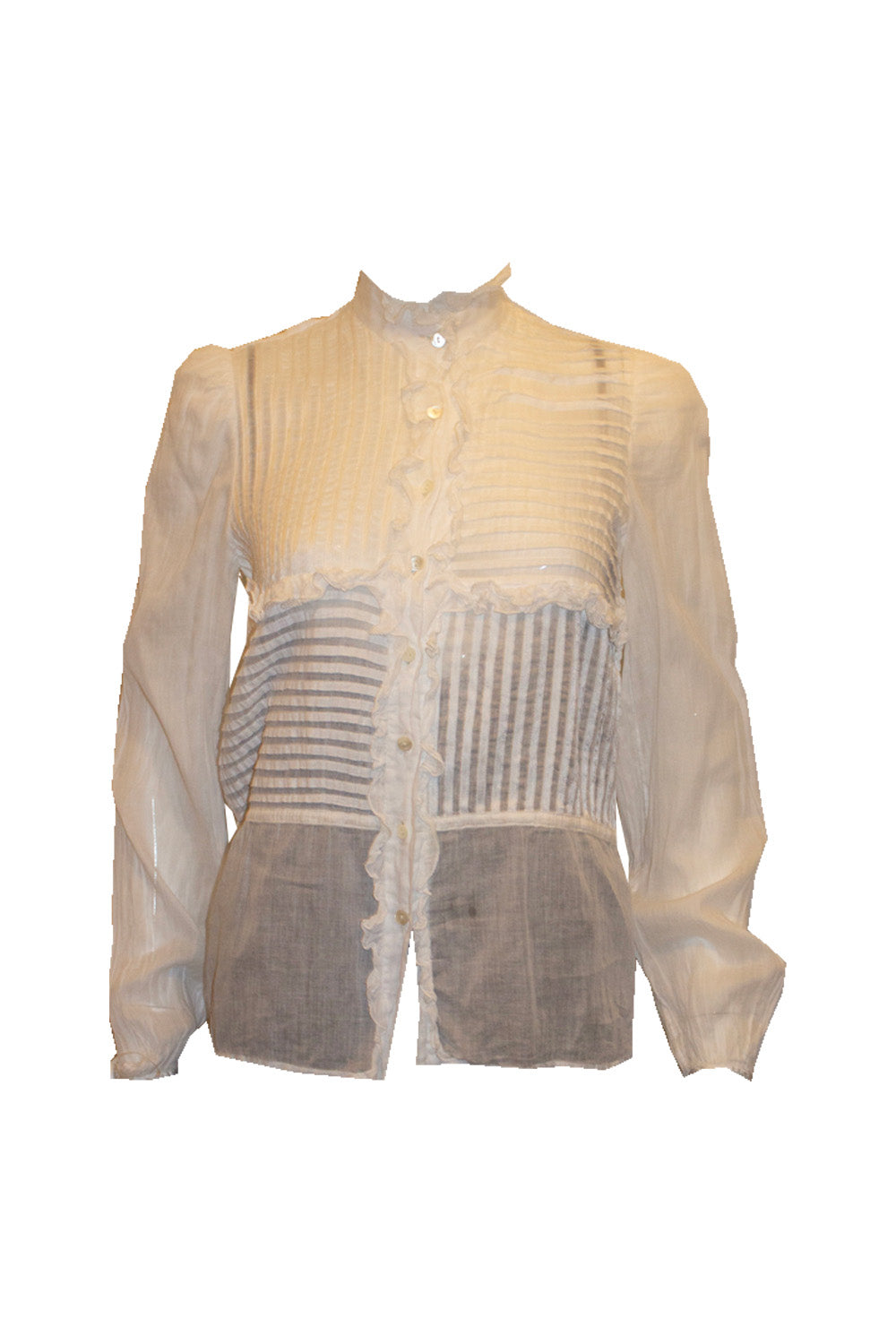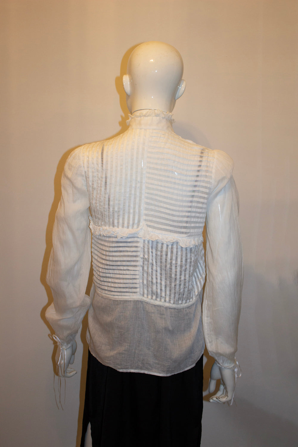 A stunning vintage blouse by Milena Francesio. Made in Italy, the blouse is made of cotton with ribbon and pleat detail. It has a button front opening with frill detail and tie cuffs with ribbons.