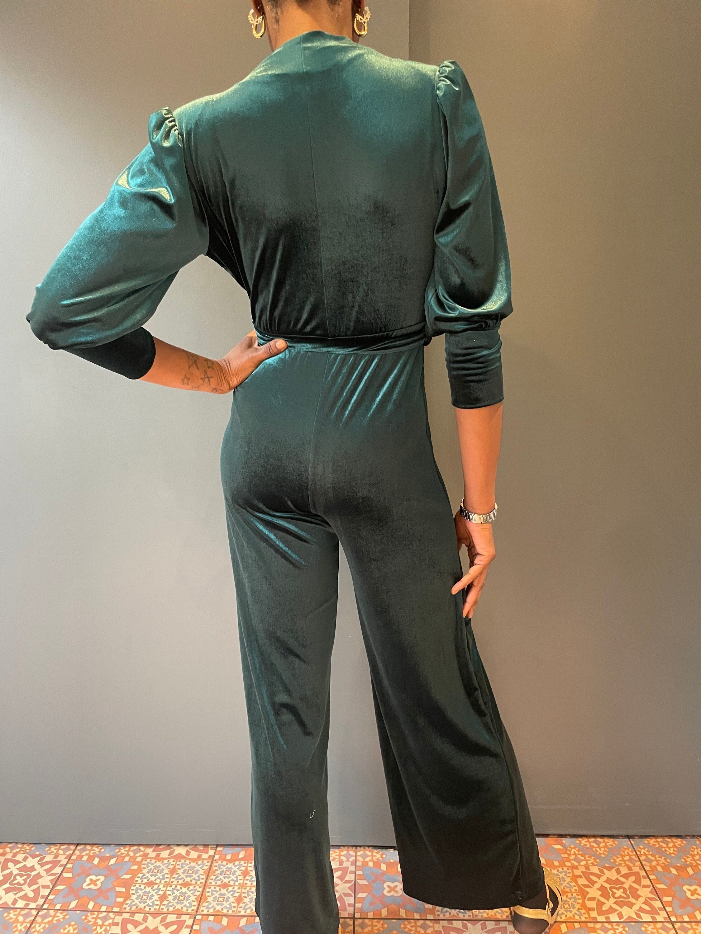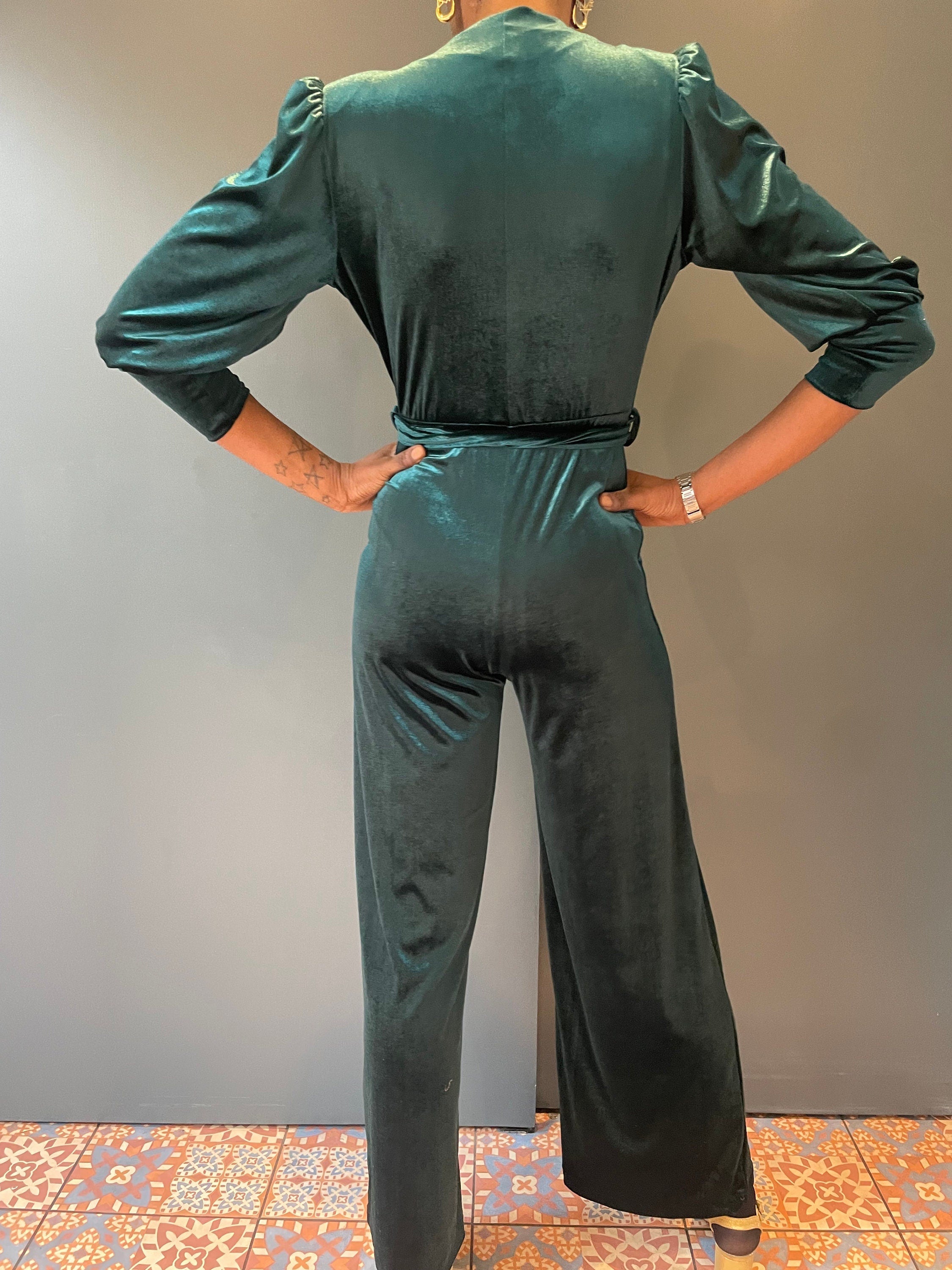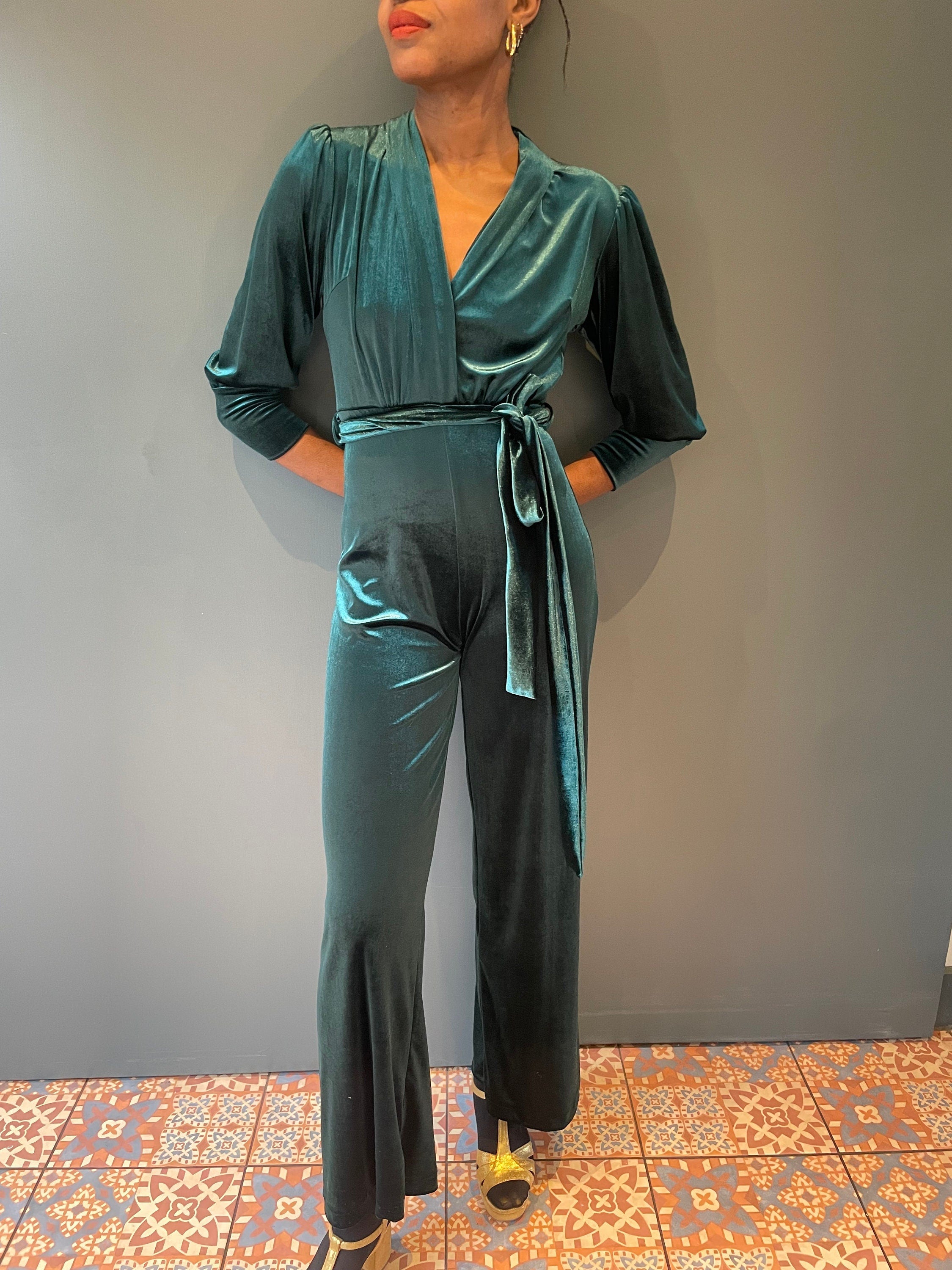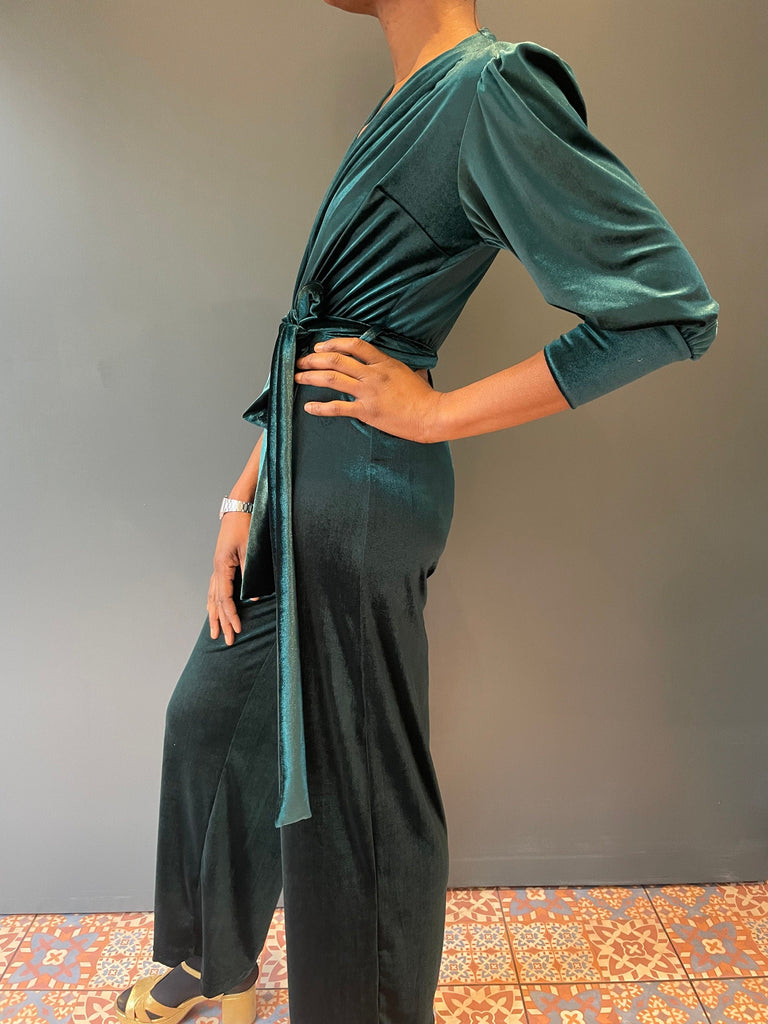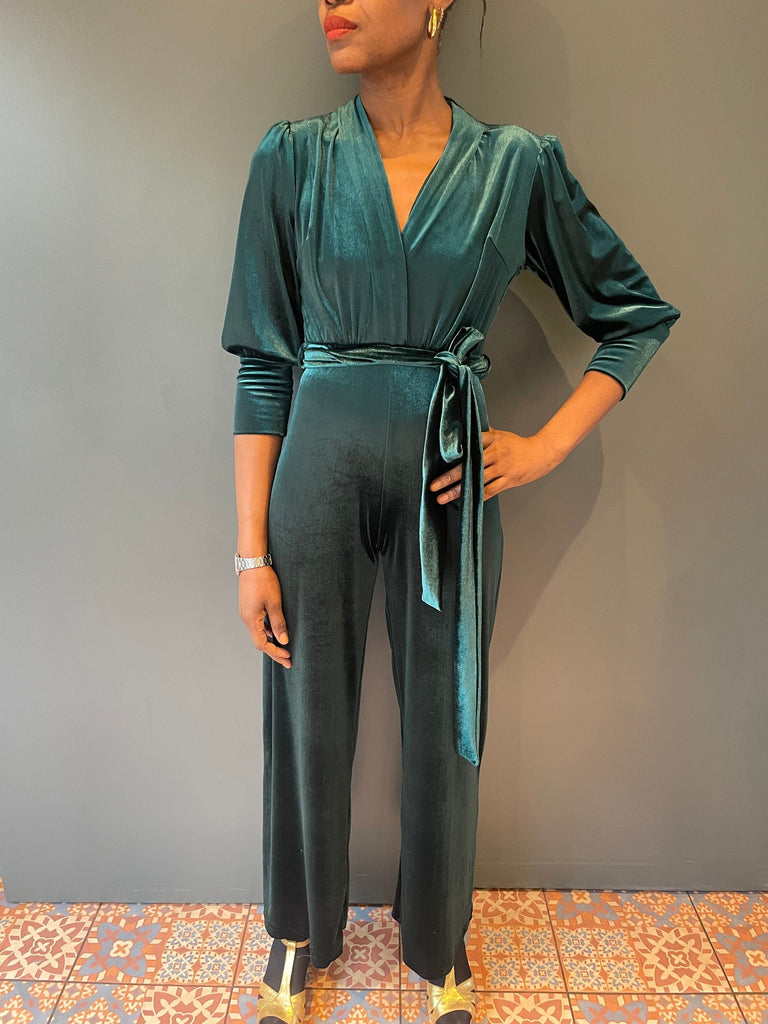The Dancing Queen Jumpsuit is made from luxurious green velvet and designed to turn heads. It features flared trousers, a matching belt, and statement sleeves that truly steal the show.
