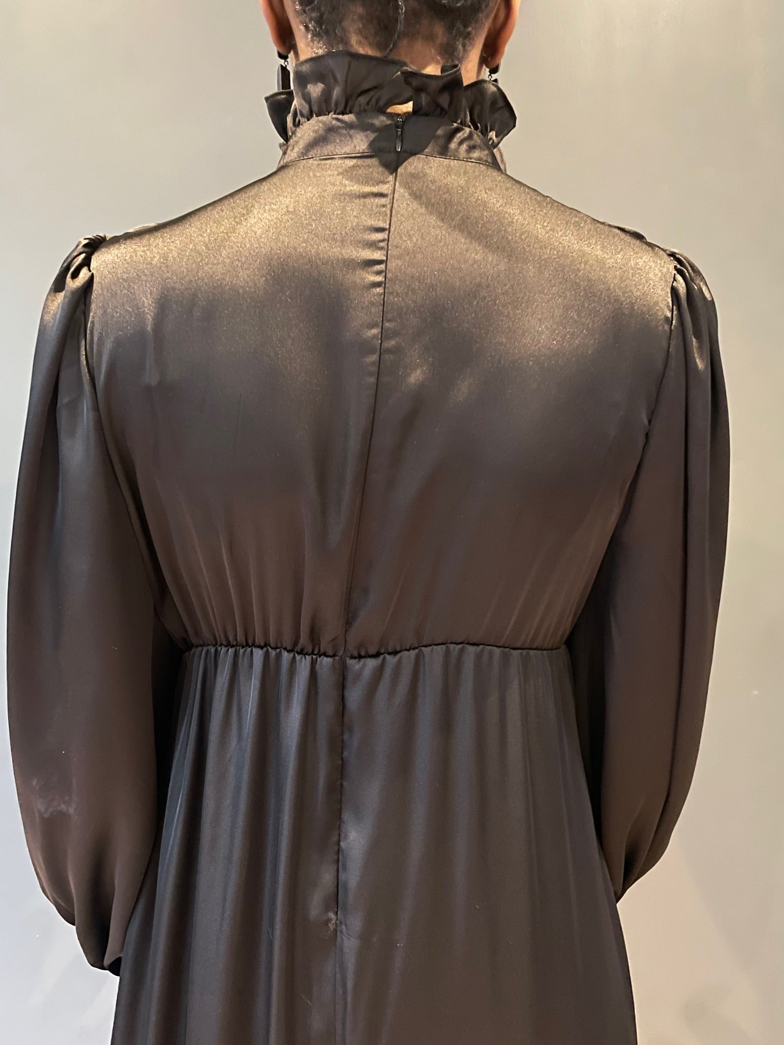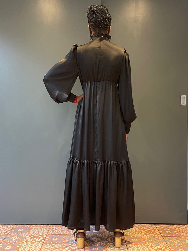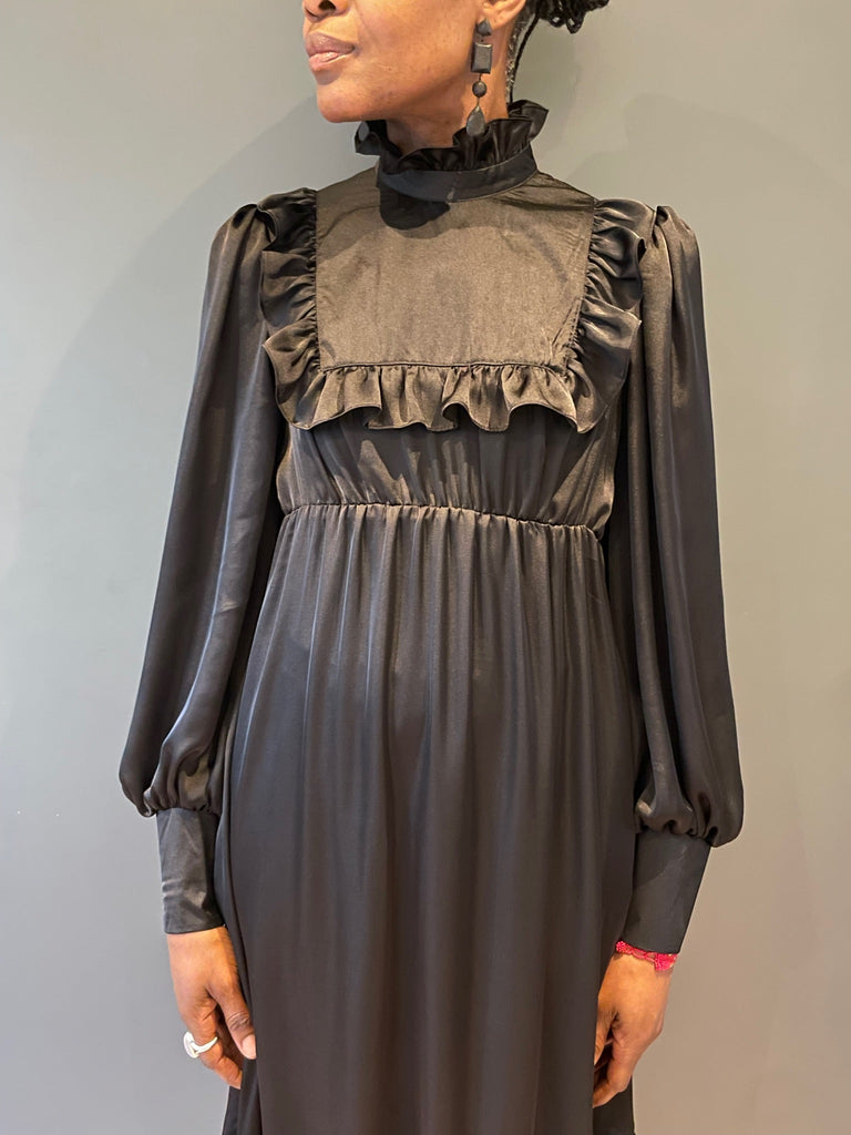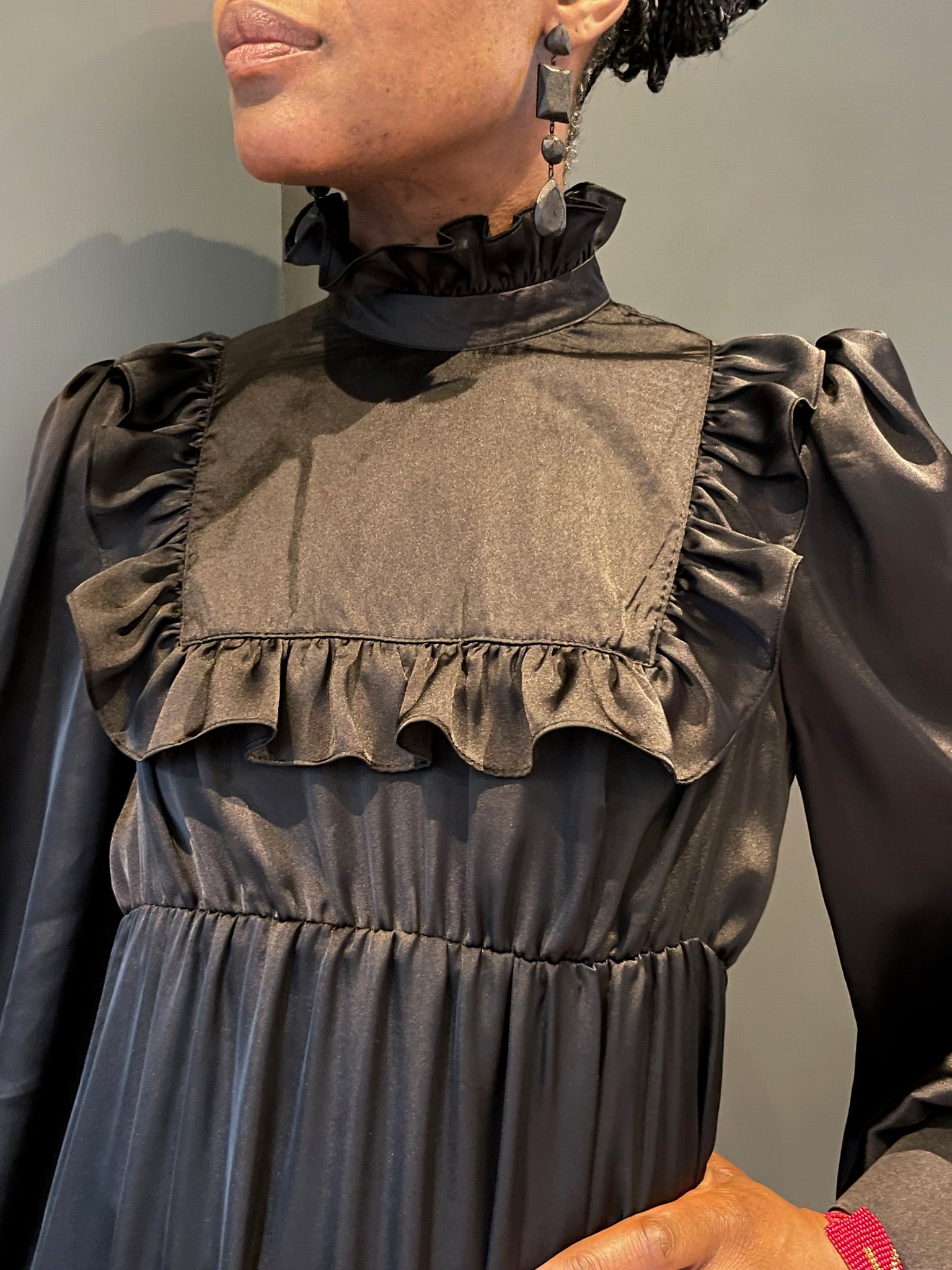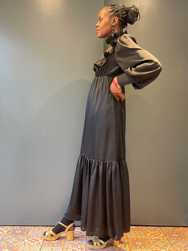 Inspired by the romantic 1970s designs of Jean Varon and Laura Ashley, the Prairie Dress captures a nostalgic yet refined charm. With its flowing silhouette, soft smocking, gentle ruffles, and statement sleeves, it evokes the Edwardian-inspired style that defined the decade. Crafted from four metres of fabric, it moves beautifully with every step. And yes, it has pockets. This edition features a luxurious black silk deadstock fabric. Once this fabric is gone, it will not be restocked.