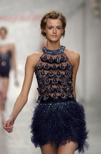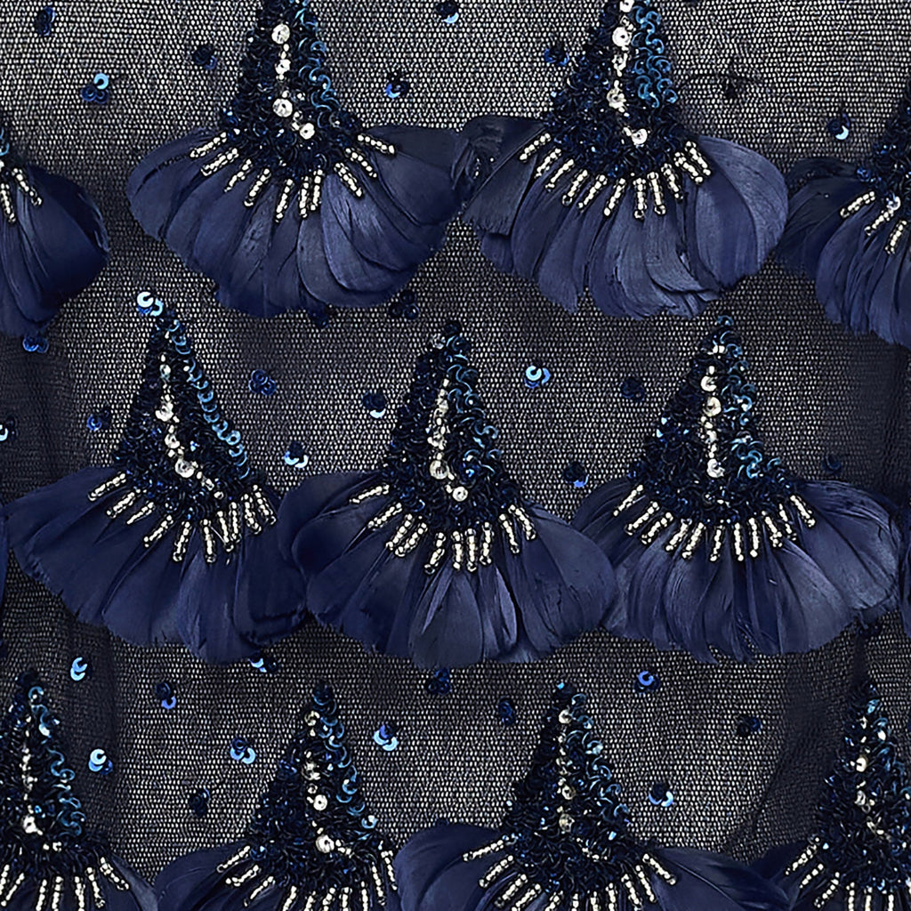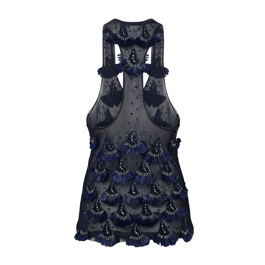 Tailored from a double layer of lightweight navy mesh, it is cut to a relaxed tank top silhouette. The detail across this top is stunning; blue and silver iridescent sequins form teardrop shapes which are finished with a row of navy blue feathers detailed with tiny see-through beads. The overall effect is decadent and recalls the plumage of birds of paradise or flamboyant tassels of showgirl outfits. The top is unlined and as a result has a sheer finish.
