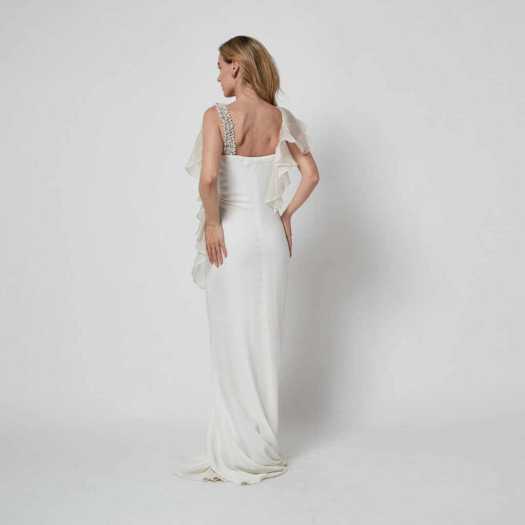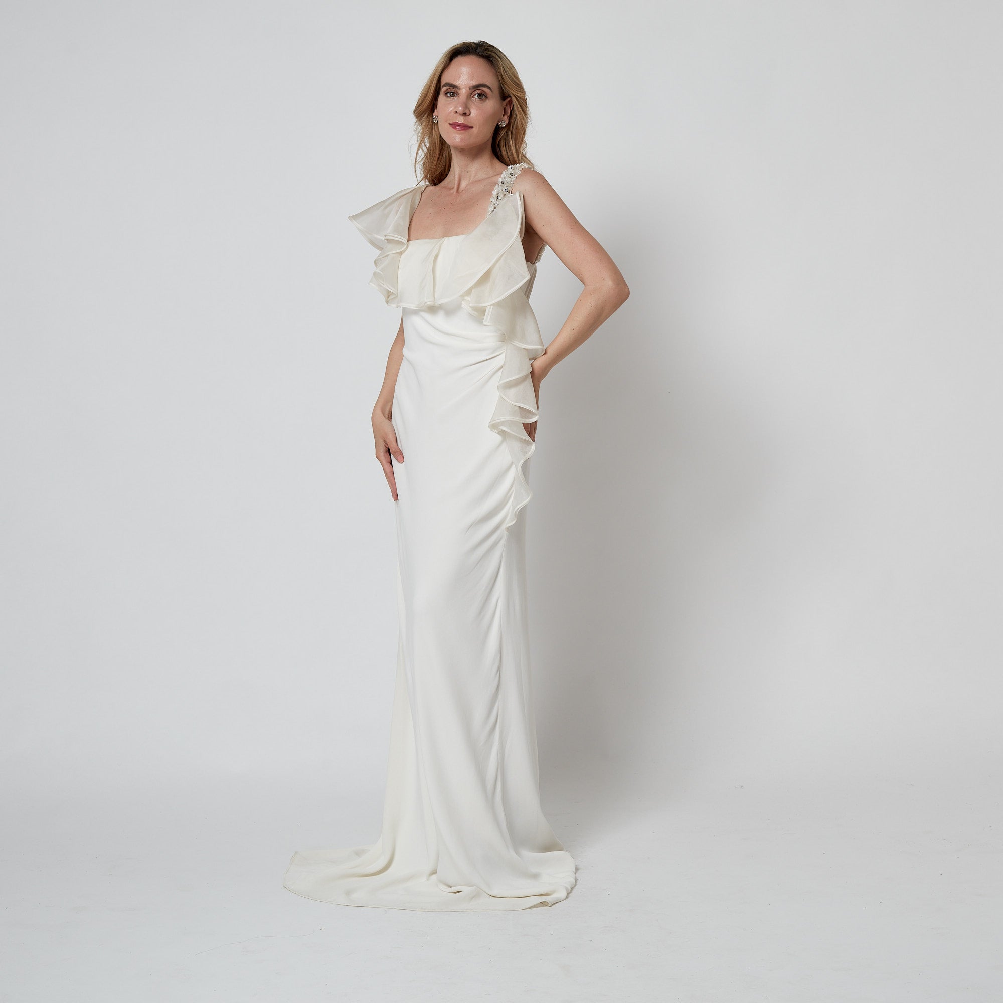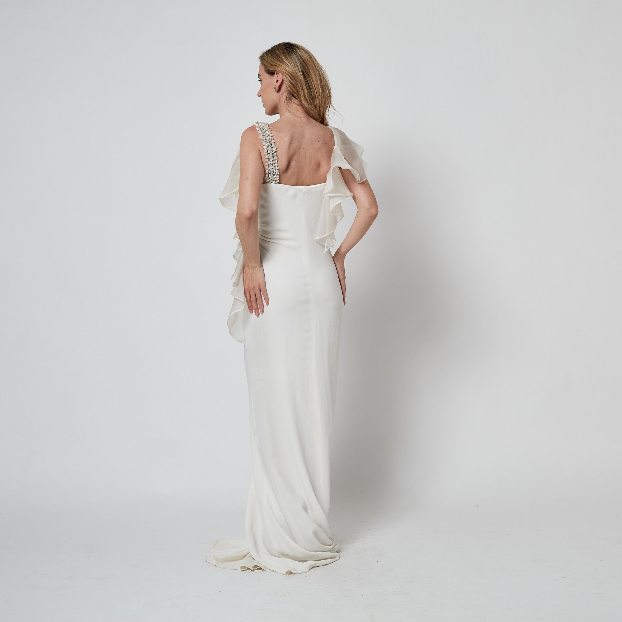 This romantic dress is tailored from pale cream silky fabric and falls in a column silhouette to the floor. It has two straps made from clashing yet complimentary fabrics. One strap is crafted from cream chiffon and forms a theatrical ruffle that sweeps over the shoulder, across the bust and cascades down the side of the dress. The other strap is heavily beaded; layered white mesh is adorned with pretty flowers formed of pearlescent petal-shaped beads around a central rhinestone. Inside the dress is a nude corset. Boned the whole way around the body, it has a modesty strap and unwiring at the bust. The dress fastens under the right arm with a hidden tonal zip and is fully lined with cream satin. It would make a stunning and highly memorable wedding dress.