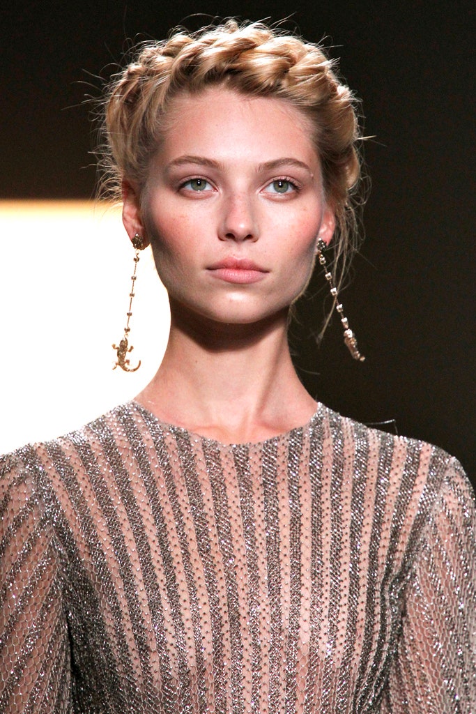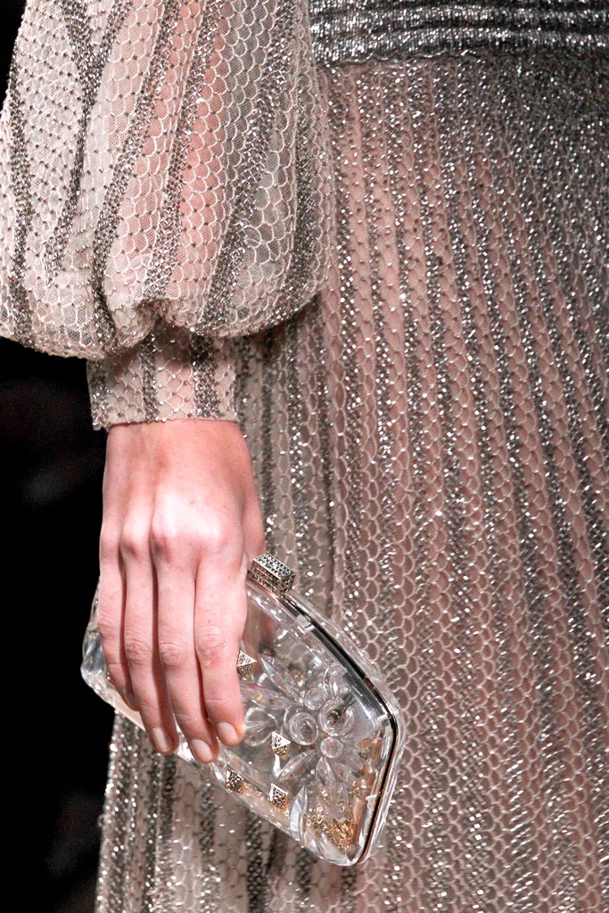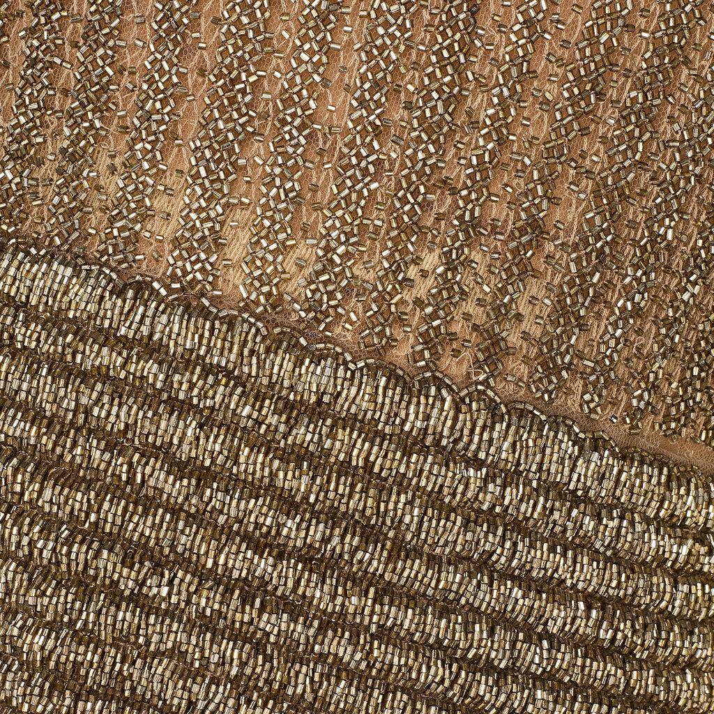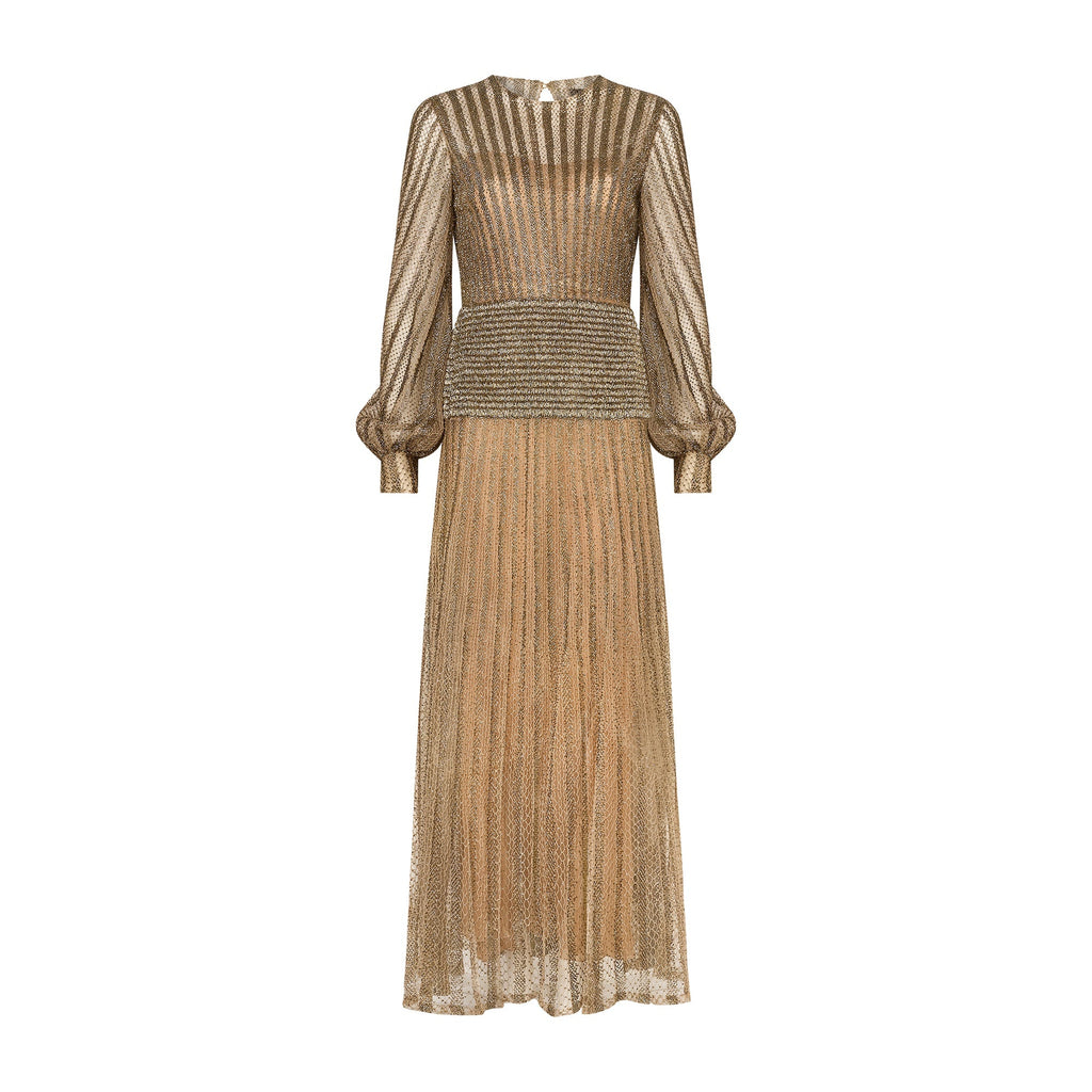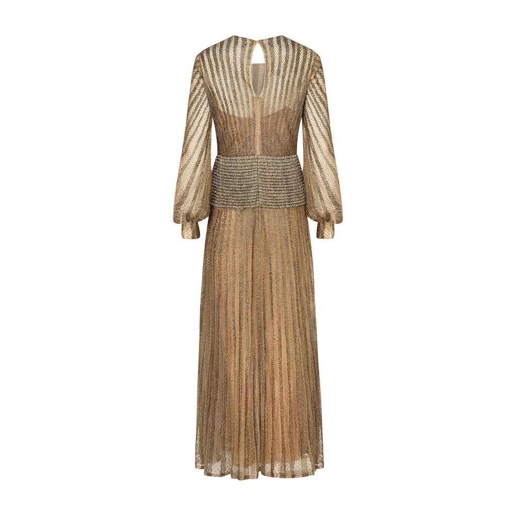 Tailored from mauve-grey mesh, it has a long-sleeved, ankle-length silhouette. The fabric is detailed all-over with deep gold/bronze beadwork and metallic embroidery which form stripes across the cloth. Unlined at the top, it has a semi-sheer finish. The sleeves are cut to a balloon-sleeve shape with cuffs that fasten with two hidden snap closures on each. The skirt is full, softly pleated and sheer. It is lined with one layer of white tulle. The standout detail of this dress is at the waist. Adorned with hundred of tiny rows of metallic beads, the waistband almost gives the appearance of glittering chainmail. The dress fastens at the back with a hidden zip. It has a keyhole cut-out at the top which is secured with a mother-of-pearl button. The dress is lined with a sheer pale pink slip with delicate sheer mesh spaghetti straps - it fastens with a tonal zip. The slip is separate to the dress and it can be worn without, as it was on the runway.
