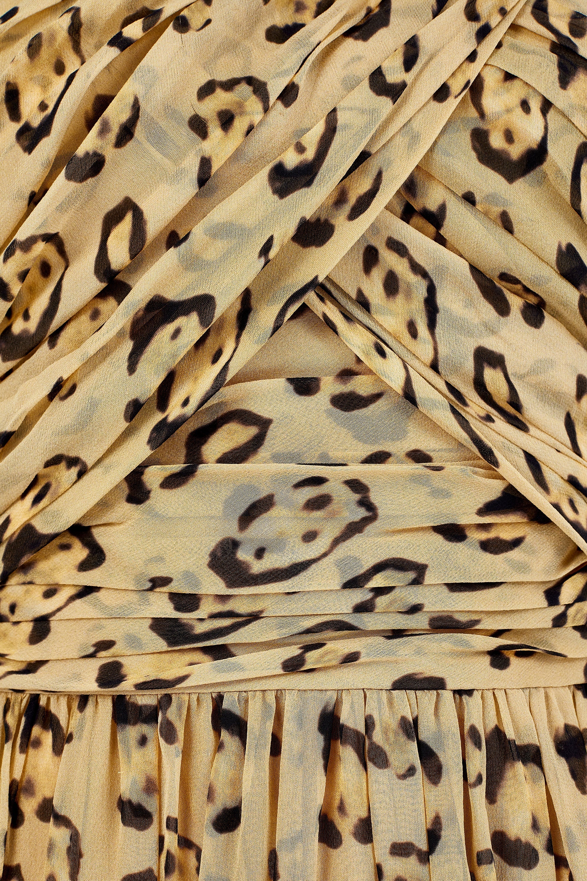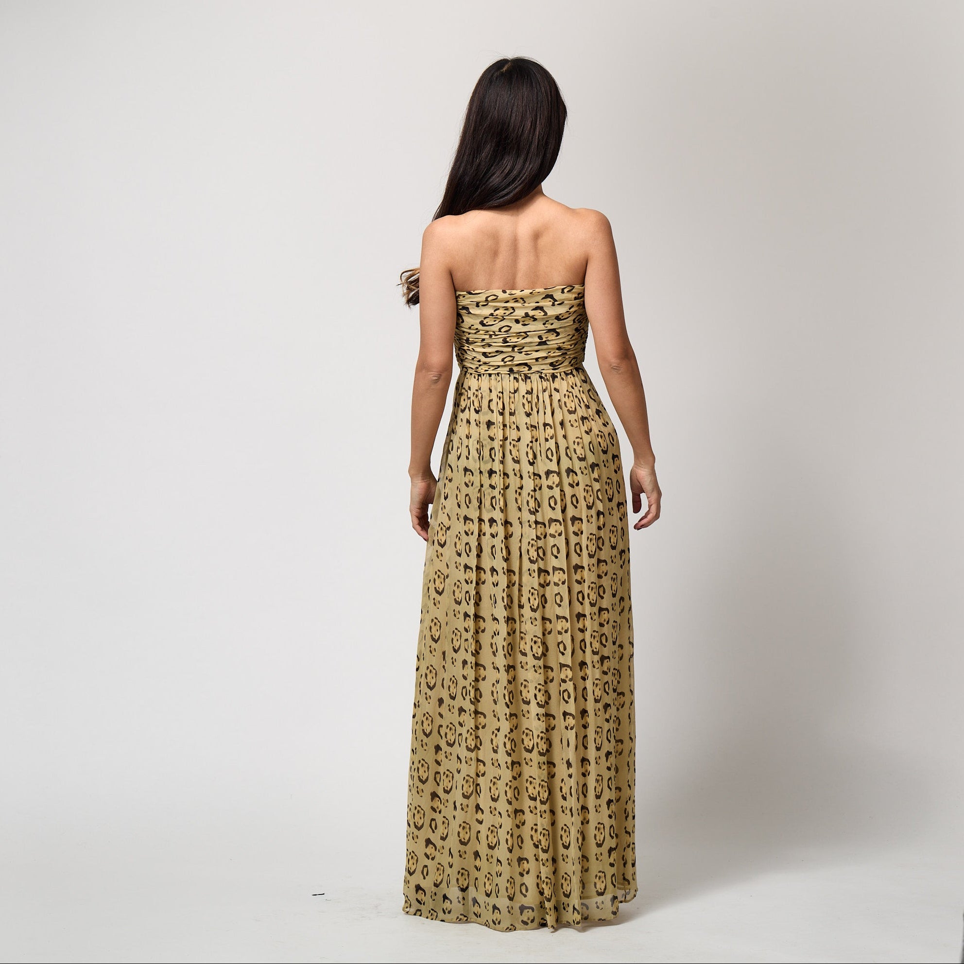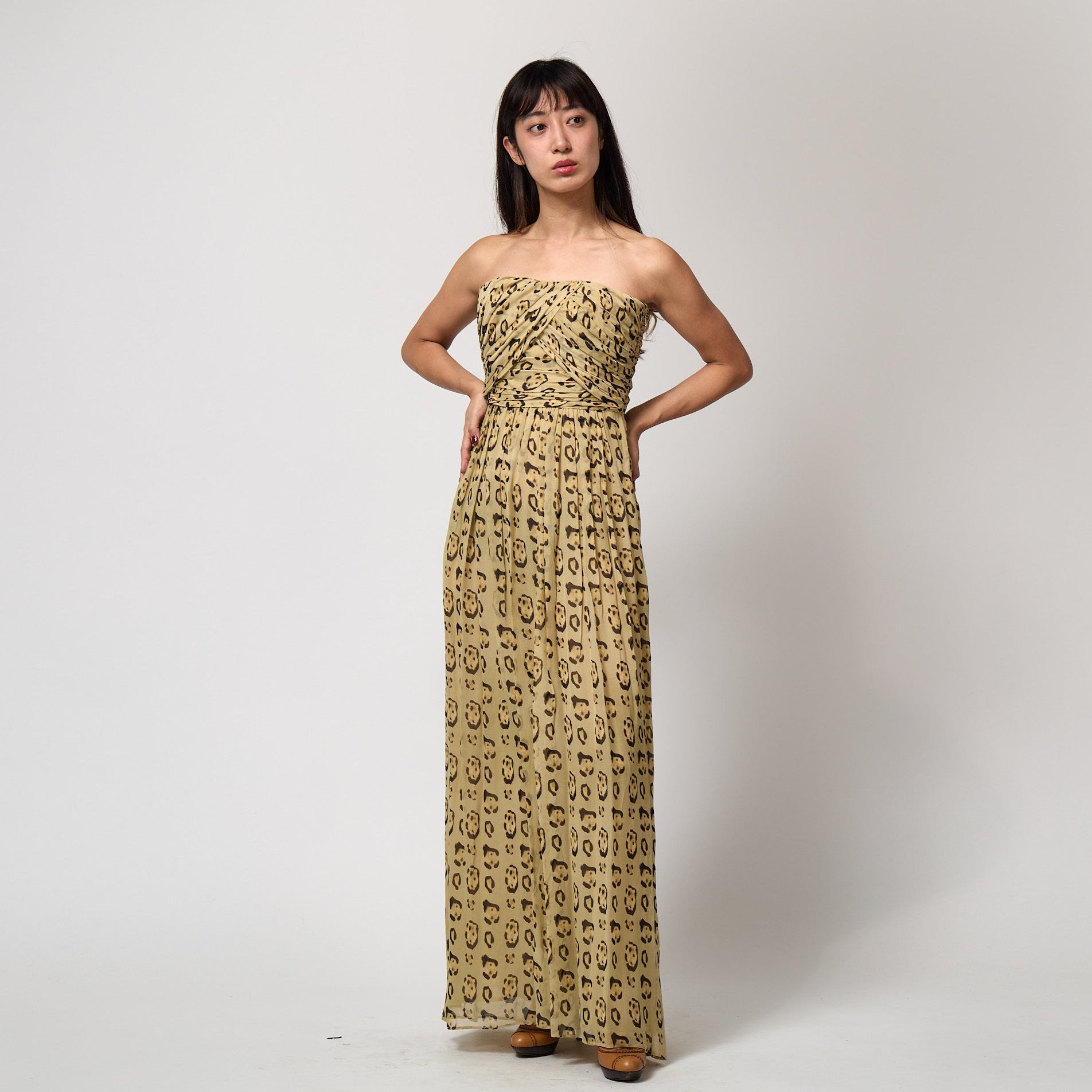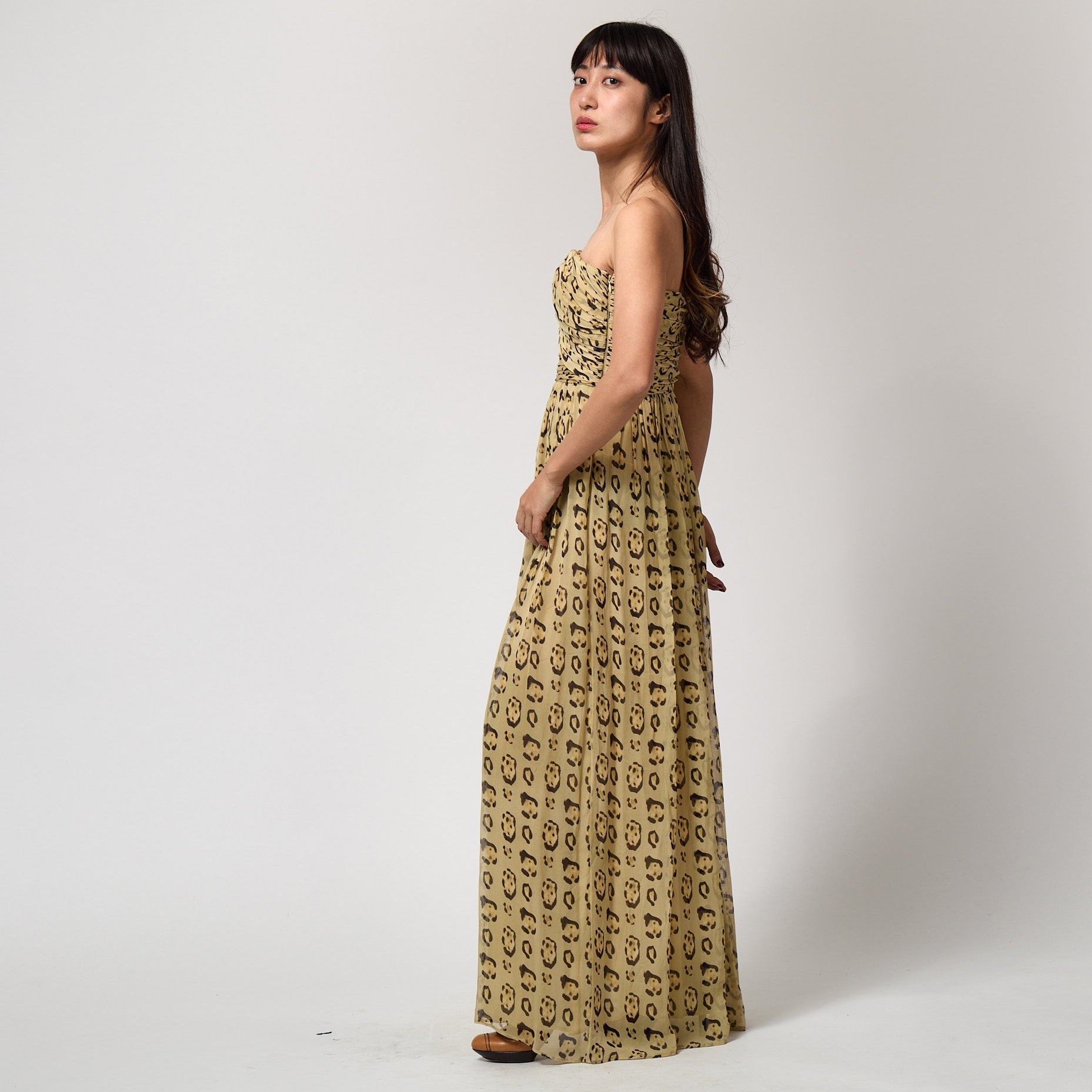 The dress is tailored from pale gold silk chiffon decorated with painterly mustard-yellow and dark brown-black spots to form a leopard effect across the silk. The gown is styled as a strapless, floor-length silhouette. It has a bustier top which is wrapped in gathered layers of chiffon. Inside, it is corseted, boned the whole way around with a nude mesh corset, and wired around the bust - this fastens on the left-hand side with multiple rows of hook-and-eye clasps. The waist is nipped in to accentuate the body’s curves and, from the waist down, softly pleated chiffon cascades to the floor. The skirt is lined in silk chiffon. The dress fastens under the left arm with a hidden tonal zip.
