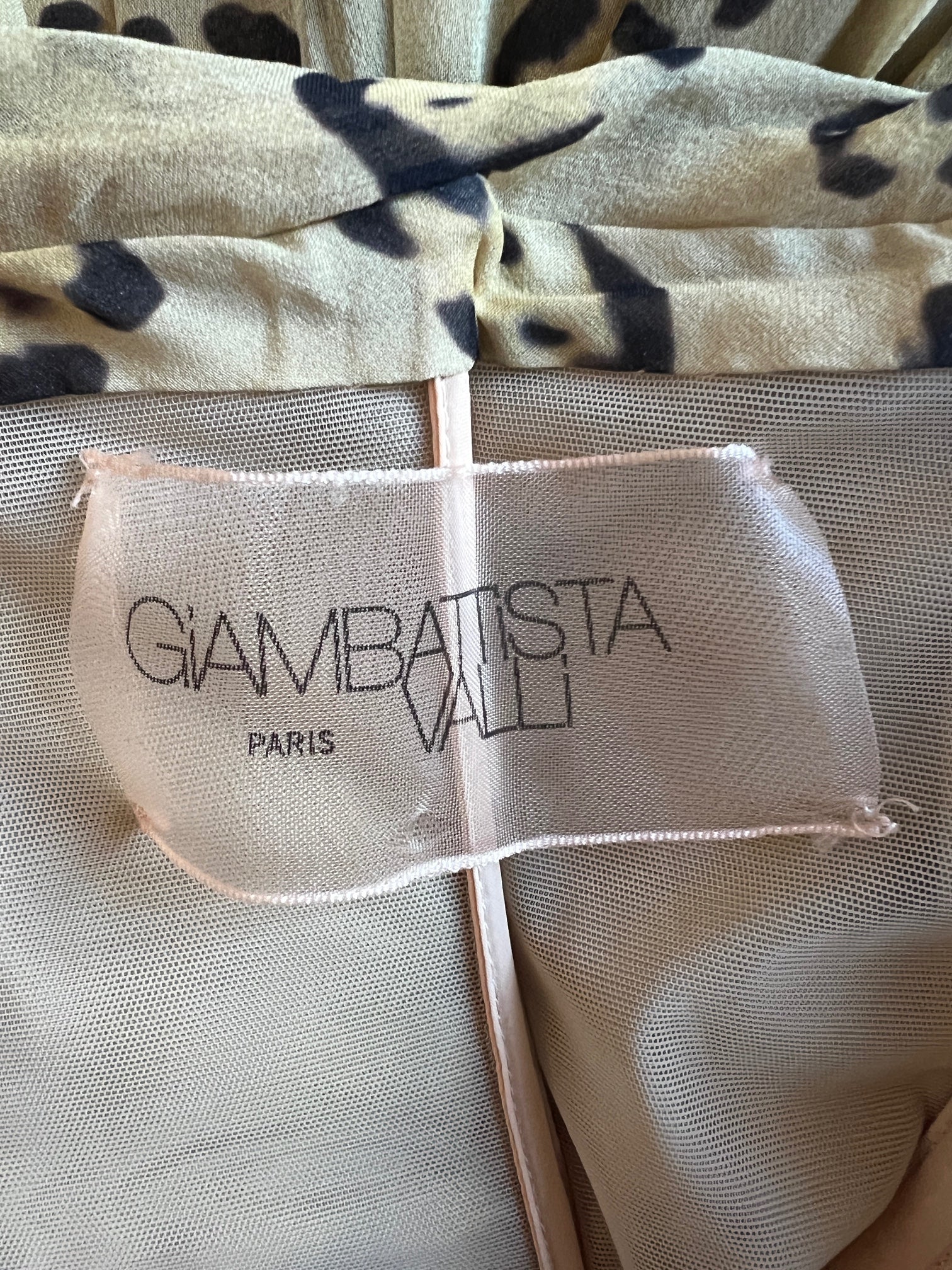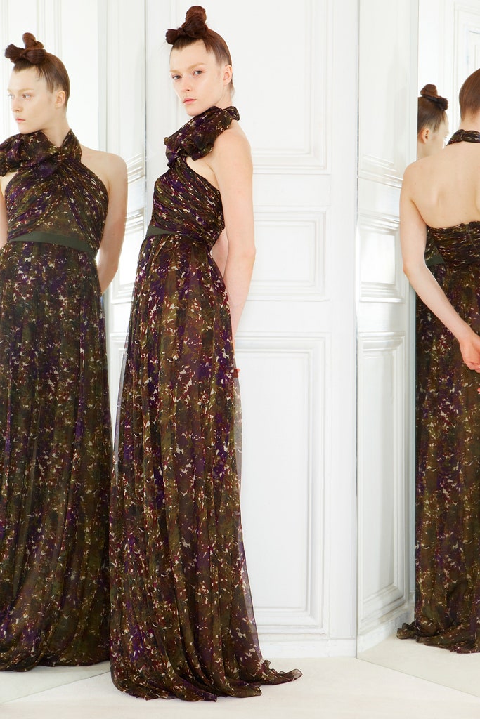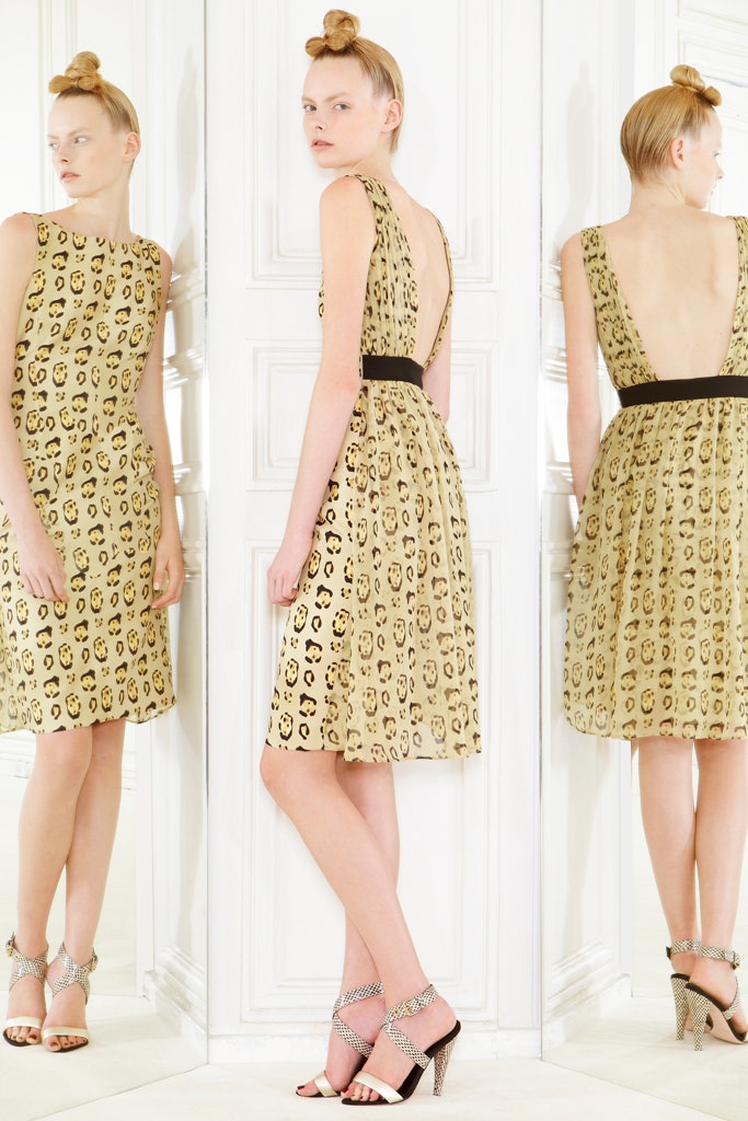This playful leopard print chiffon maxi dress is by Giambattista Valli for his Resort 2013 collection. Leopard print is a recurring motif for the Italian fashion house, and here, it was used to glamorous effect for a range of garments in the collection. We have attached look 10 to show the exact print design but on a different dress and look 42, after the design on which this dress is based, minus the halter neck detail.