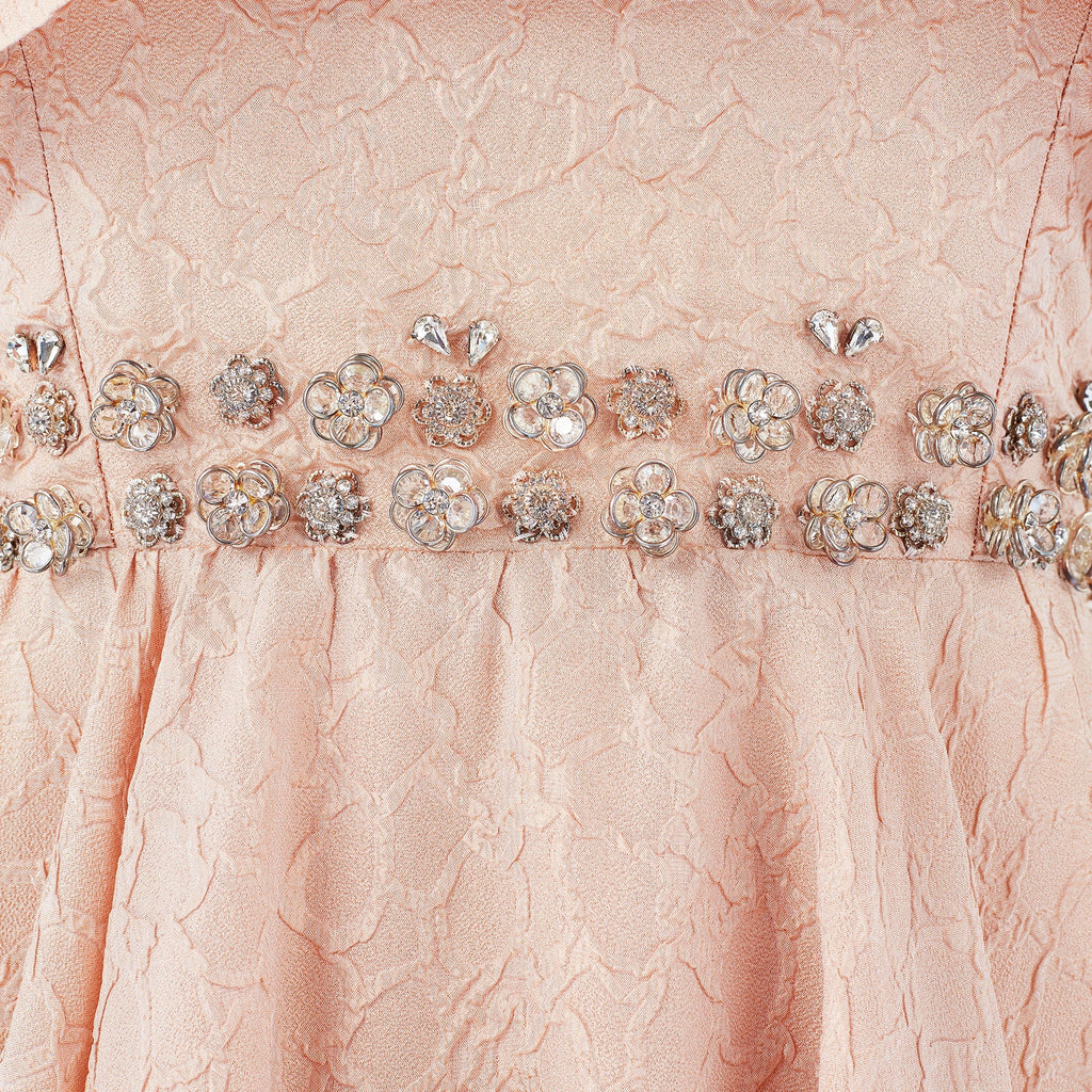 This romantic gown was created by Dutch womenswear designer Michael Van Der Ham and walked the runway as part of the brand’s Spring 2014 ready-to-wear collection. Tailored from silk brocade in the most delicate pale pink - peach hue, it is textured with raised organic shapes which form interlaced circles across the cloth. It is cut to a generous, floaty maxi-length. It has halter-neck straps, as well as two shoulder straps, all cut from the same cloth. The halter secures at the back of the neck with a large silver-toned metal hook-and-eye clasp. There is a cropped top that sits over the rest of the dress. The waist of the dress is cinched and embellished with flowers and leaves formed from rhinestones, glass and silver-toned beads and tiny silver-toned rings. Below the waist, the skirt is softly pleated and then falls straight to the floor. The skirt is lined with pale peach matte silk. The top is backed with white cotton. The dress fastens under the left arm with a hidden tonal zip and four large hidden plastic snap closures.
