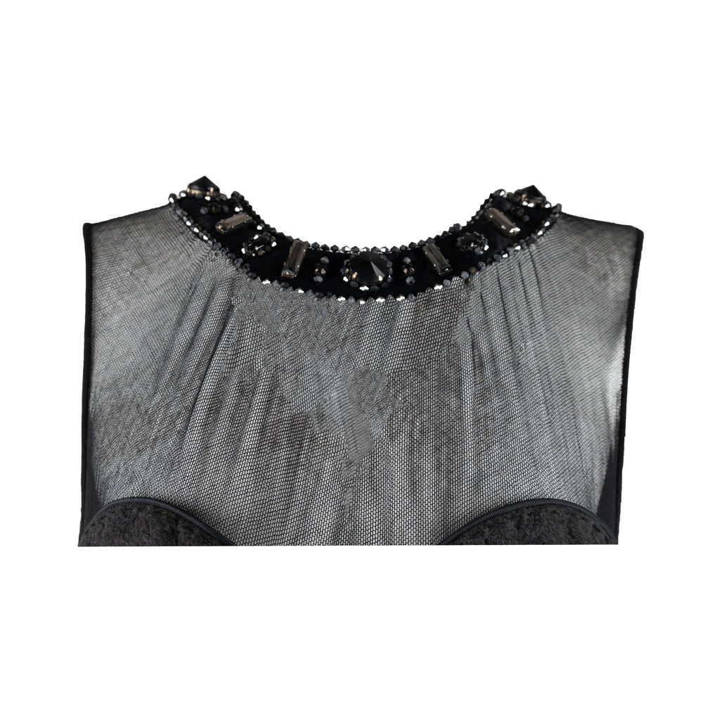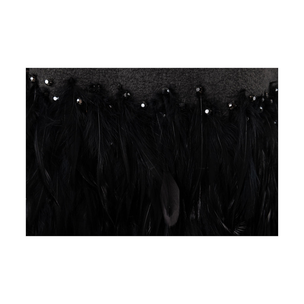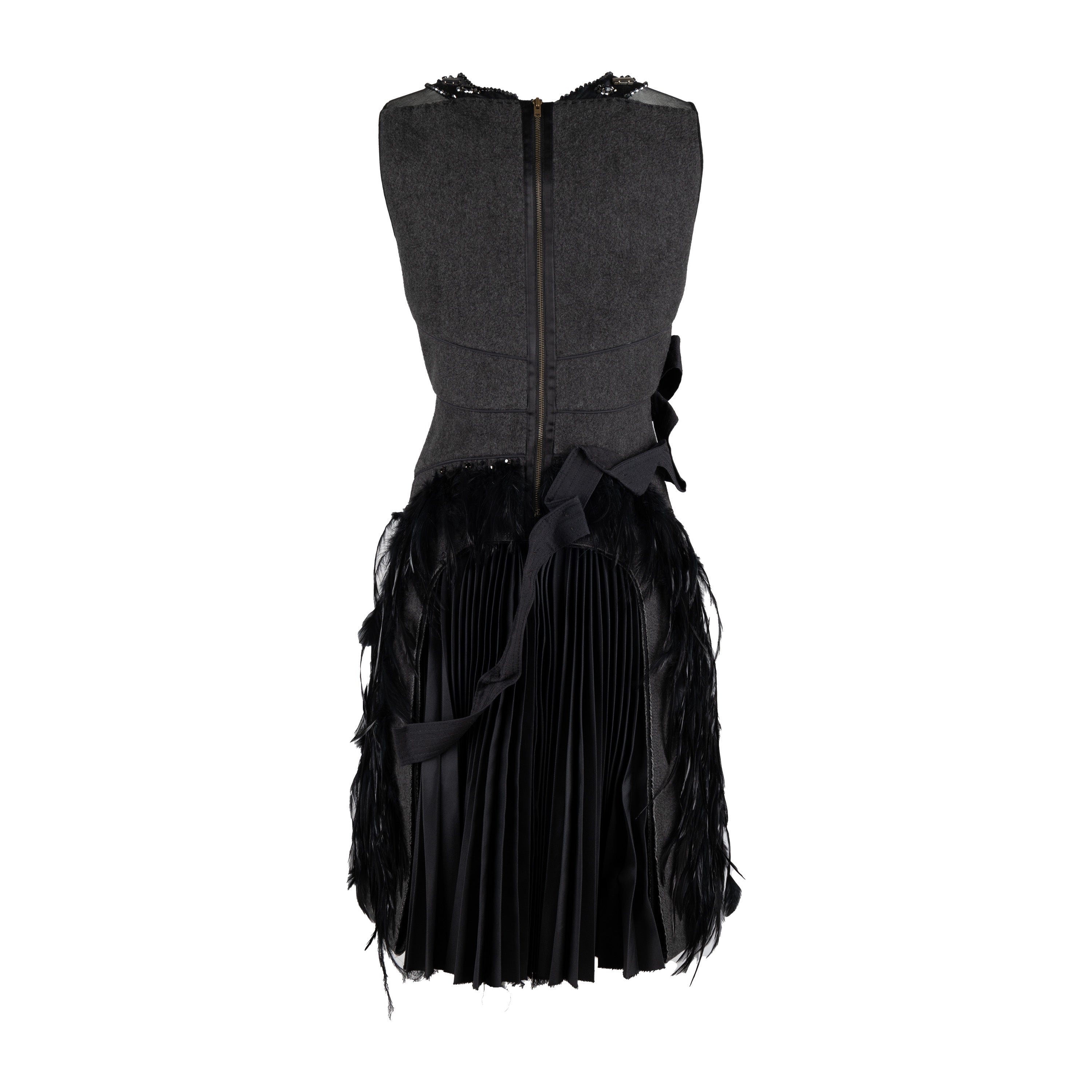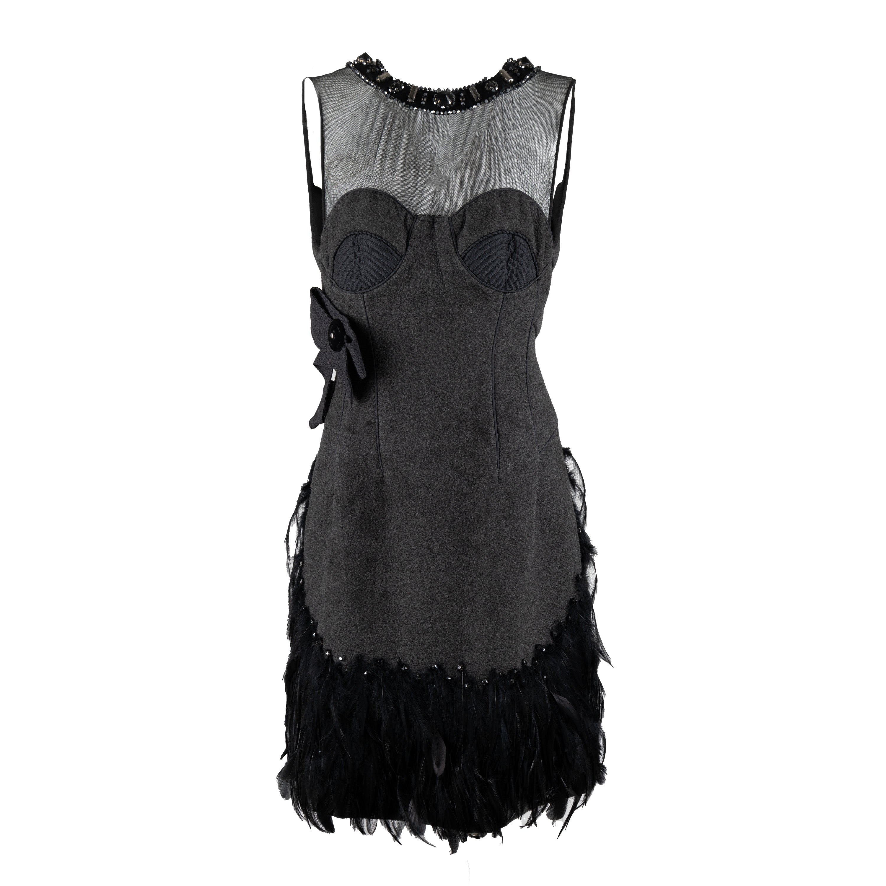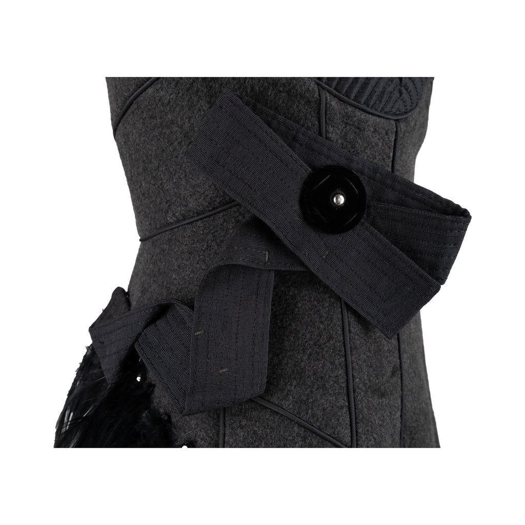 This 6267 Compact Wool Dress in a grey hue is crafted from a wool blend and adorned with iridescent beads, rhinestones, and exotic feather embellishment. The round neck is highlighted with beaded details and the fitted silhouette flows to a hem with feather accents, and the back is defined by unique pleats and feather. An exquisite designer piece from the Fall Winter 2007 collection.