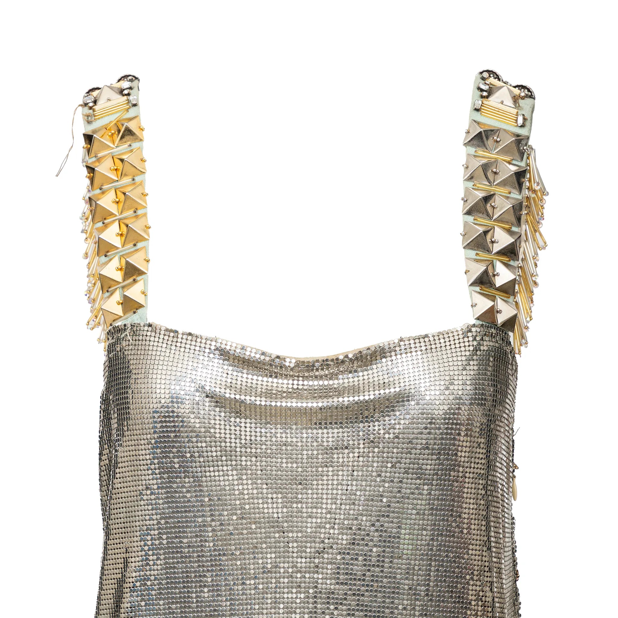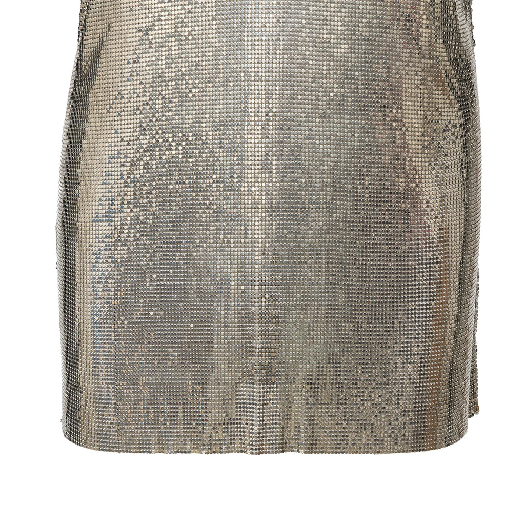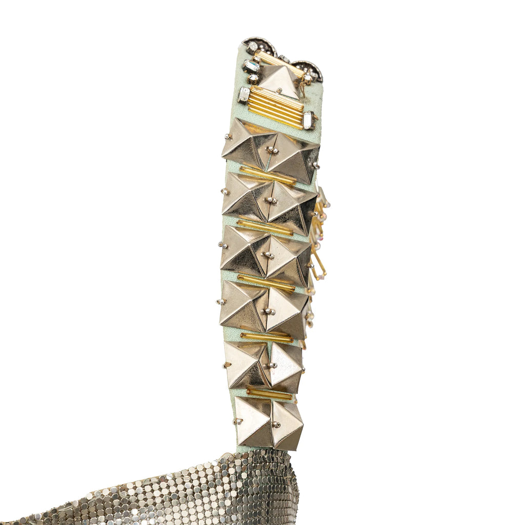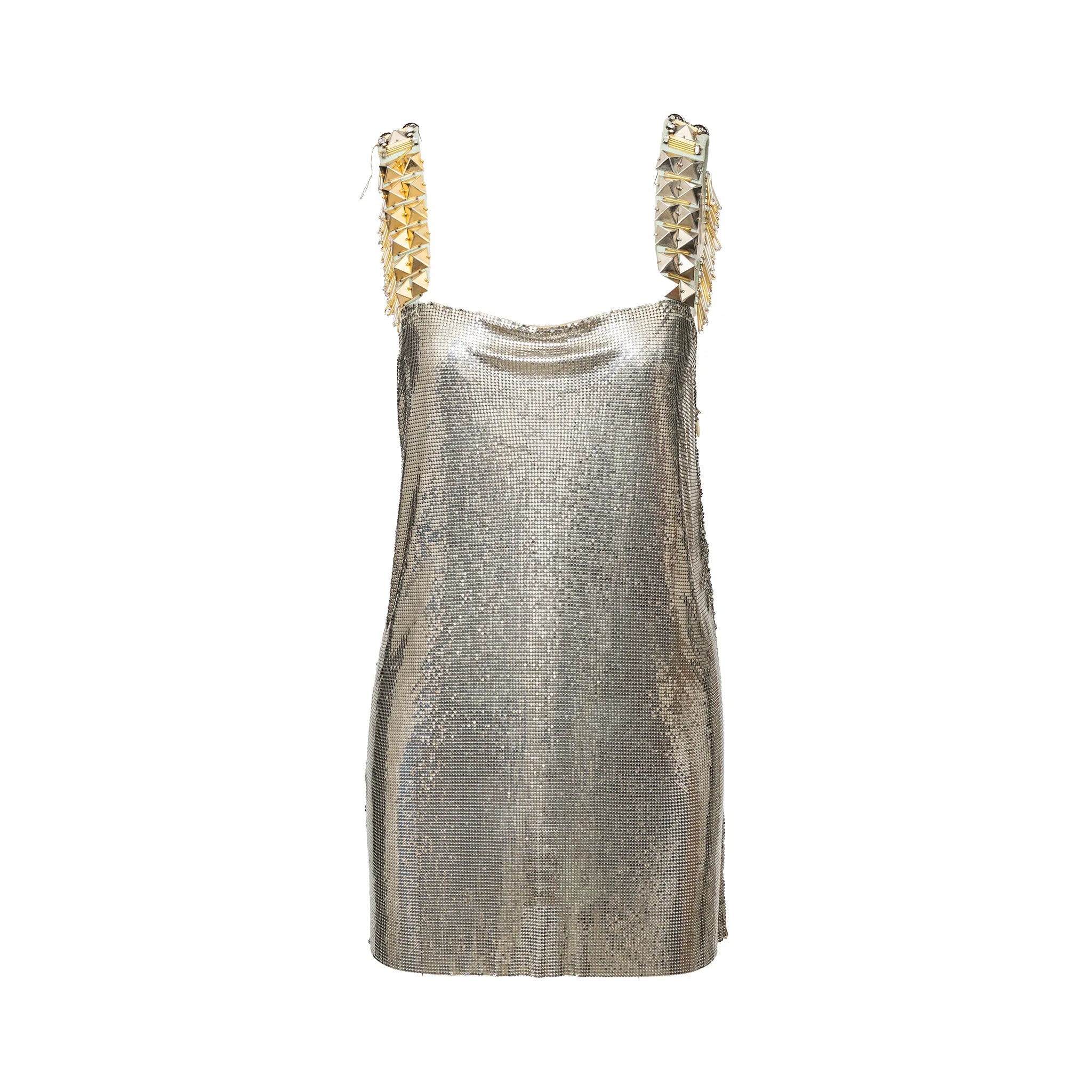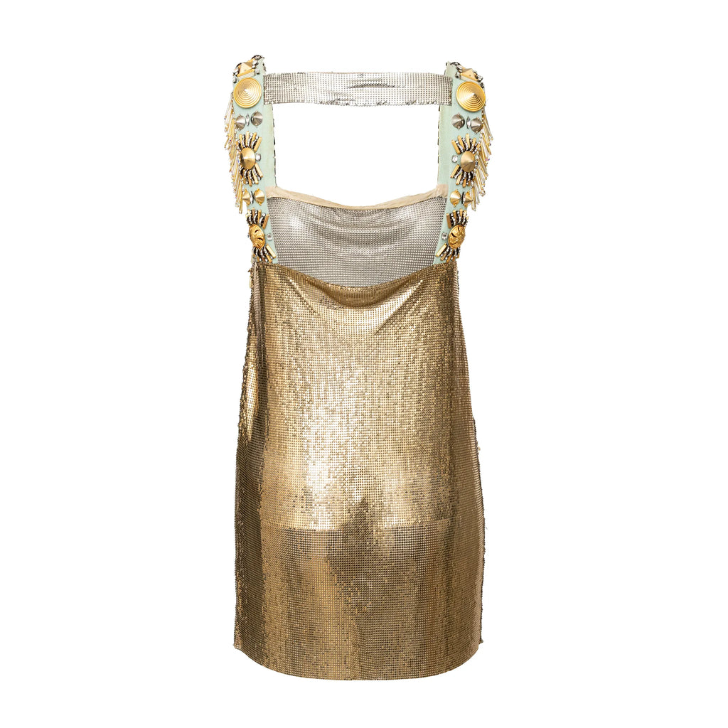 Fausto Puglisi metallic dress with silver and golden metal bead embellishments. Stud and bead detailing on sleeve straps for a sculptural effect.