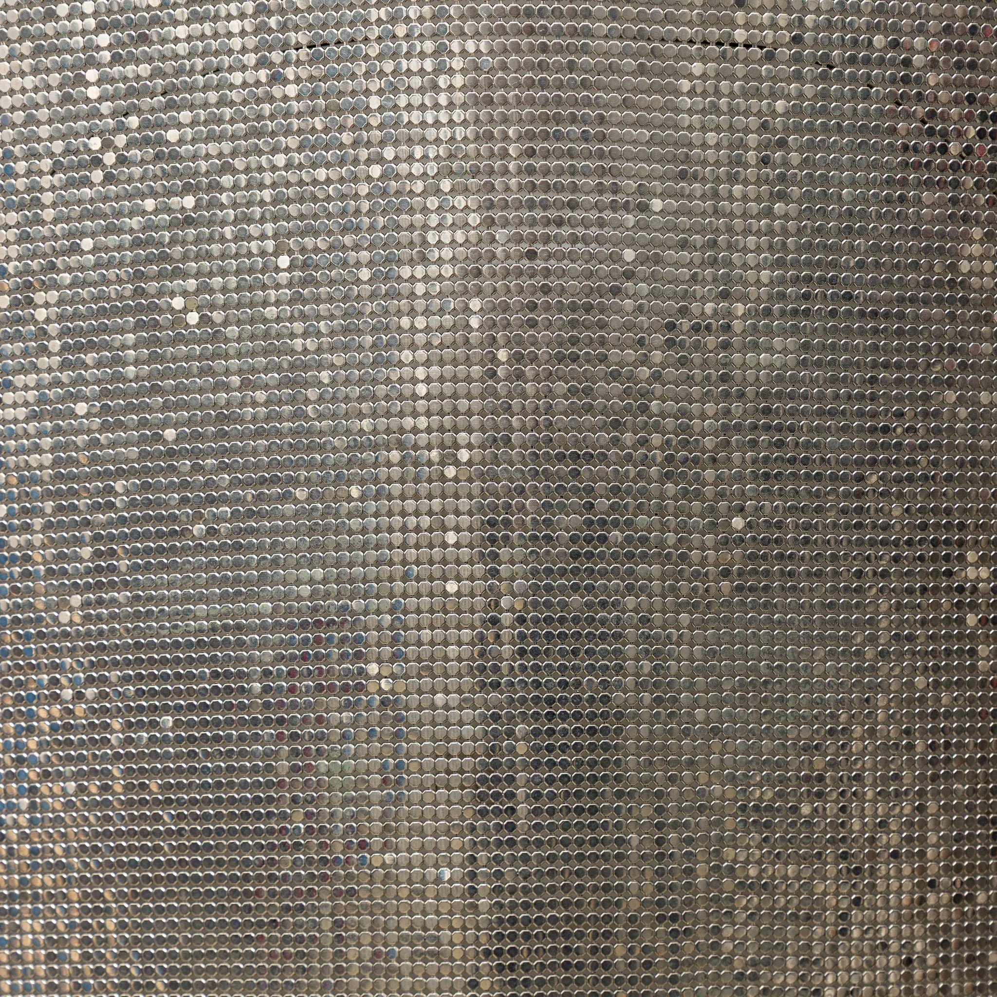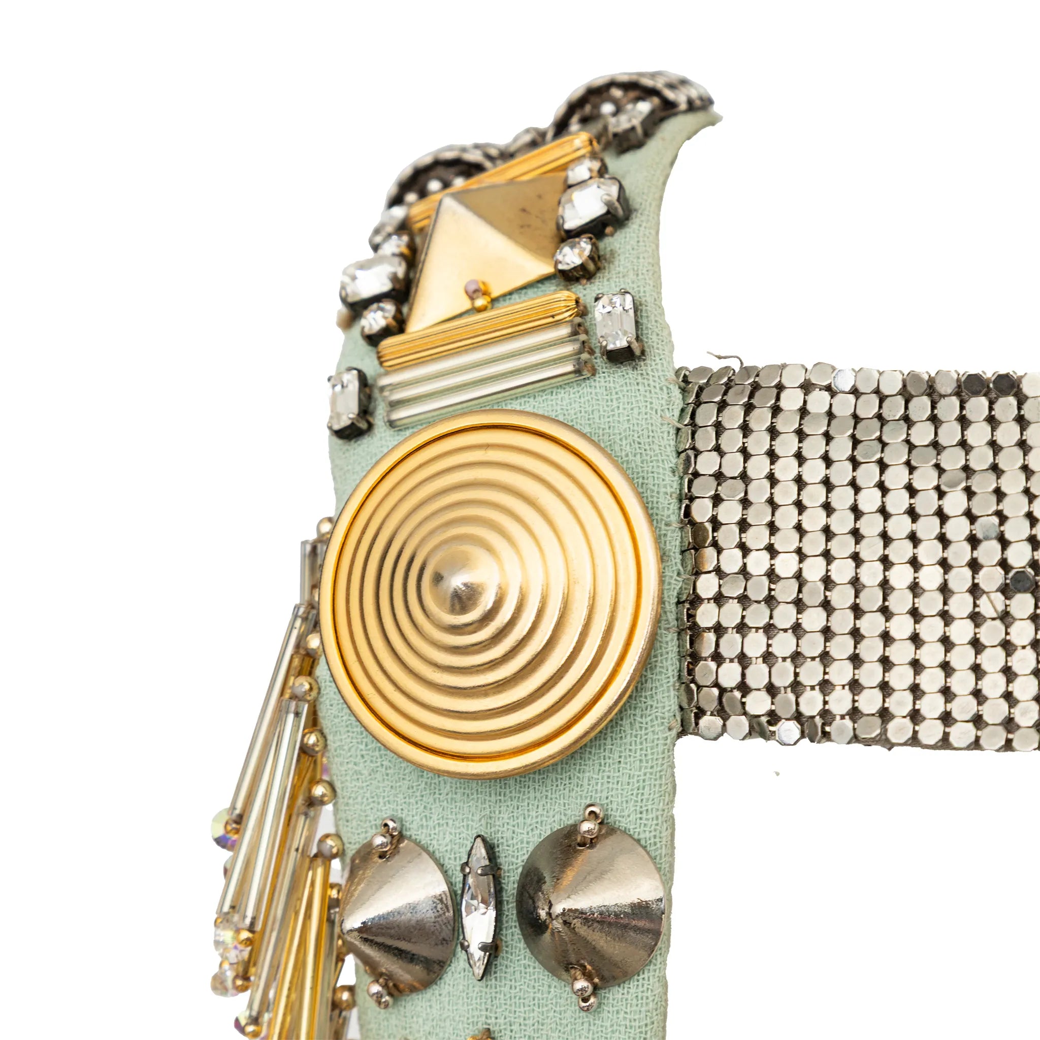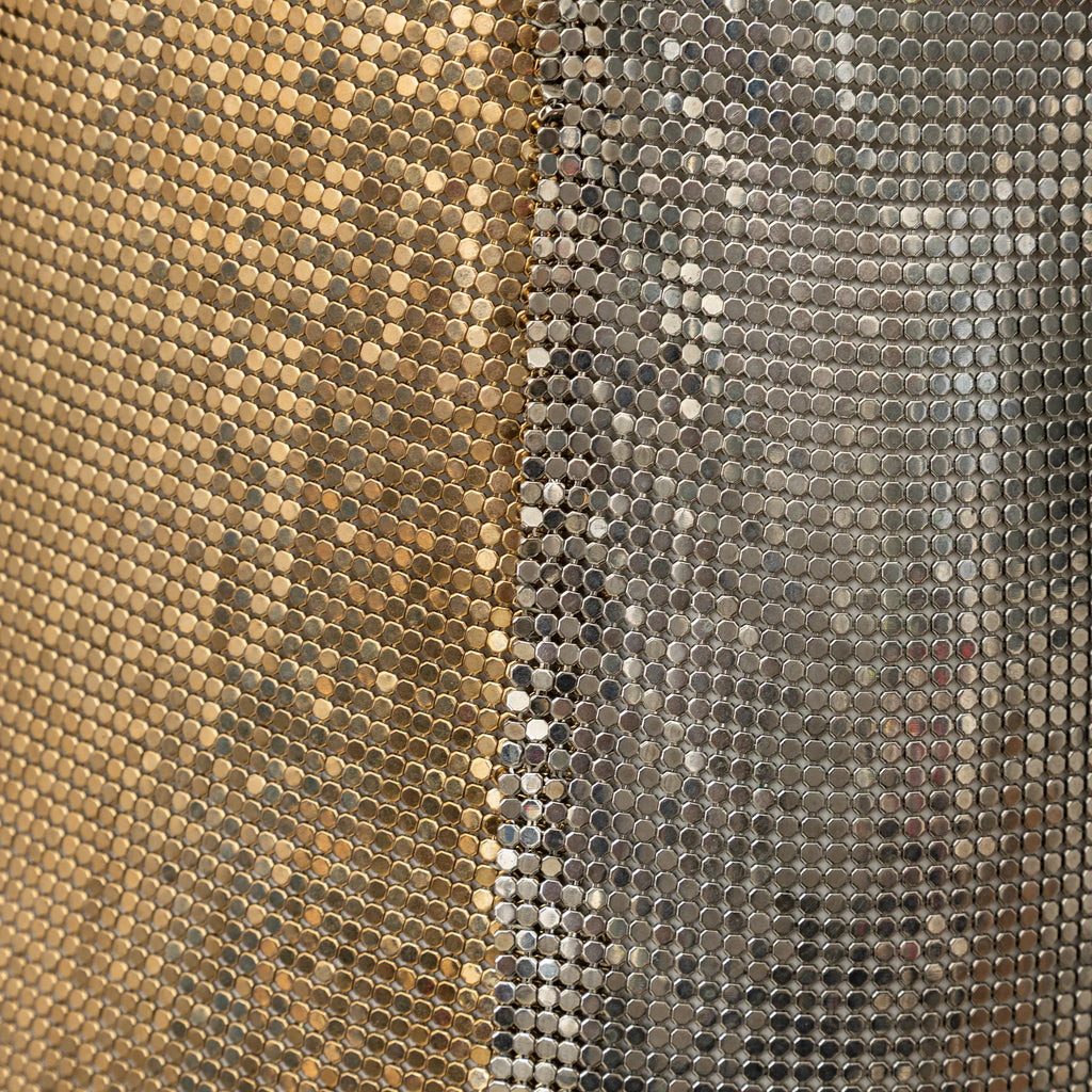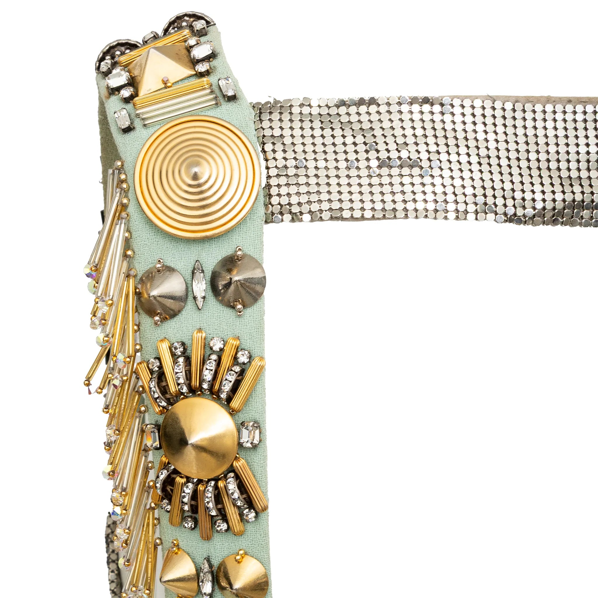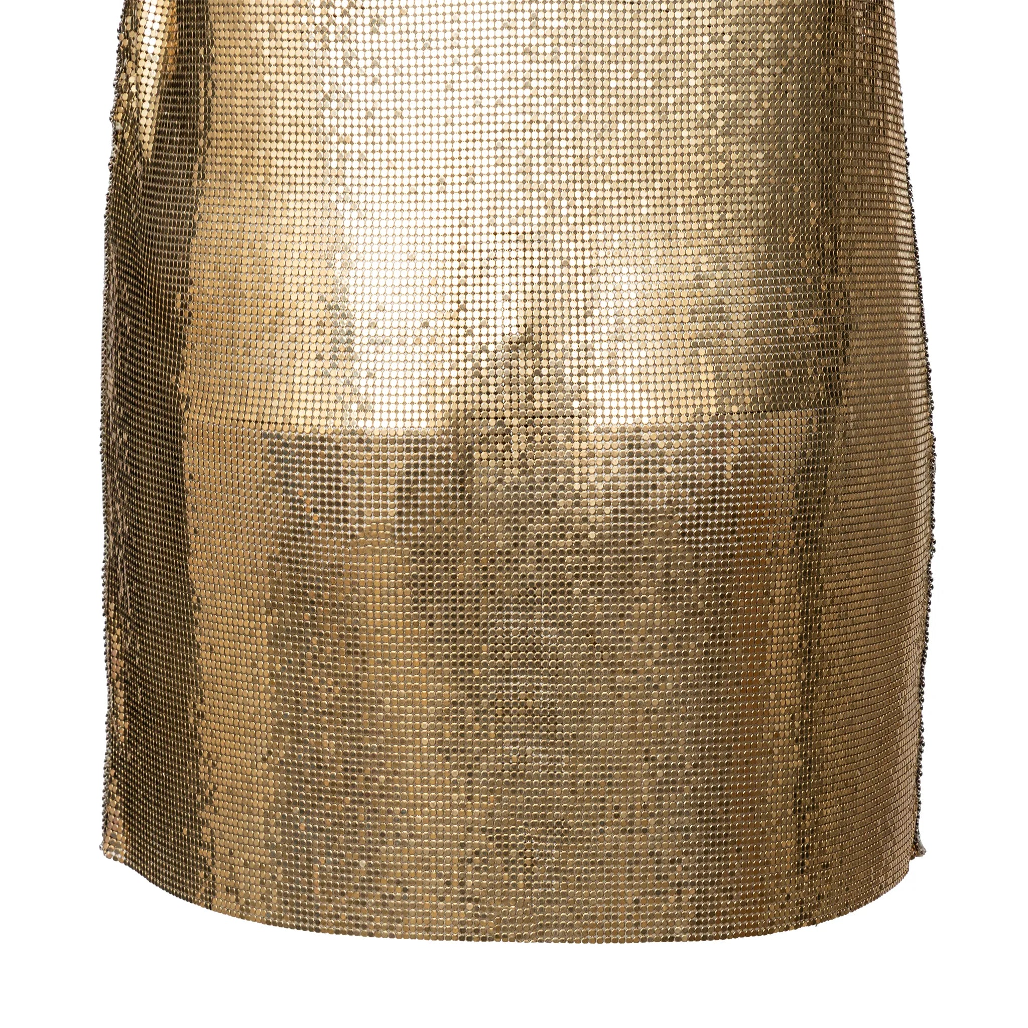 Fausto Puglisi metallic dress with silver and golden metal bead embellishments. Stud and bead detailing on sleeve straps for a sculptural effect.