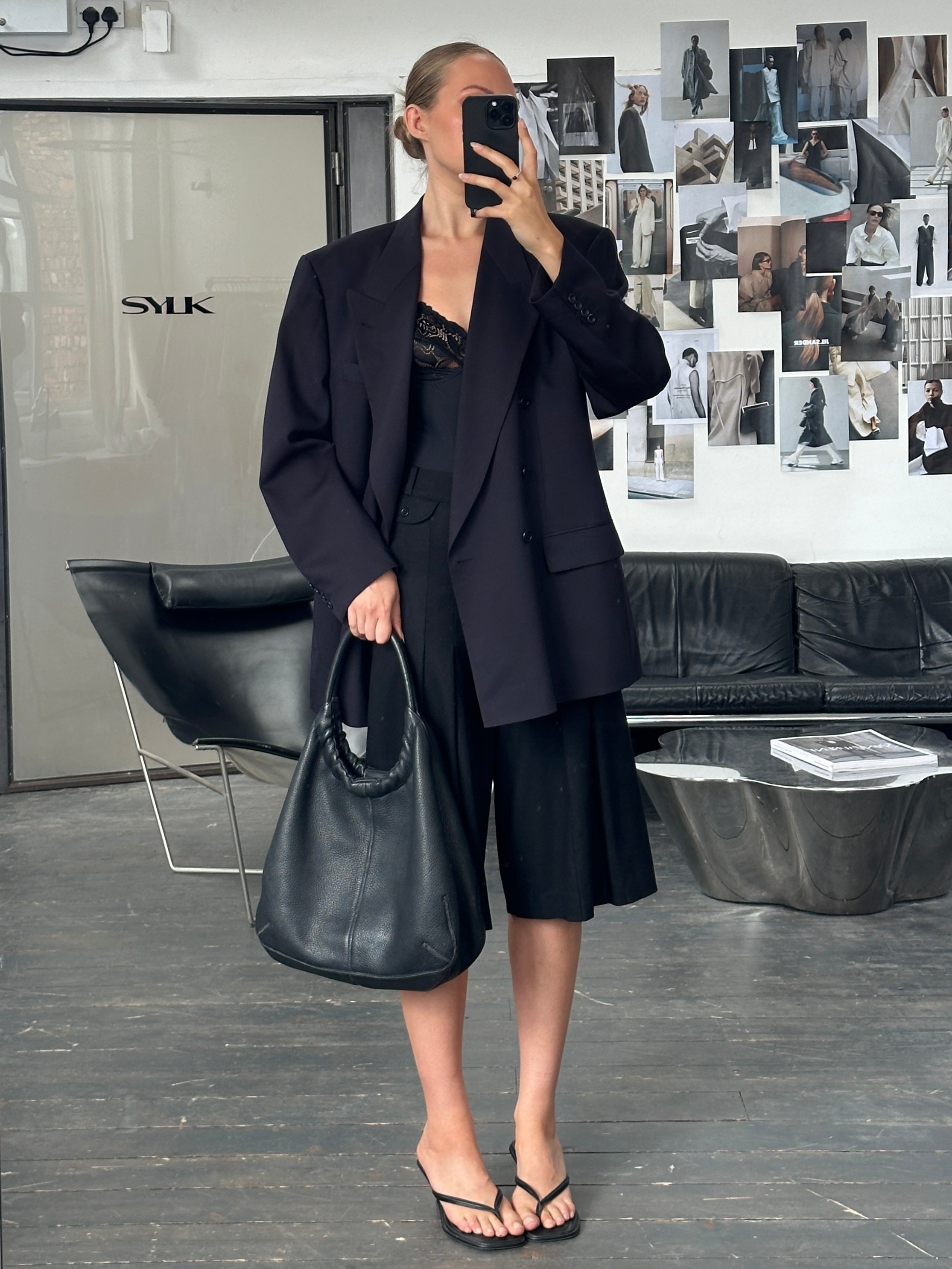 A sharply tailored Hugo Boss double-breasted blazer, crafted in Germany from pure Super 100s virgin wool. Cut with bold peak lapels, a structured shoulder and a longline silhouette.