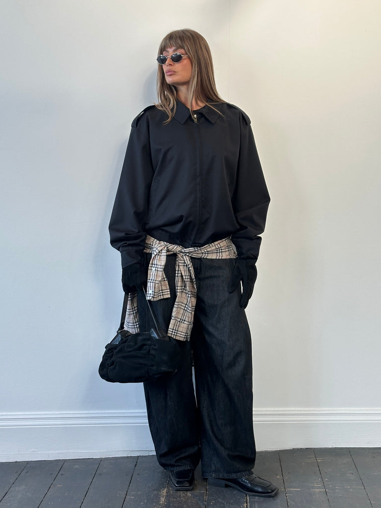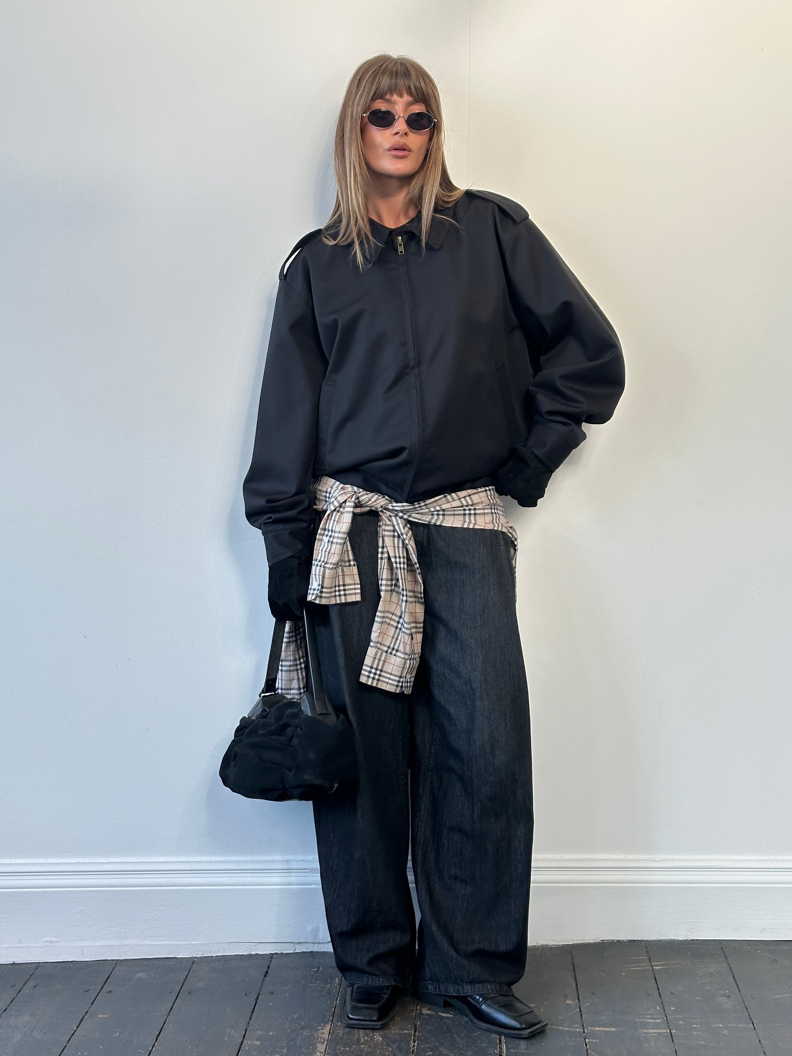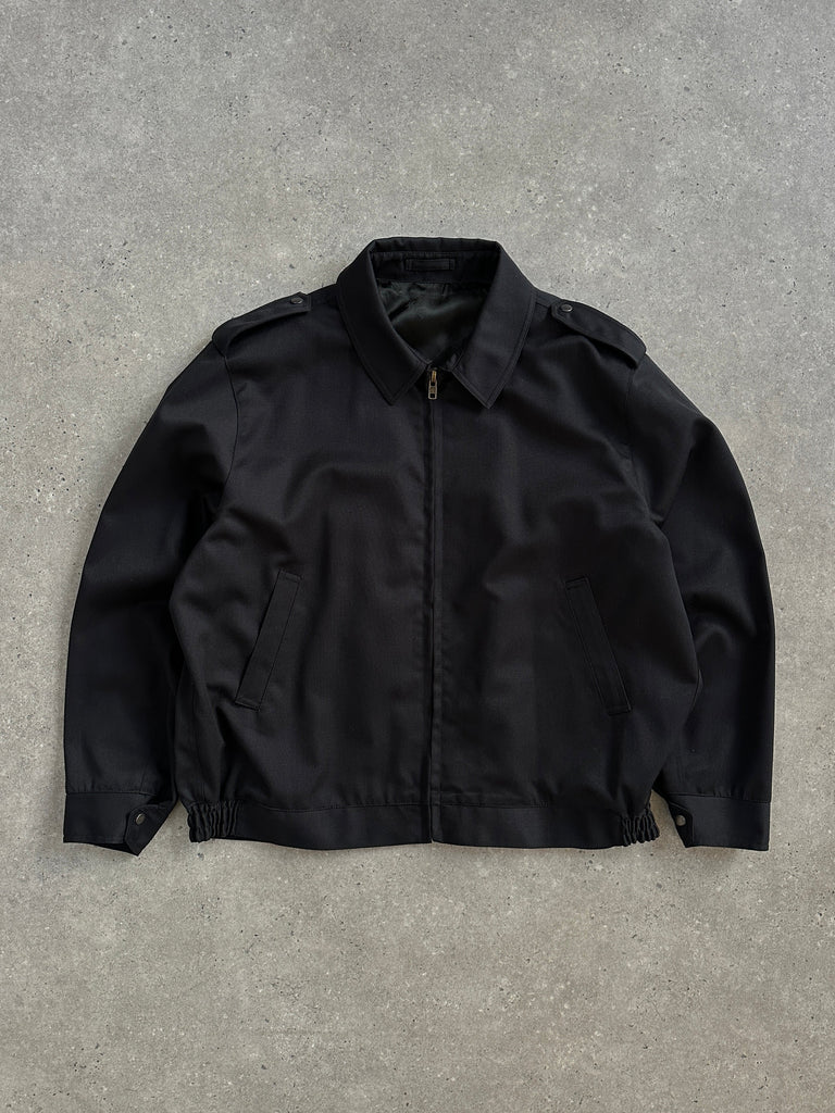 Vintage 2000s structured black wool bomber jacket featuring shoulder epaulettes, elasticated hem panels and a clean zip front. Finished in a deep black tone with a smooth lining marked Esercito Italiano, giving it a refined Italian vintage military feel.