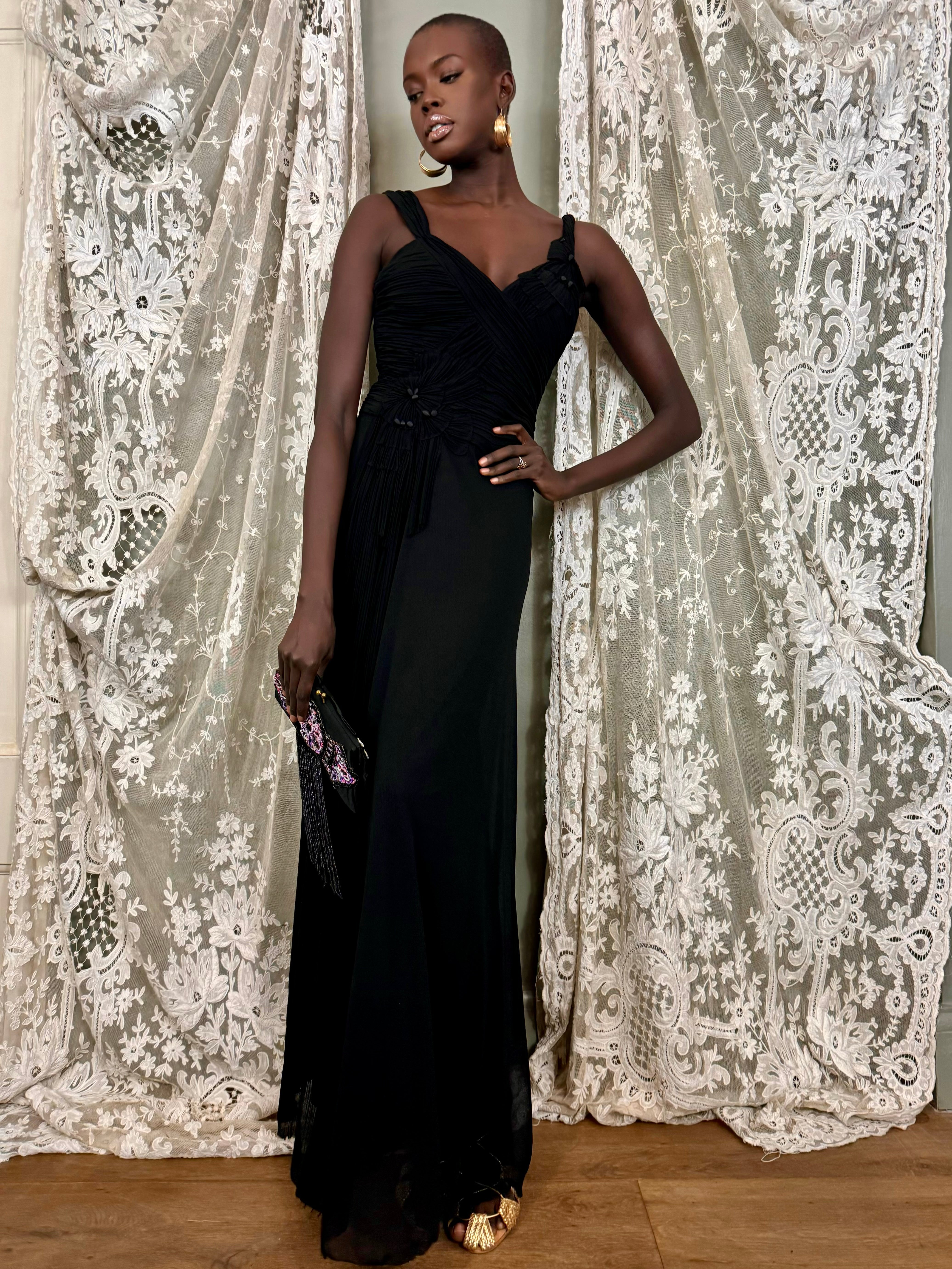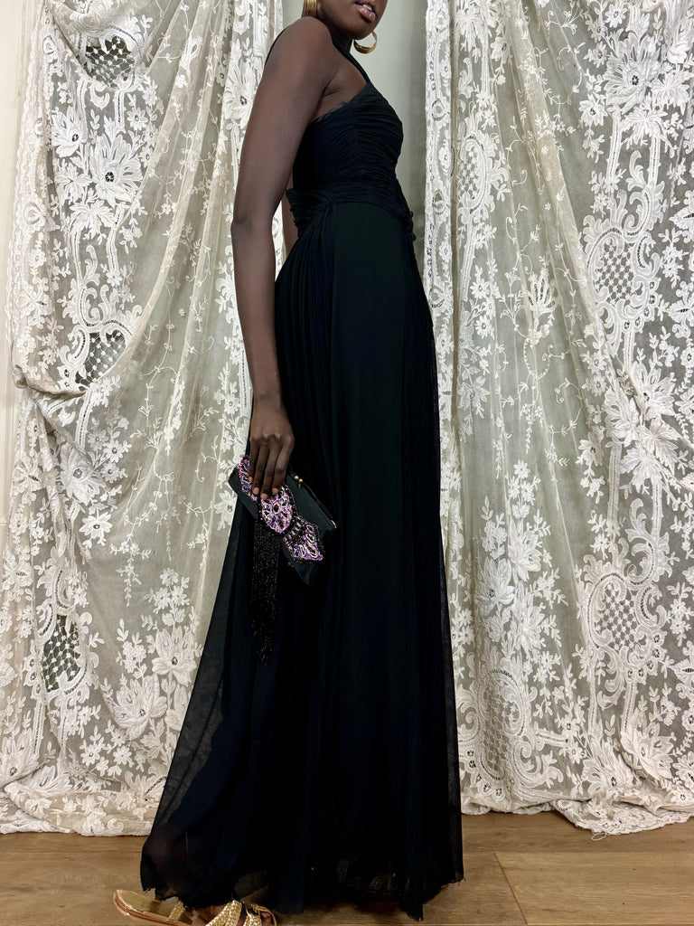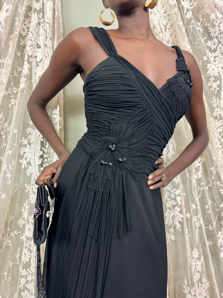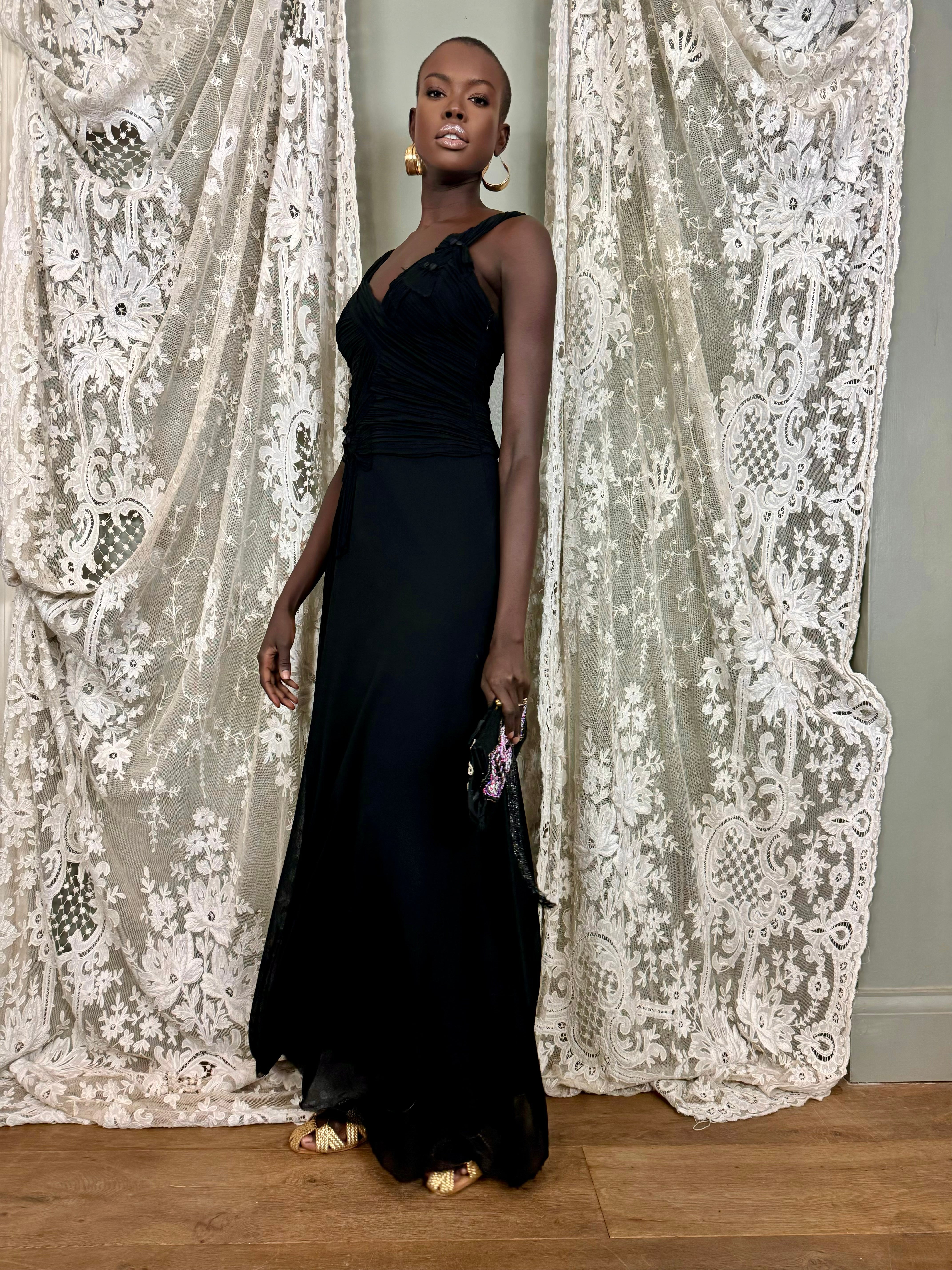 This Y2K black silk mesh pleated long dress is the perfect blend of elegance and modern style. With a stunning sleeveless design, pleated bust and a delicate rosette detail, this dress is versatile and flattering. The back zip and lining provide both comfort and a flawless fit, making it a must-have for any special occasion.