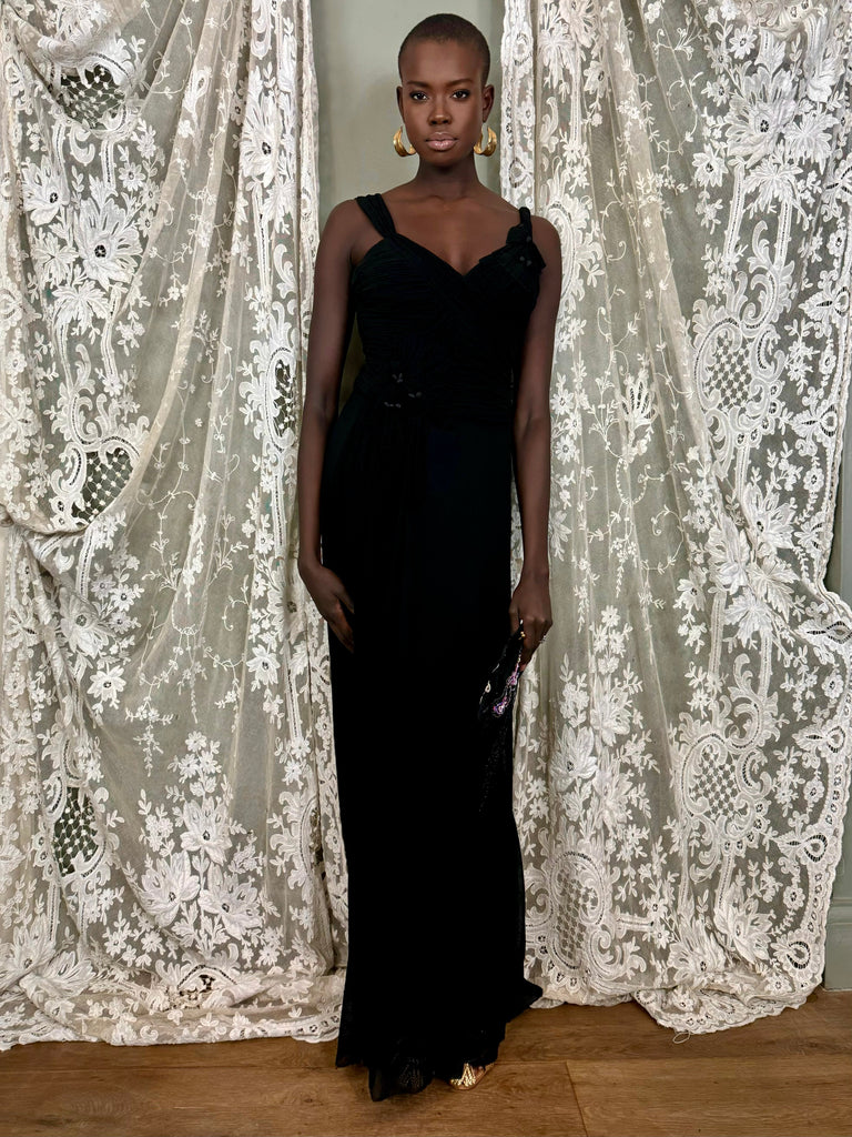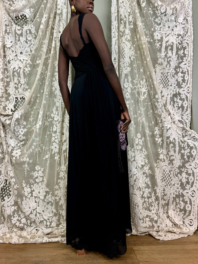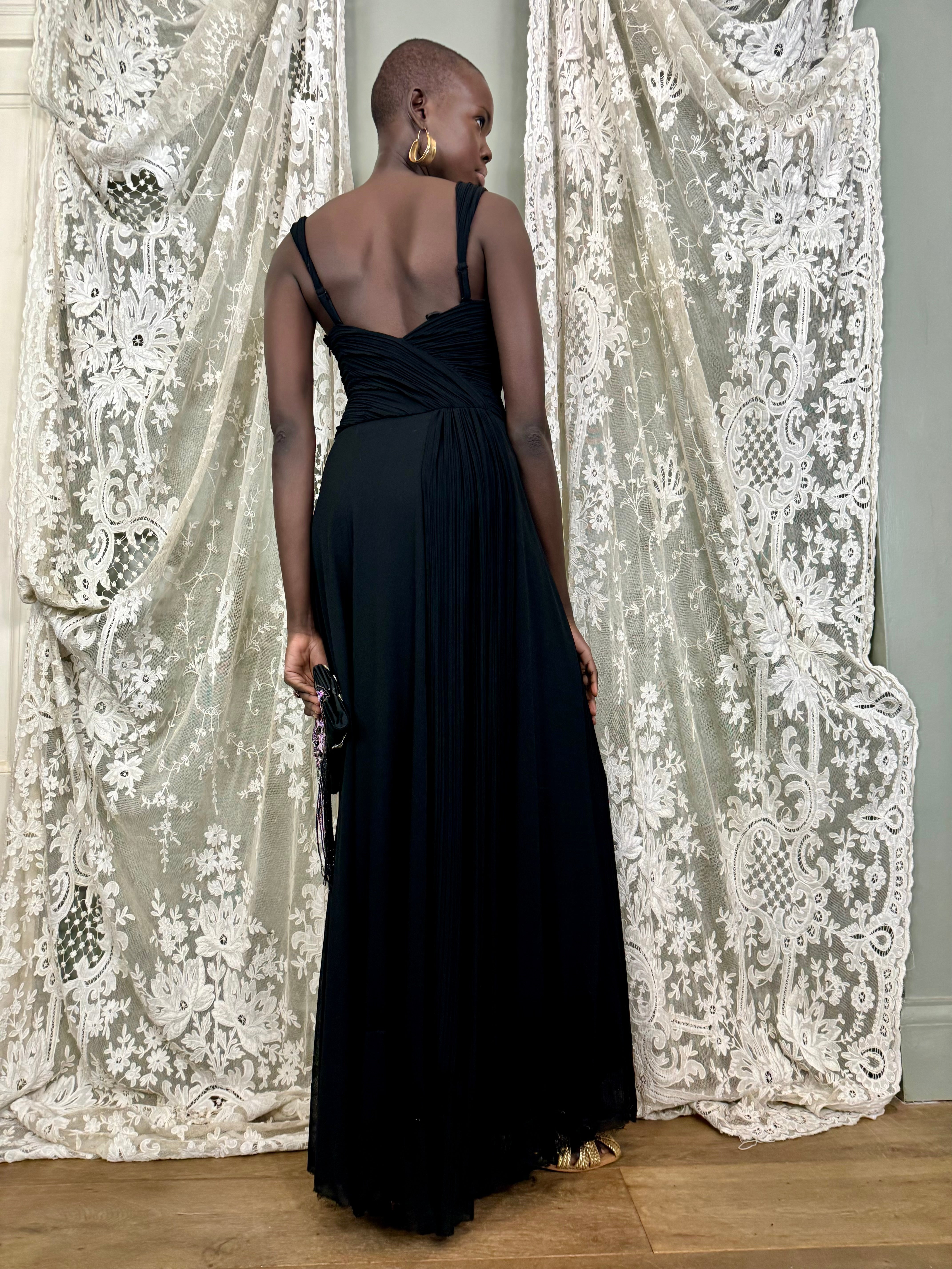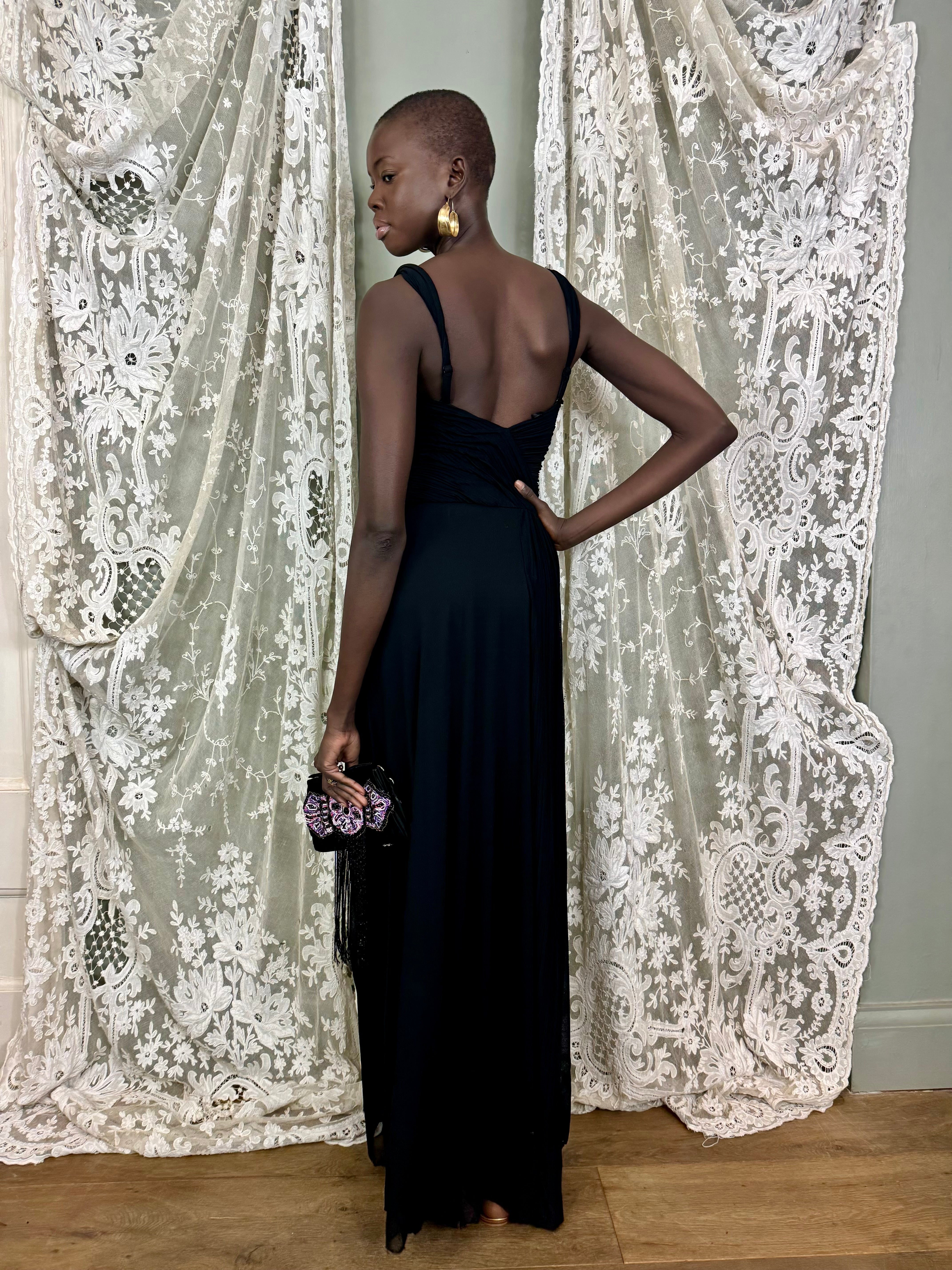 This Y2K black silk mesh pleated long dress is the perfect blend of elegance and modern style. With a stunning sleeveless design, pleated bust and a delicate rosette detail, this dress is versatile and flattering. The back zip and lining provide both comfort and a flawless fit, making it a must-have for any special occasion.